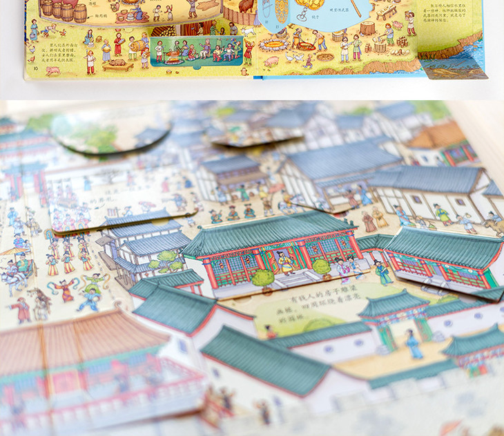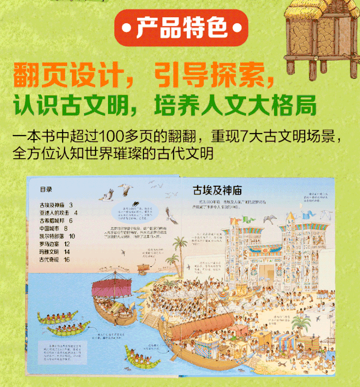 尤斯伯恩看里面的翻页、折页设计,打破了静态的图书呈现模式,让小读者在阅读中能够保持新鲜感和不断探索的兴趣,复杂的内容、深刻的内容也不再那么枯燥,而且使得书页上直观呈现的内容和翻页下的内容形成一种对比、反差,因此事物变化的时间感、历史感、变迁感也变得清晰起来,阅读也不再是一味沉浸在平面的状态里。