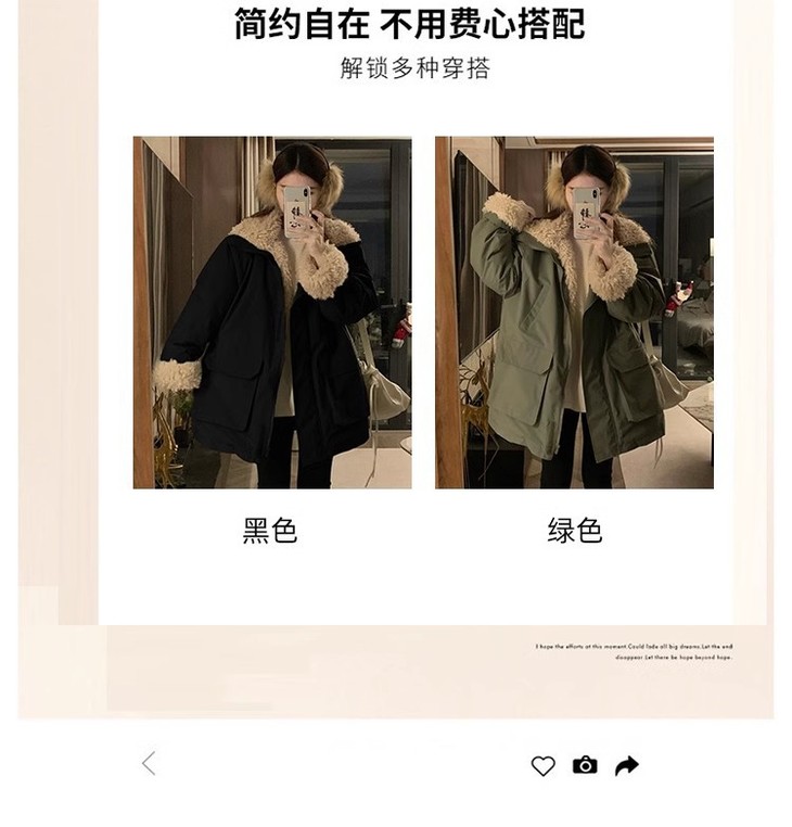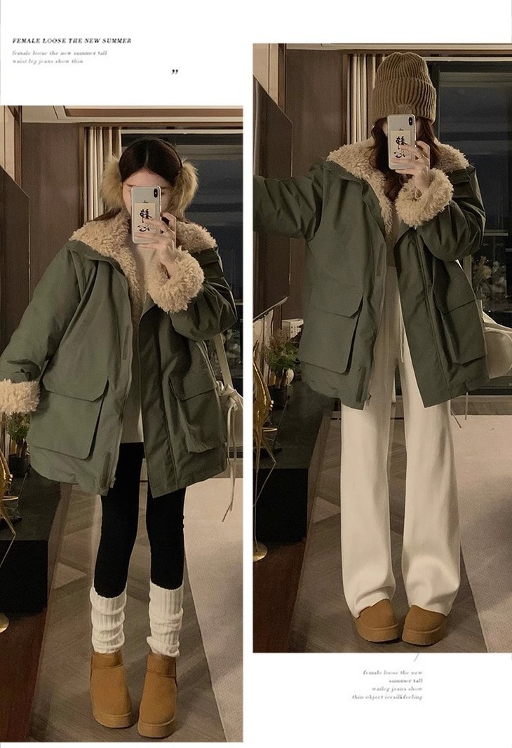 赵露思同款派克服冲锋衣女中长款羊羔绒加绒加厚拼接棉服外套