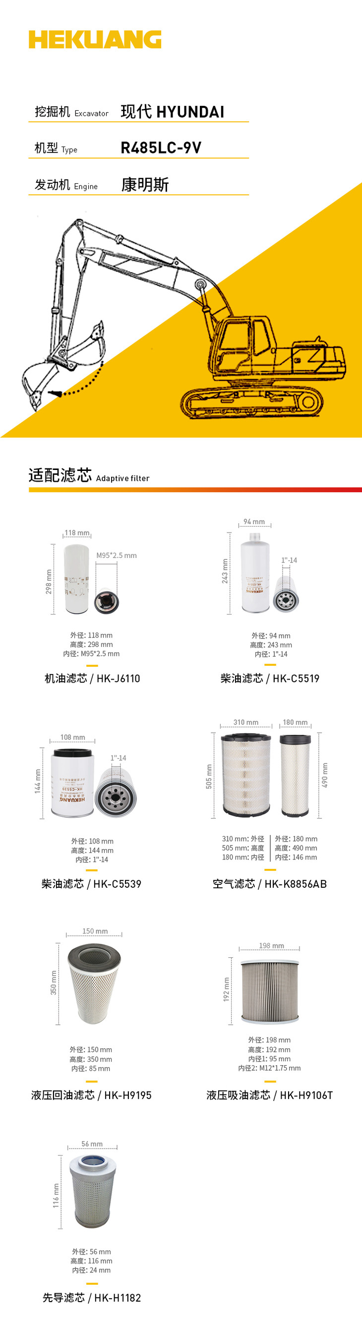 现代R485LC-9V(康明斯)挖掘机滤芯 机油柴油空气滤芯 液压油先导滤芯