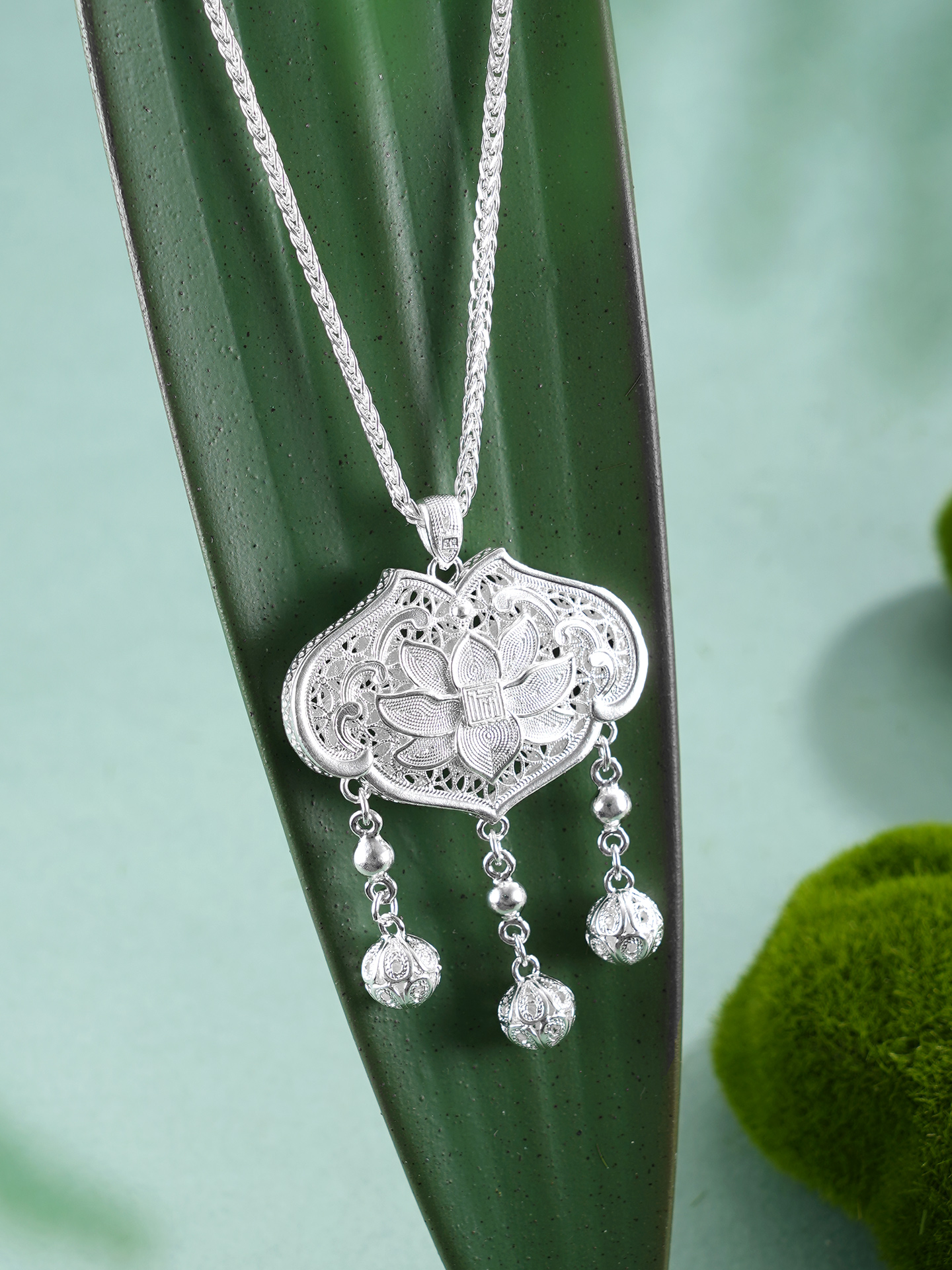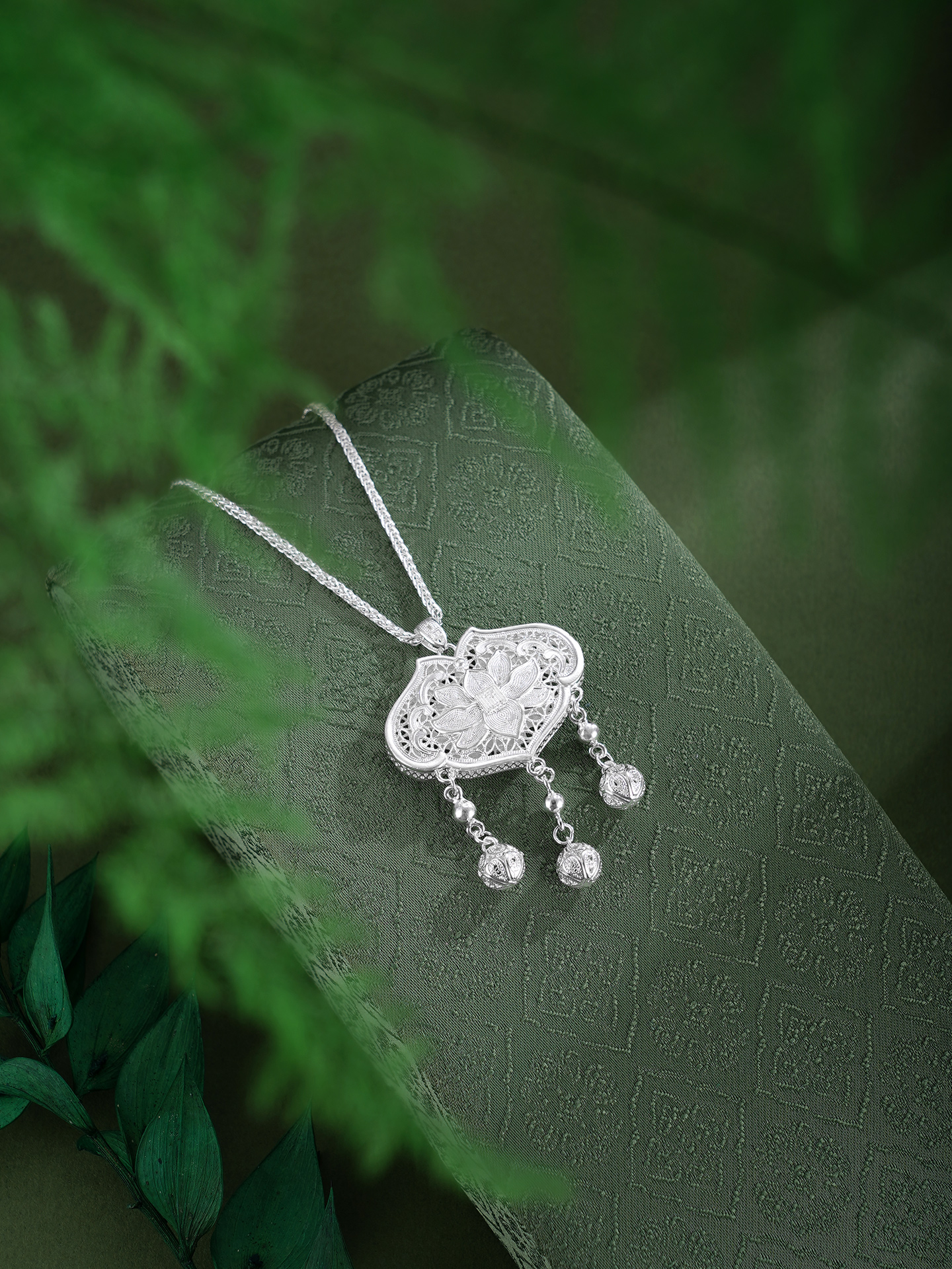 【寓意】:一款以旗袍为灵感设计的花丝吊坠,银丝勾勒曼妙“身姿”,莲花纹样巧饰其间,不仅展现了东方女性的温婉与雅致,更将“坚贞不渝、真挚幸福”的美好寓意蕴含其中。