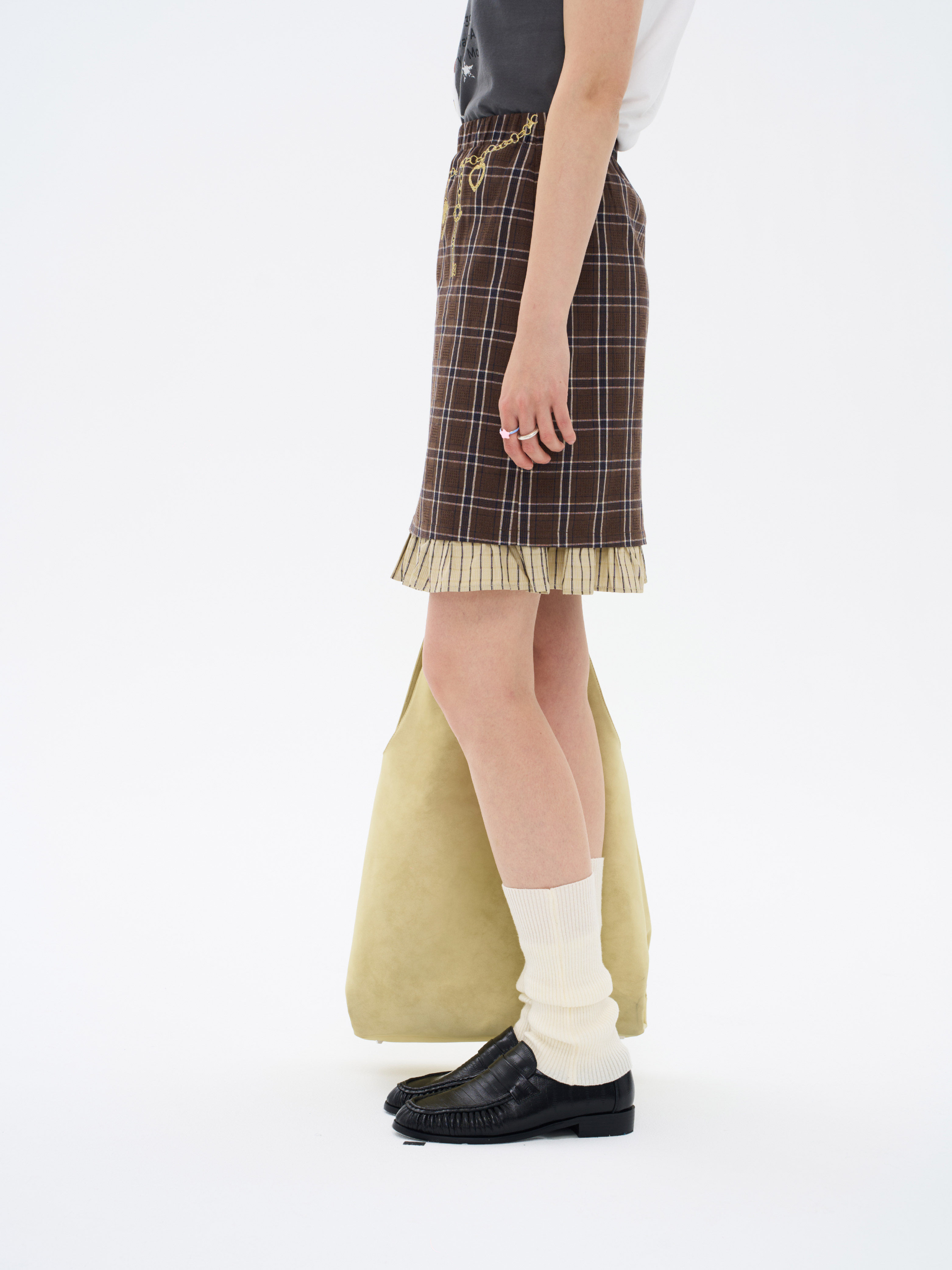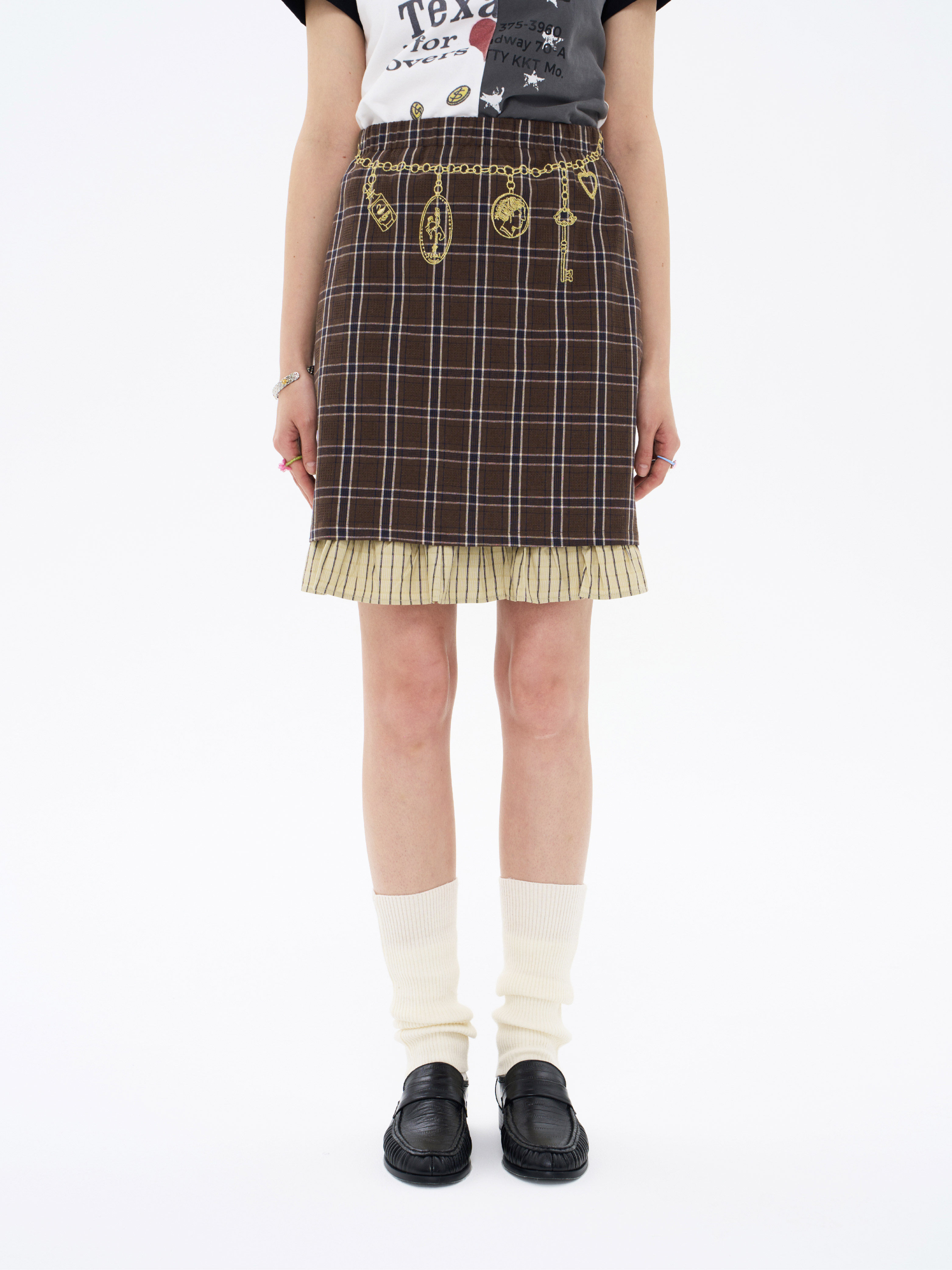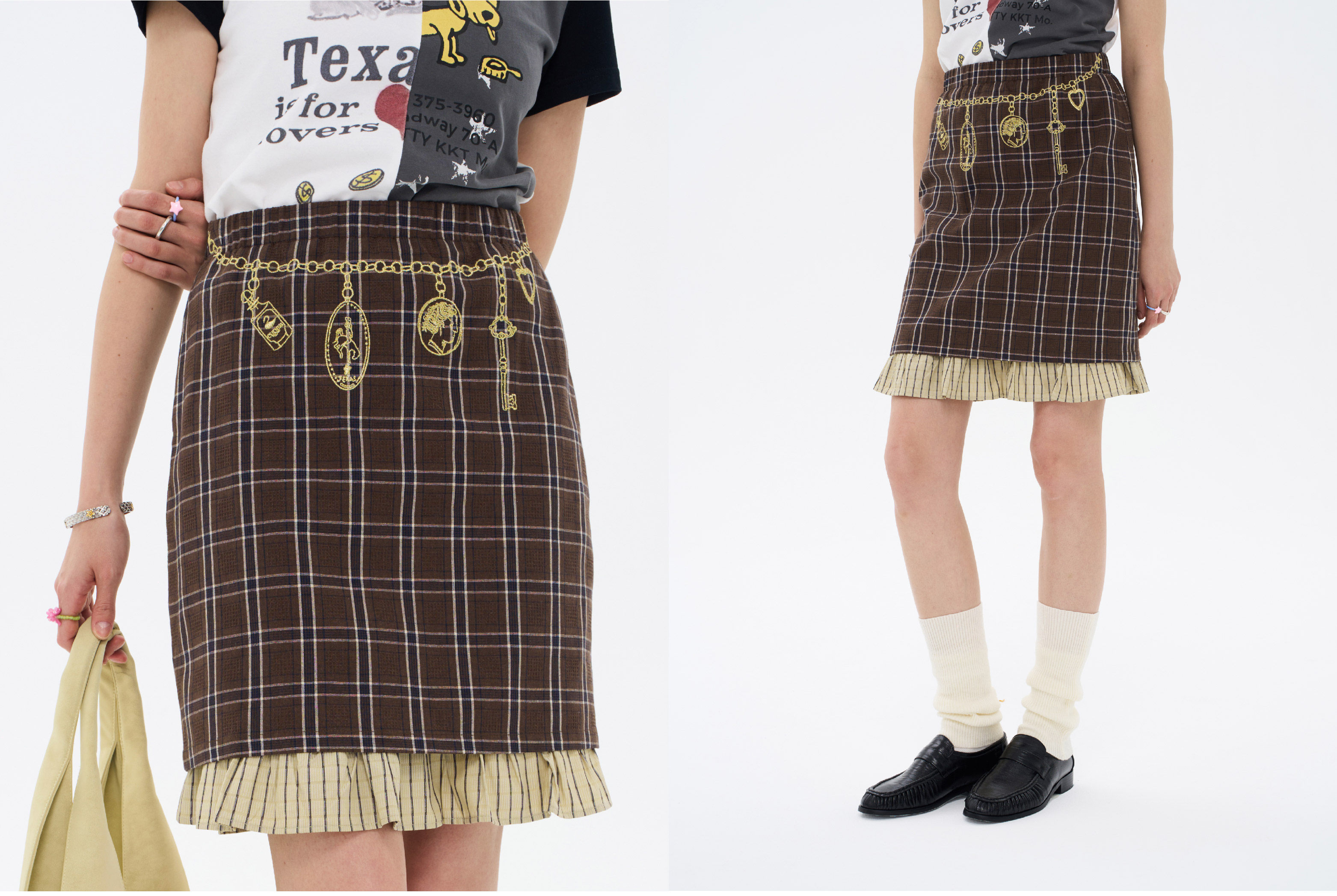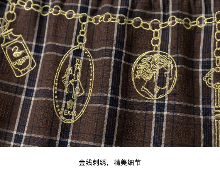 local tag/lt26ssk16/金色腰链 刺绣花边半裙 松紧腰格子拼接短裙