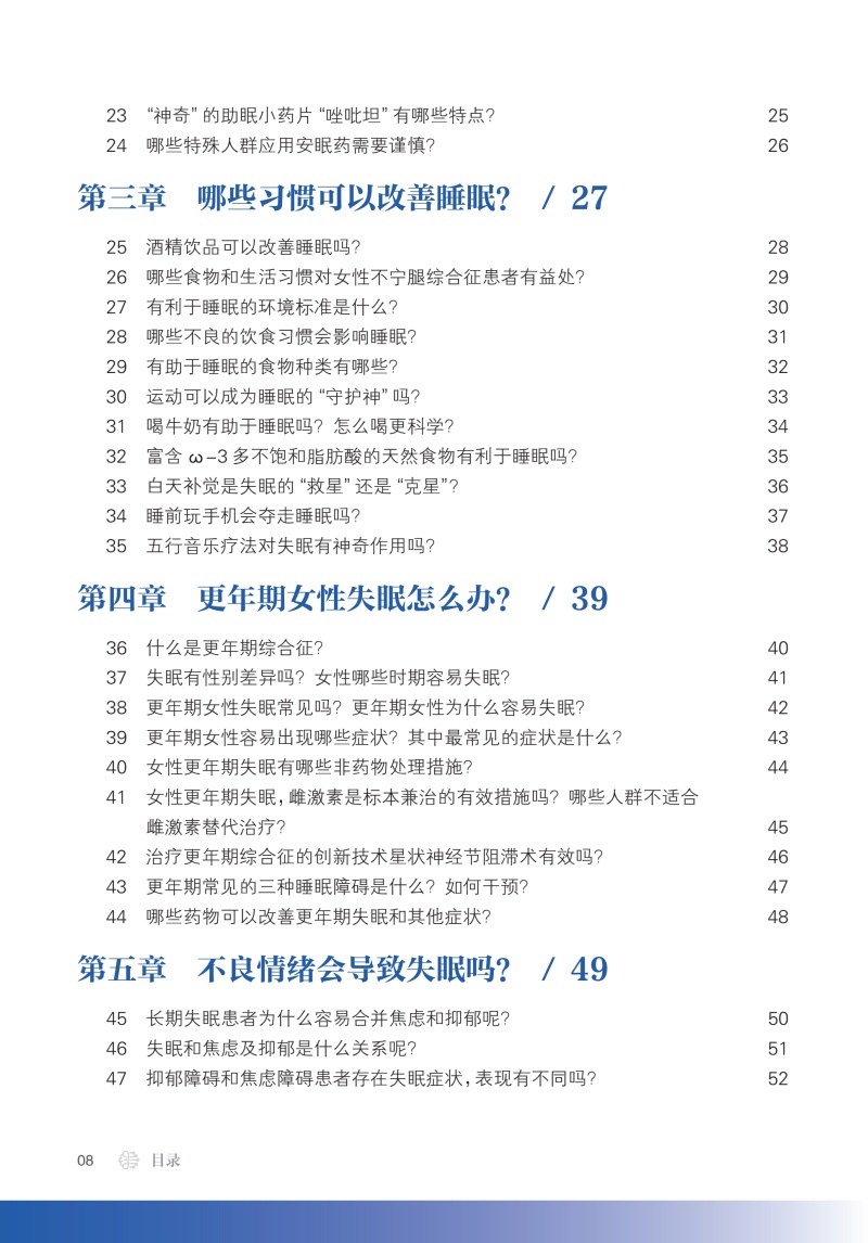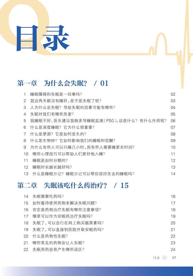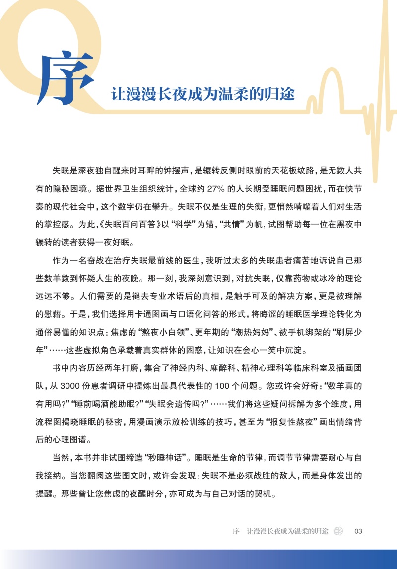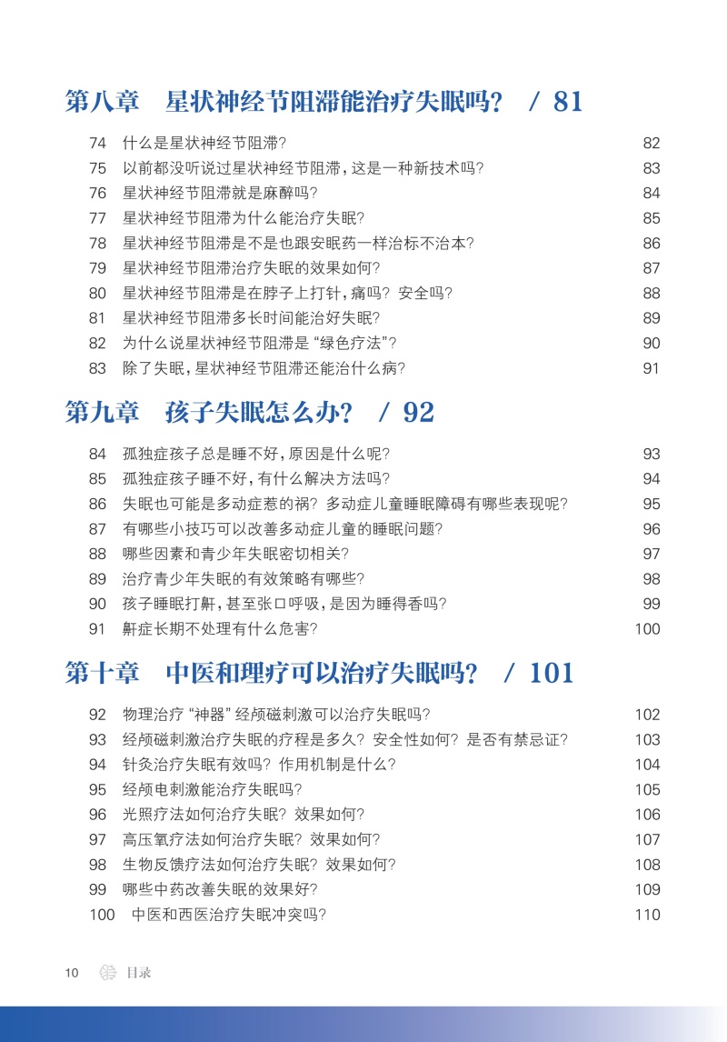 本书主要针对原发性失眠、心理及躯体疾病与睡眠障碍的关系、青少年和女性患者的睡眠障碍、失眠相关药物和星状神经节阻滞治疗、中医中药治疗等问题进行科普。全书共十章,包括睡眠相关基础知识篇、躯体疾病和睡眠障碍篇、精神心理疾病和睡眠障碍篇、阻塞性睡眠呼吸暂停综合征篇、女性和儿童青少年睡眠障碍篇、失眠的衣食住行和护理篇、失眠药物治疗篇、星状神经节阻滞治疗失眠篇、失眠的认知行为疗法篇、失眠的中医中药治疗篇。本书的出版有助于帮助大众了解睡眠不足和睡眠问题带来的不良影响,并在专业指导下用科学的方法改善睡眠。