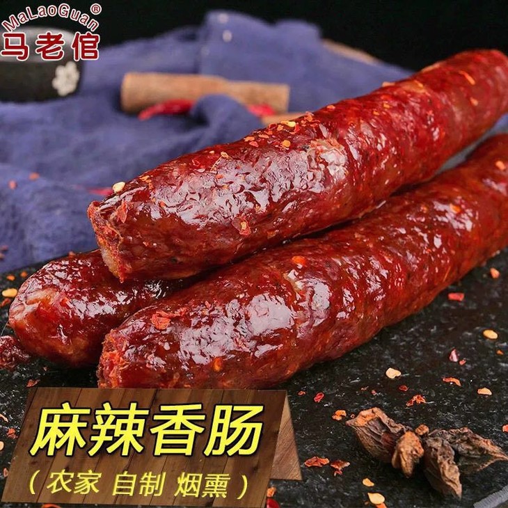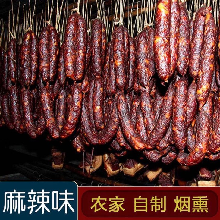 农家自制烟熏麻辣香肠,送礼佳品,川香美味,口口纯正,肉质新鲜,麻辣爽口,色泽自然,三肥七瘦,好吃不腻!