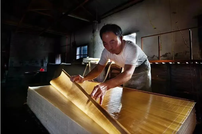 料,并配以泾县独有的山涧泉水手工生产,工艺非常复杂,其生产的宣纸薄如蝉翼,润如青云,不仅具有质地
