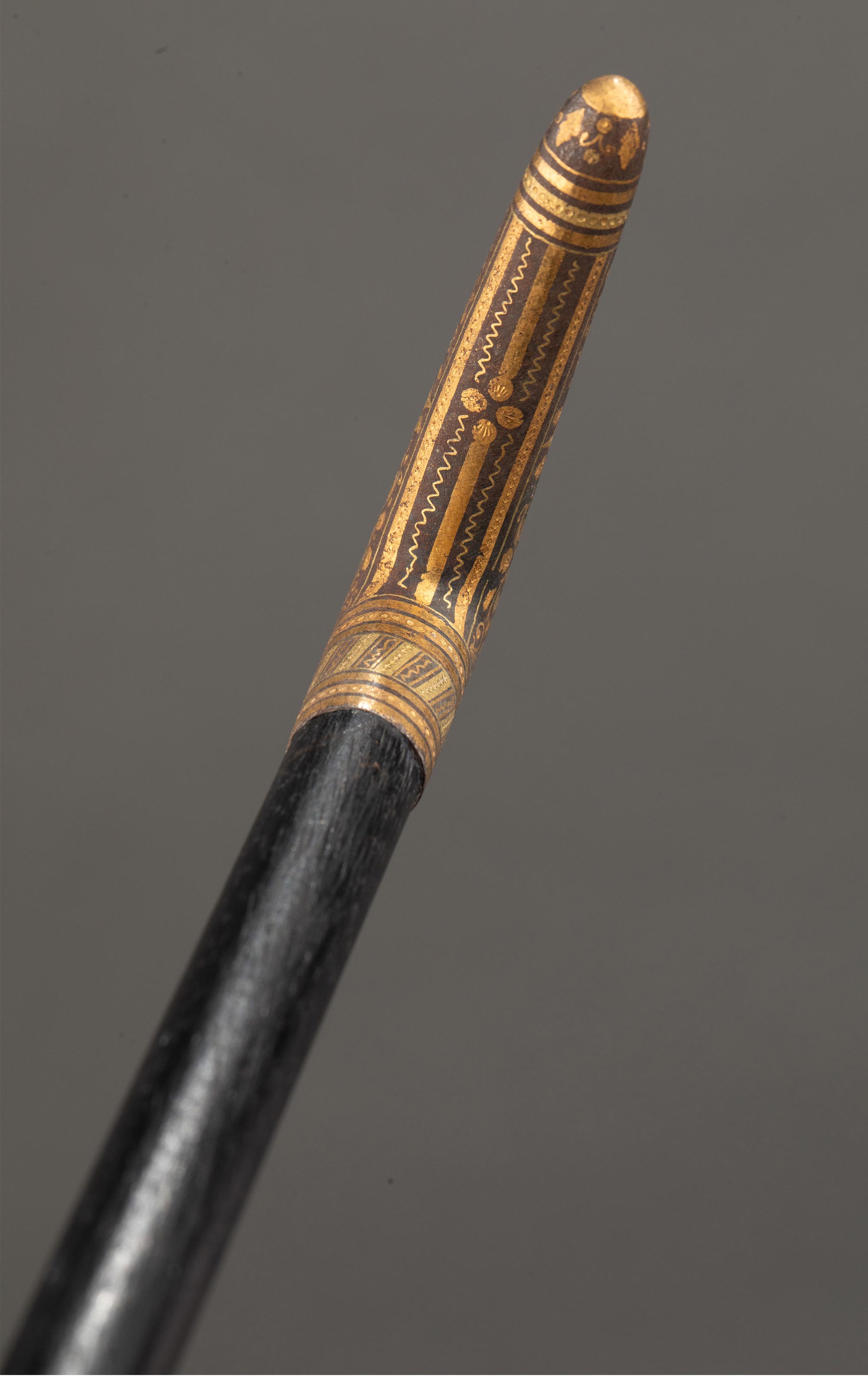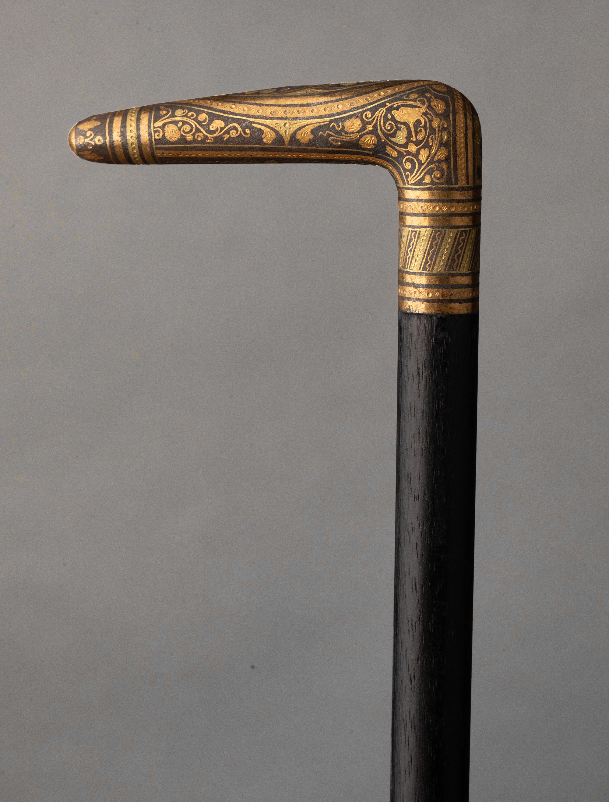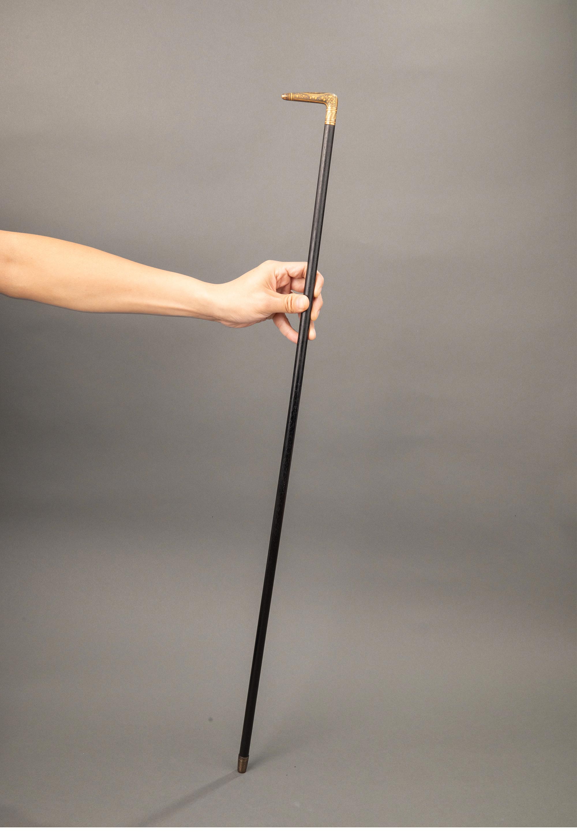 1880-1910年代西班牙出品卷叶花卉纹主题托莱多钢镶嵌黄金杖柄装饰硬木杖身古董手杖