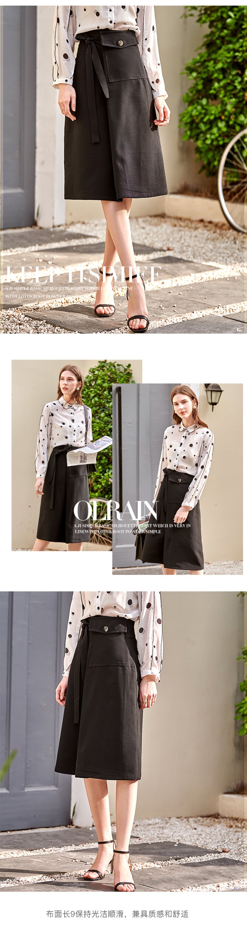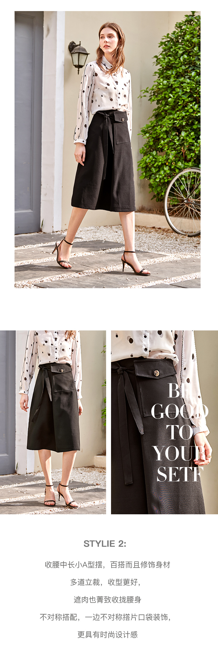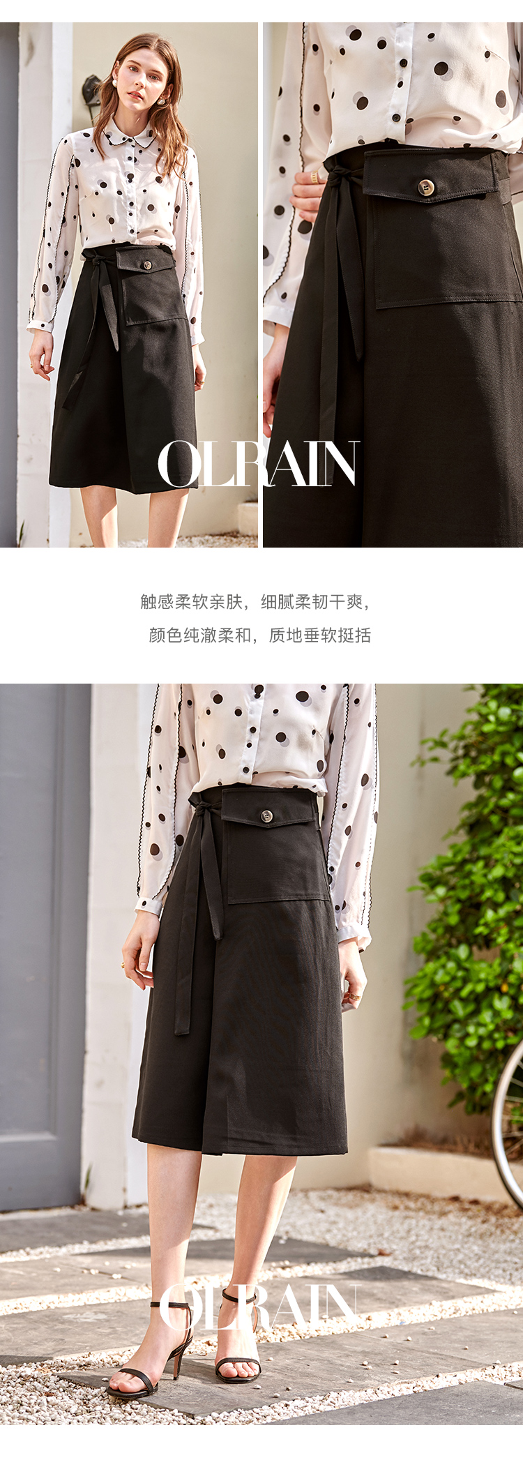 欧芮儿黑色半身裙春季新款高腰显瘦时髦经典气质设计感A字中长裙