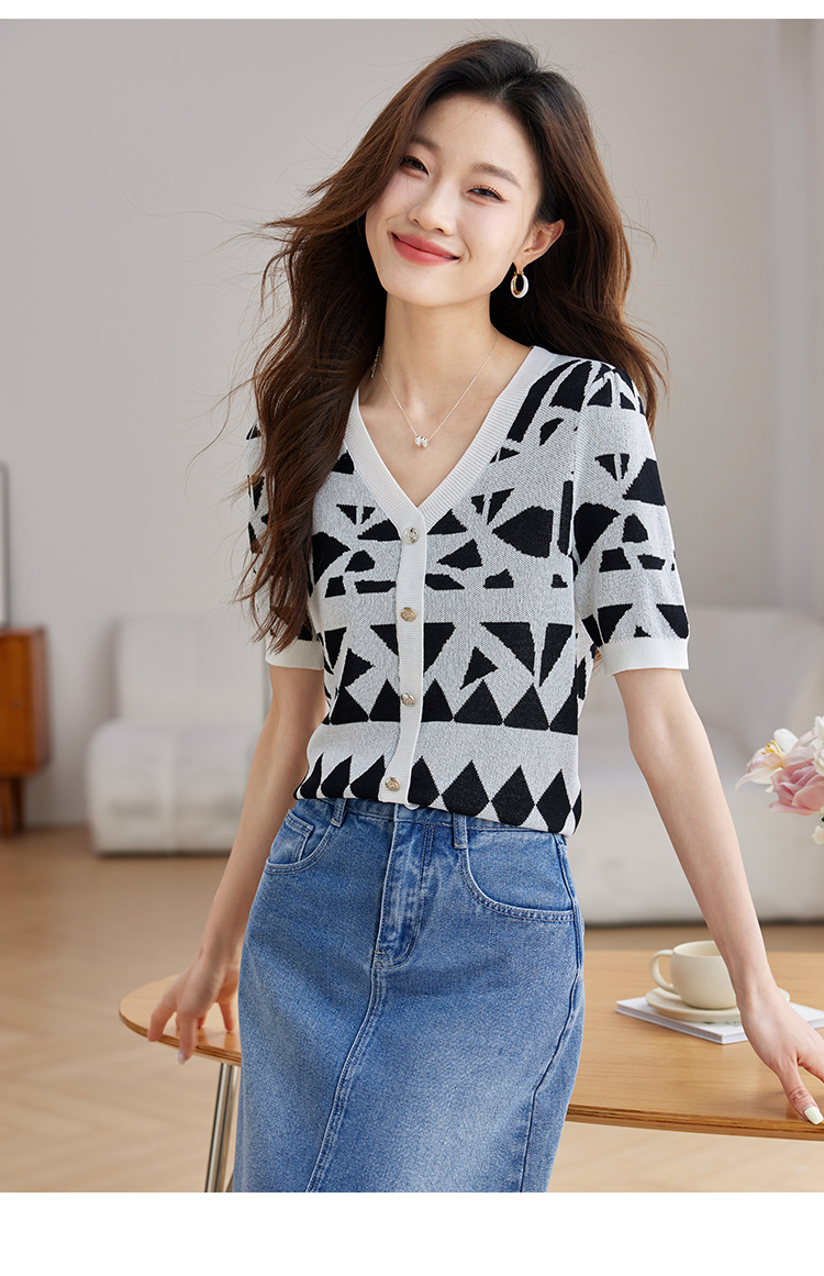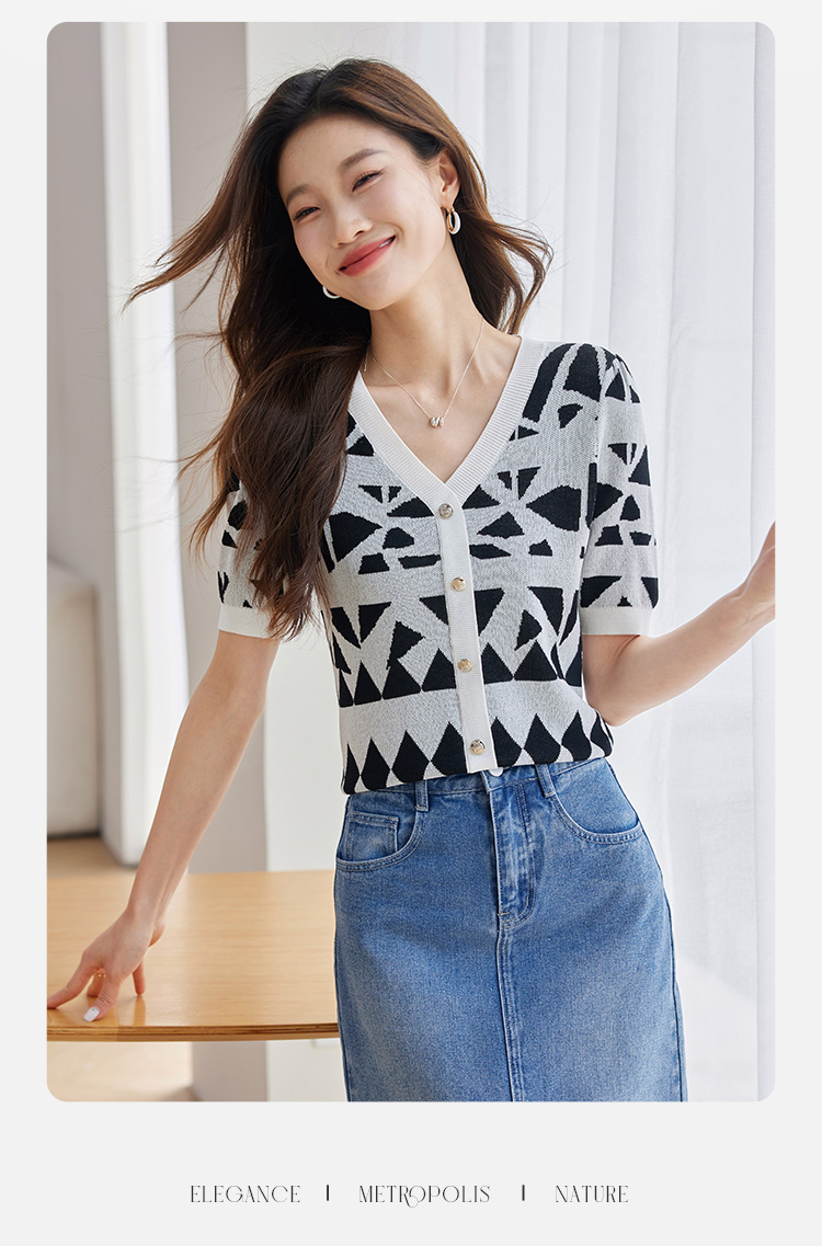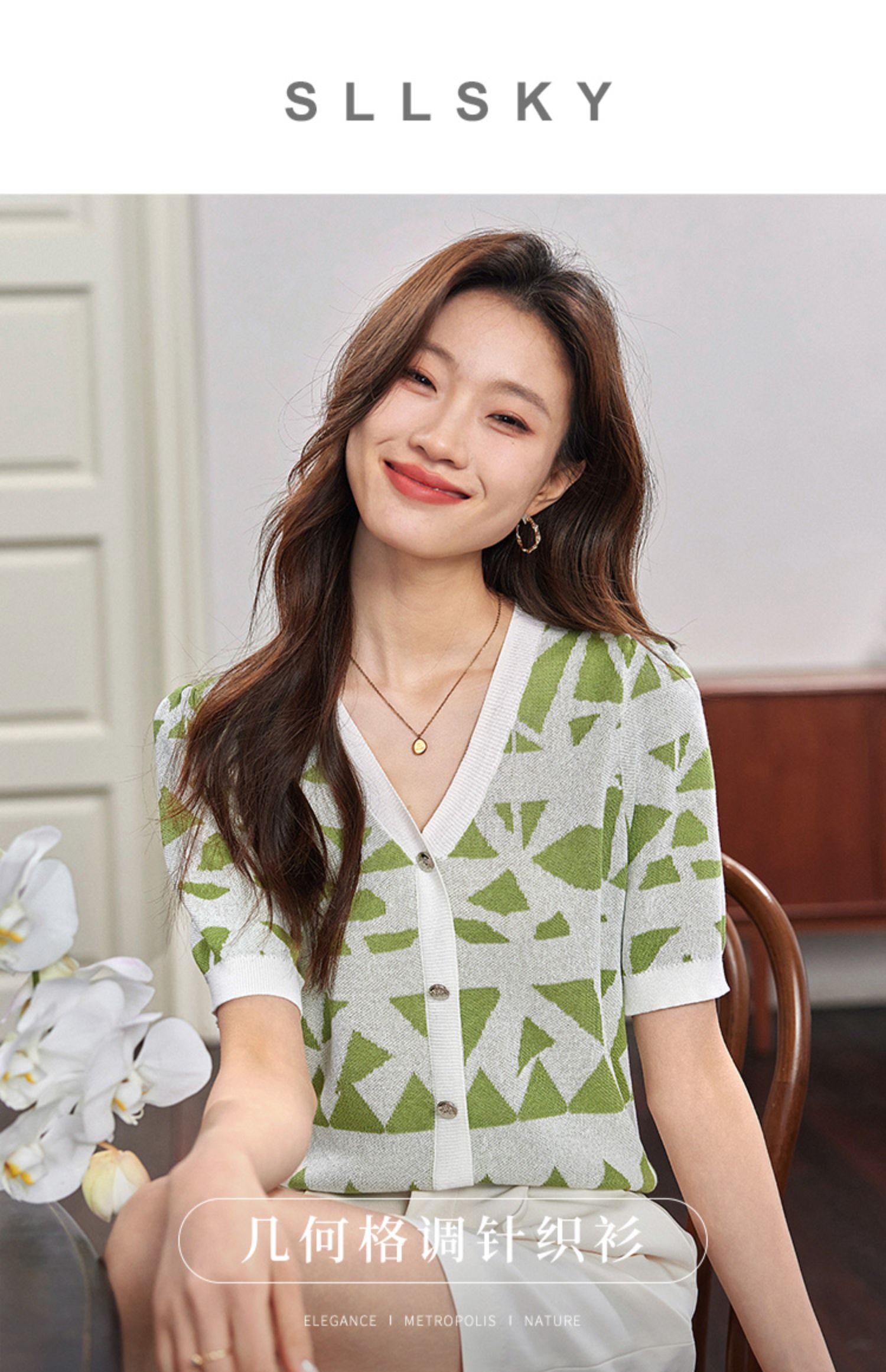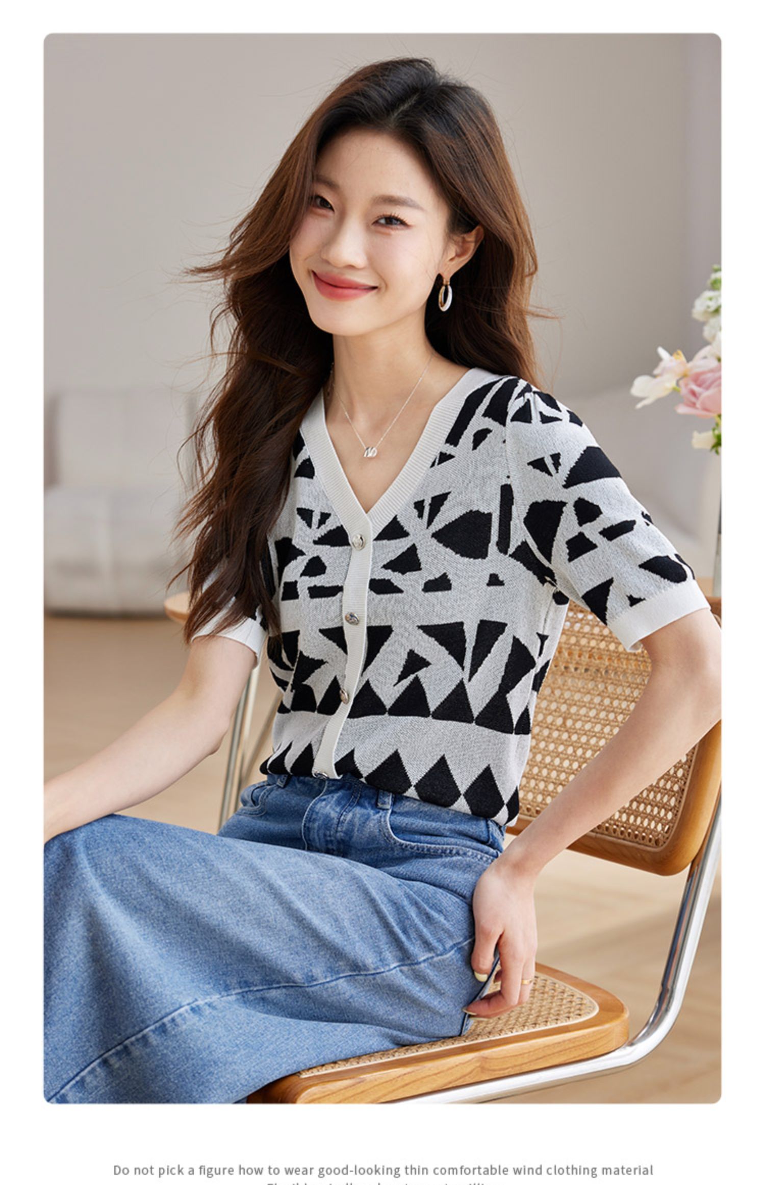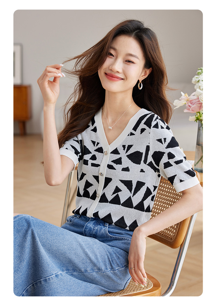【专属特价】熙世界小香风撞色提花V领针织衫短袖薄款冰丝上衣2025夏装新款
