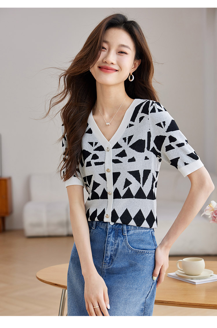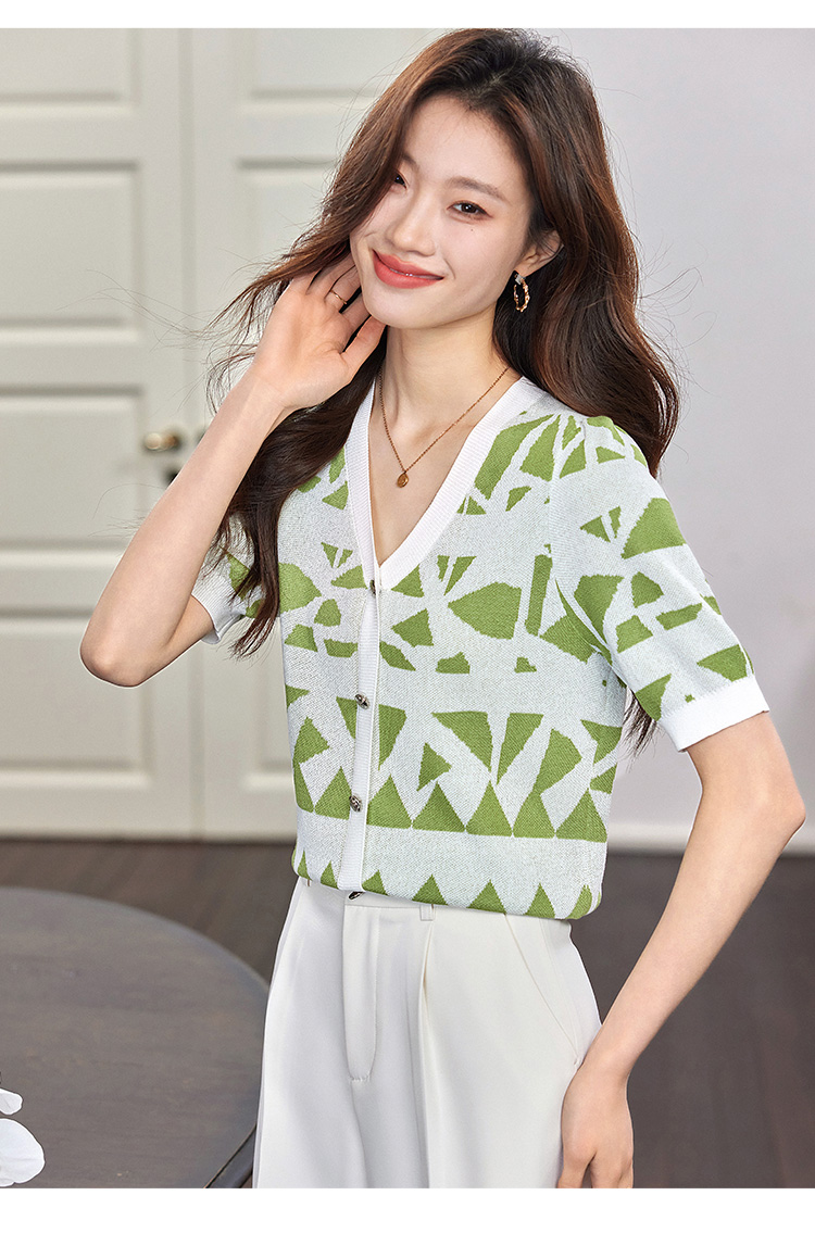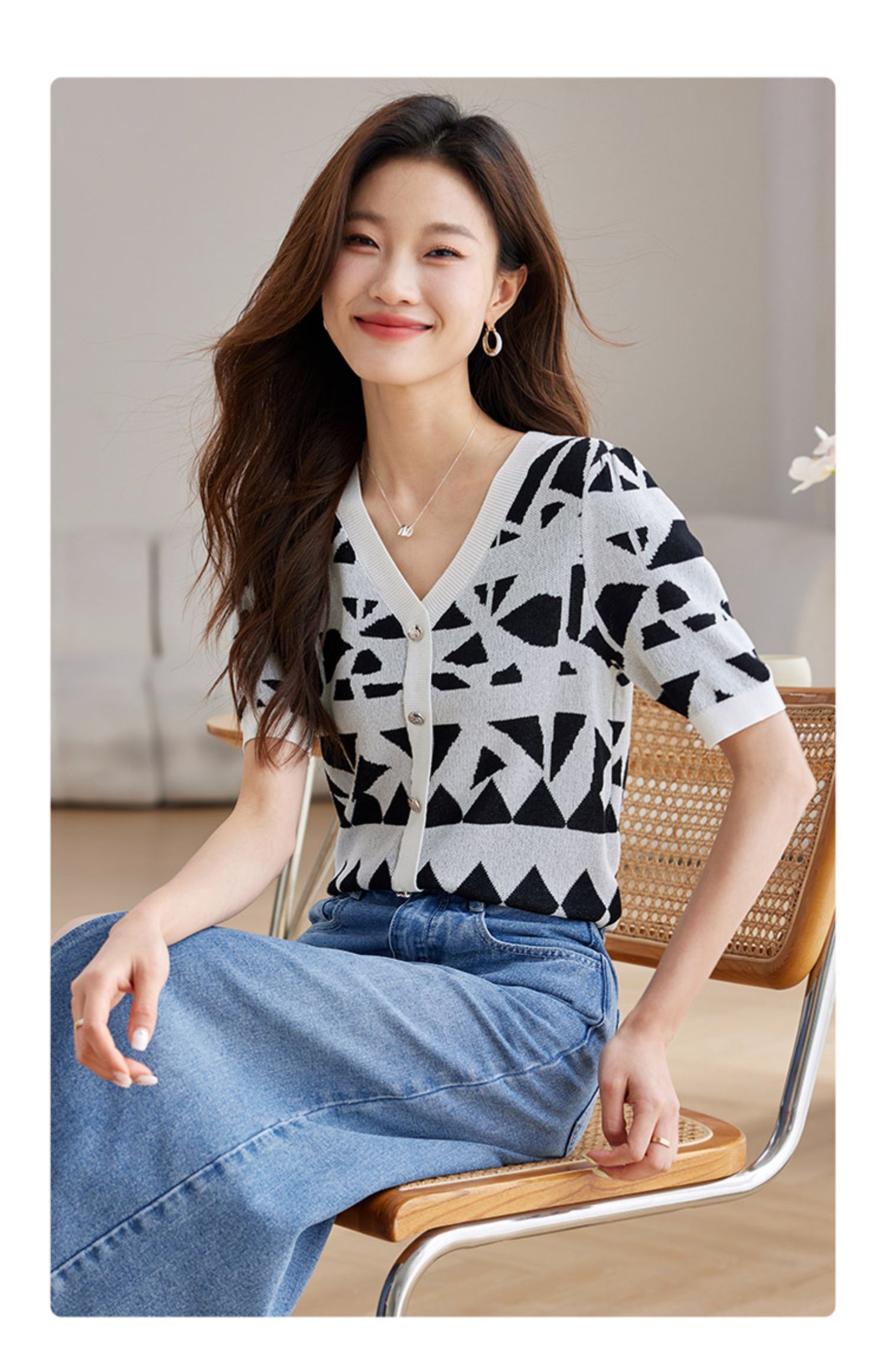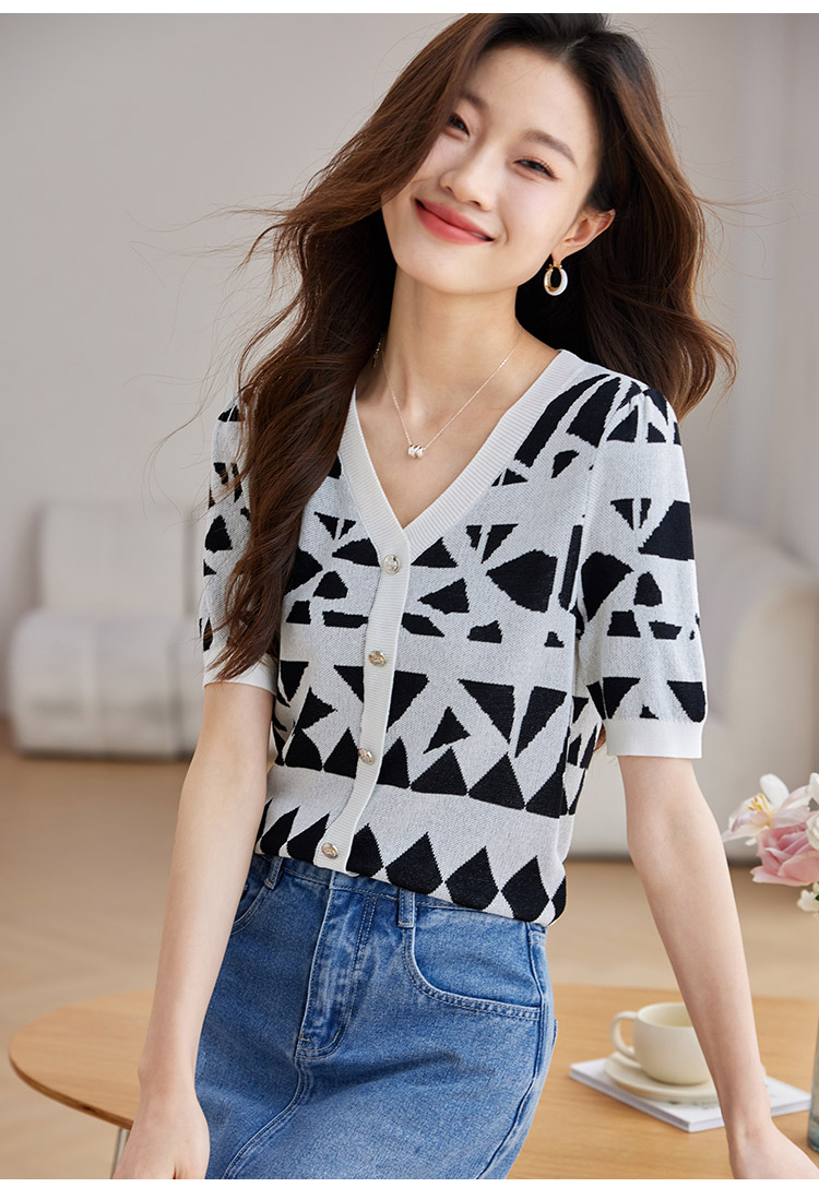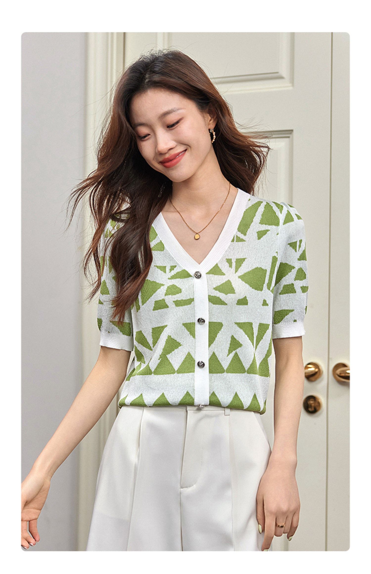 【专属特价】熙世界小香风撞色提花V领针织衫短袖薄款冰丝上衣2025夏装新款