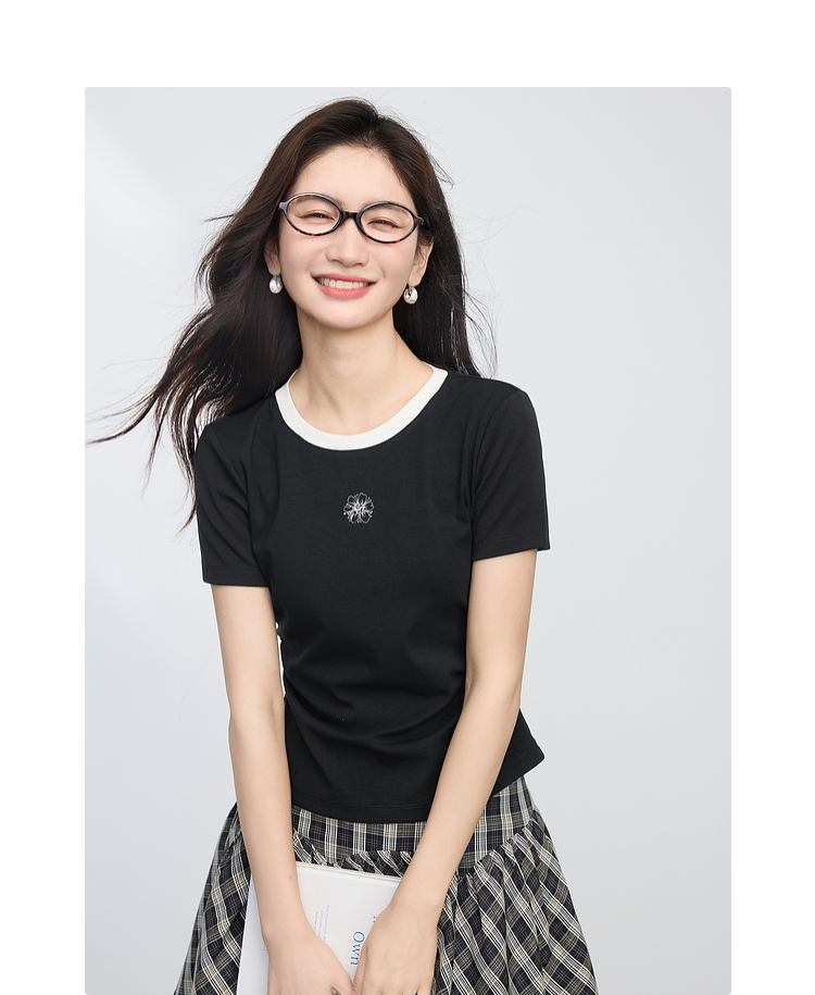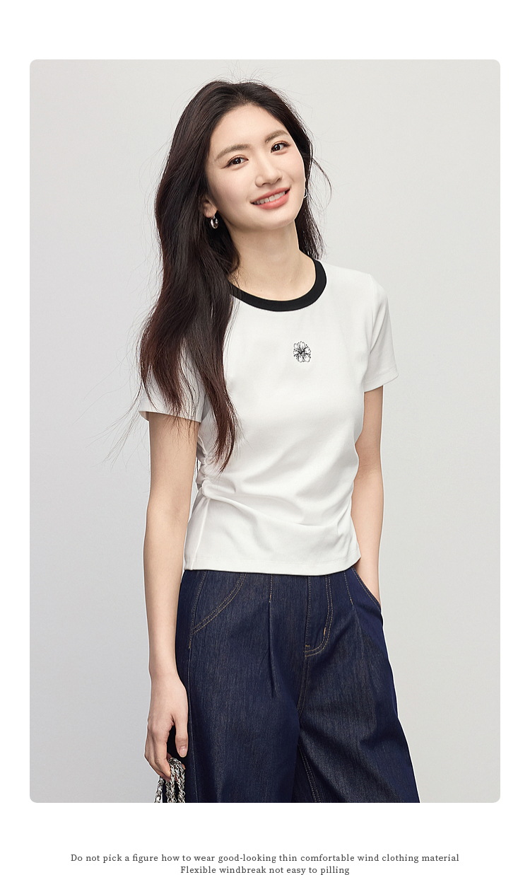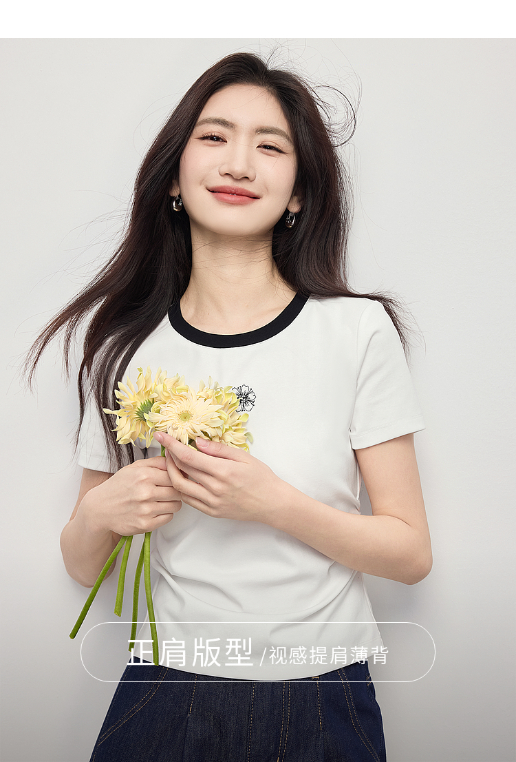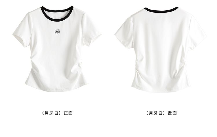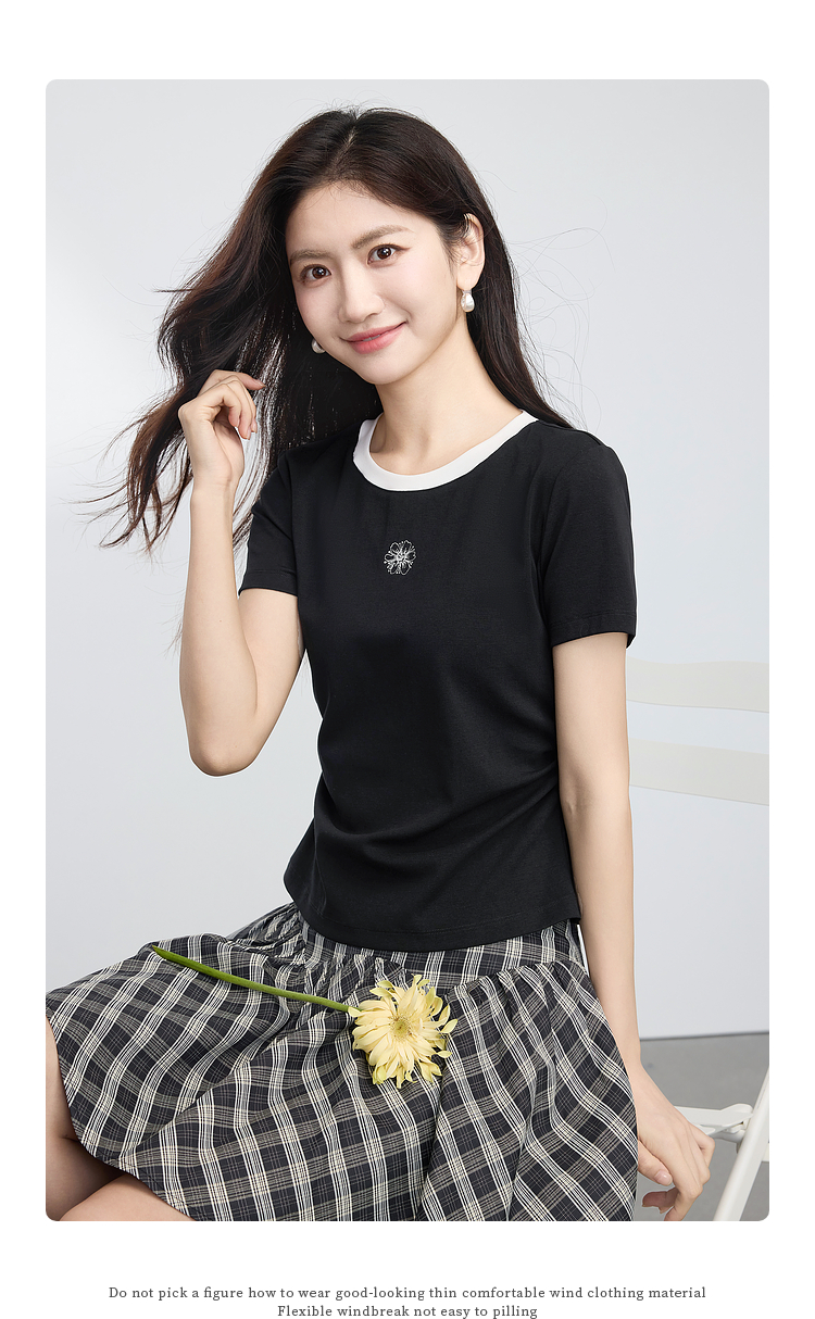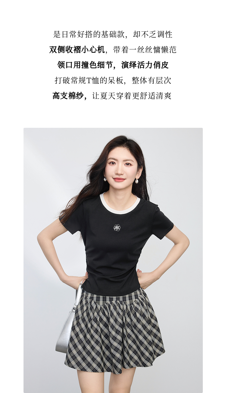 【专属特价】熙世界收腰正肩女T恤2025夏季新款休闲修身显瘦短袖撞色圆领上衣