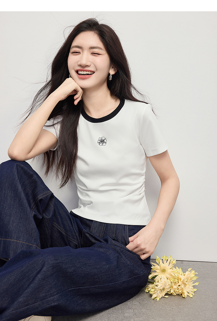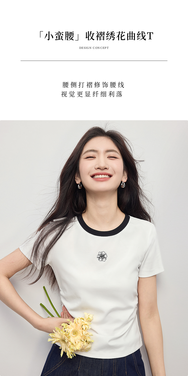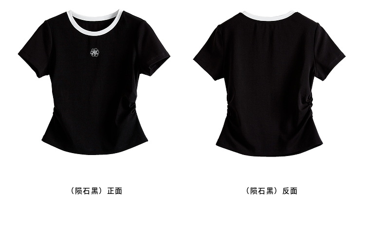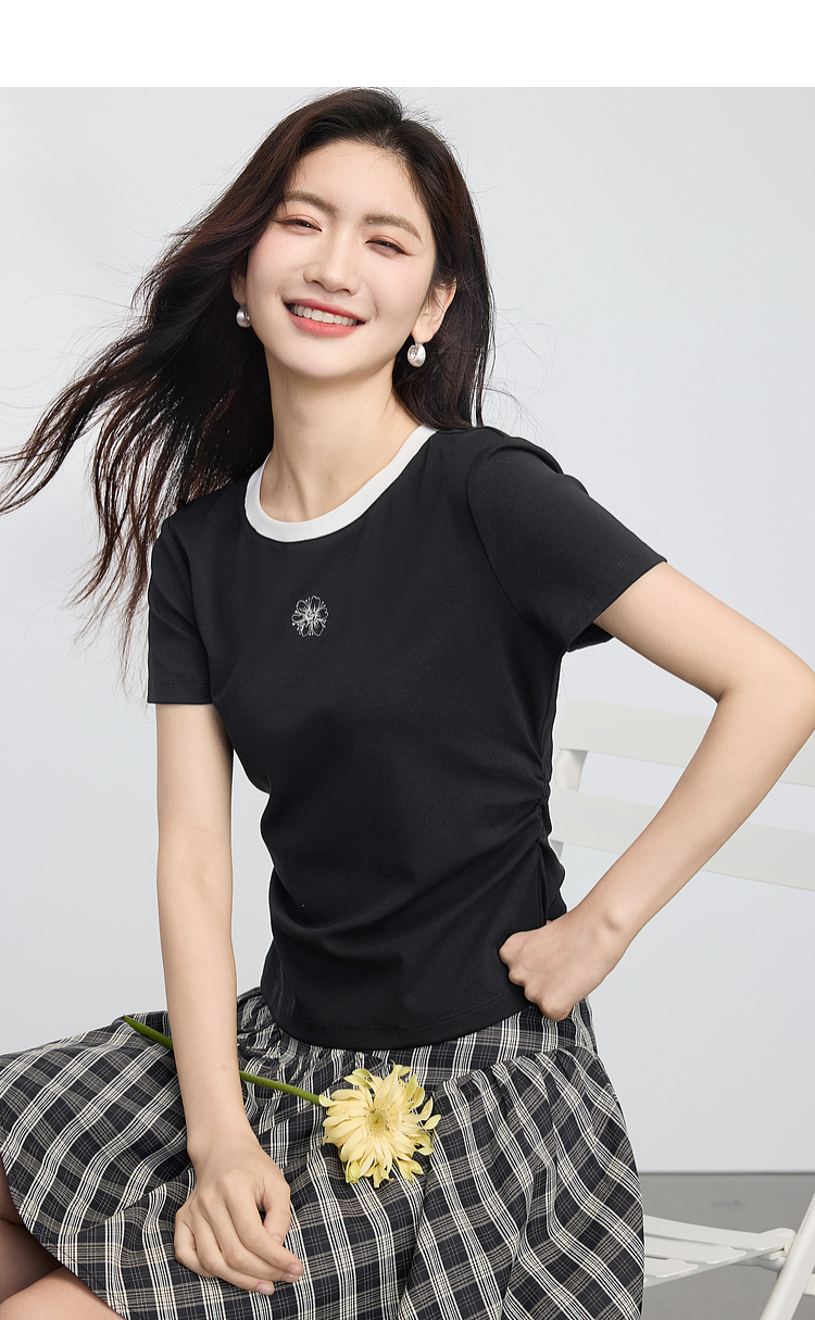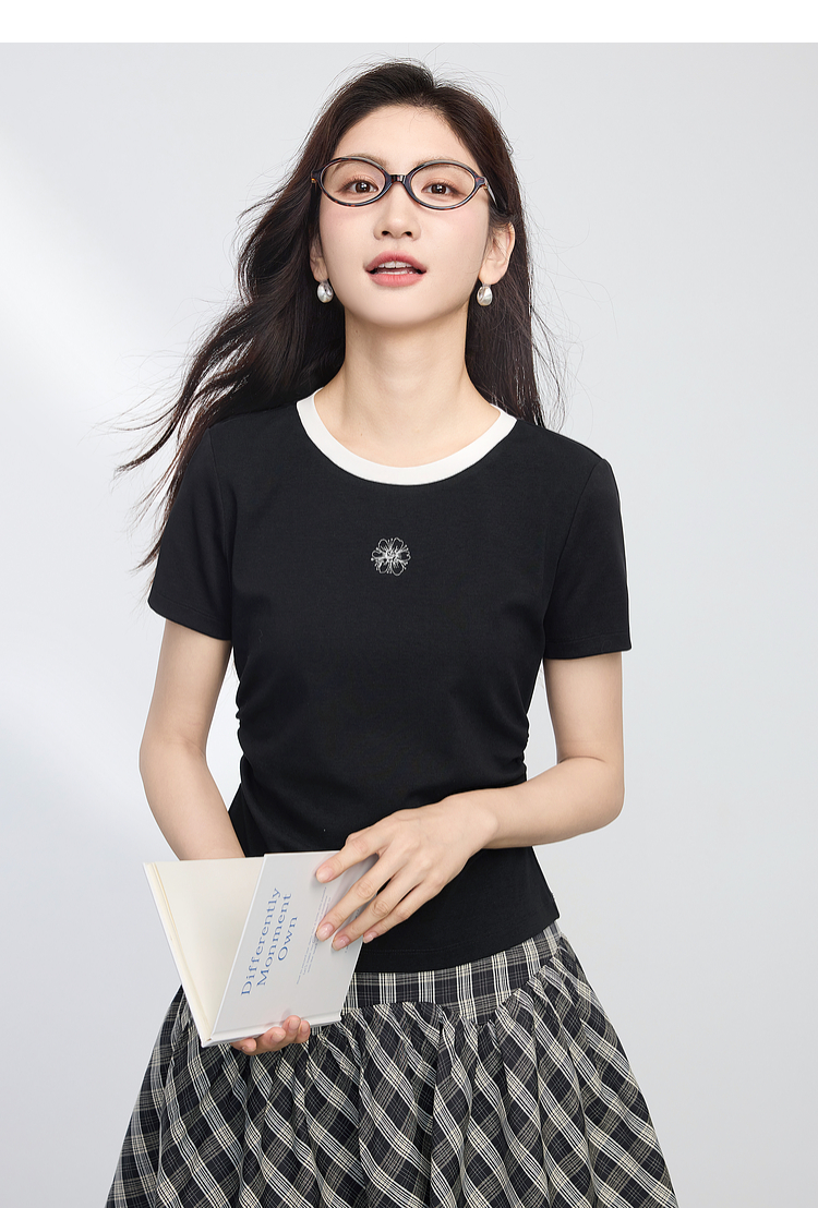 【专属特价】熙世界收腰正肩女T恤2025夏季新款休闲修身显瘦短袖撞色圆领上衣