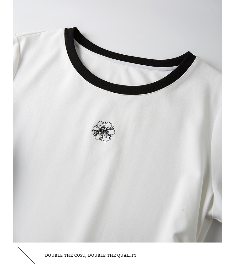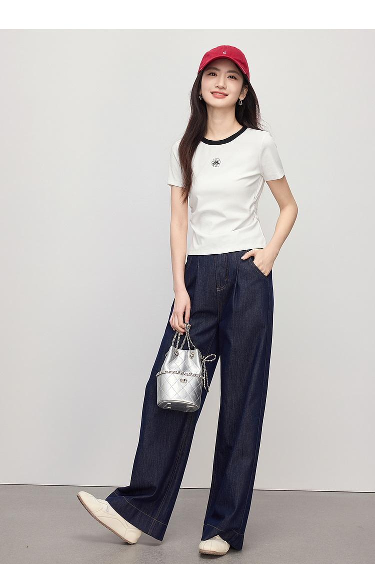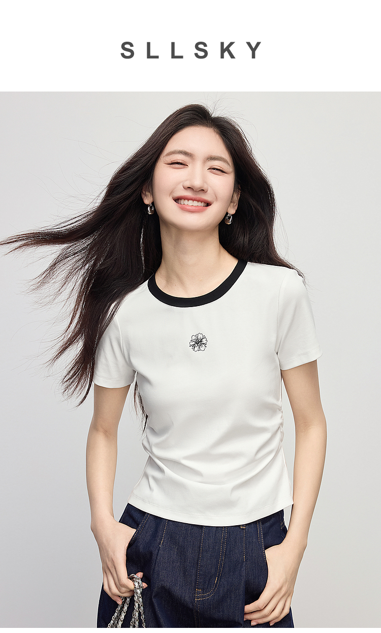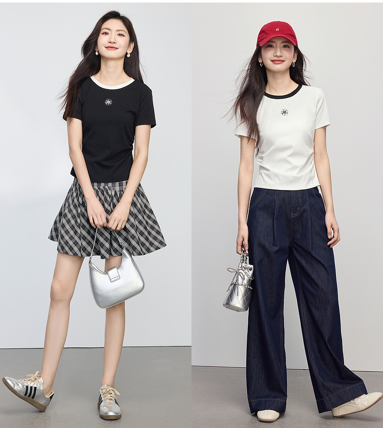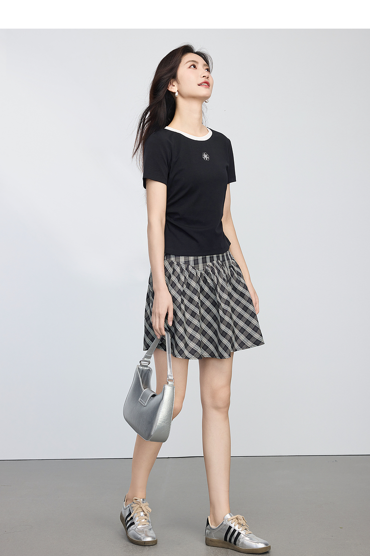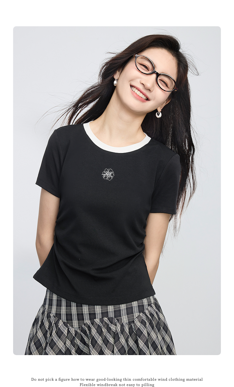 【专属特价】熙世界收腰正肩女T恤2025夏季新款休闲修身显瘦短袖撞色圆领上衣