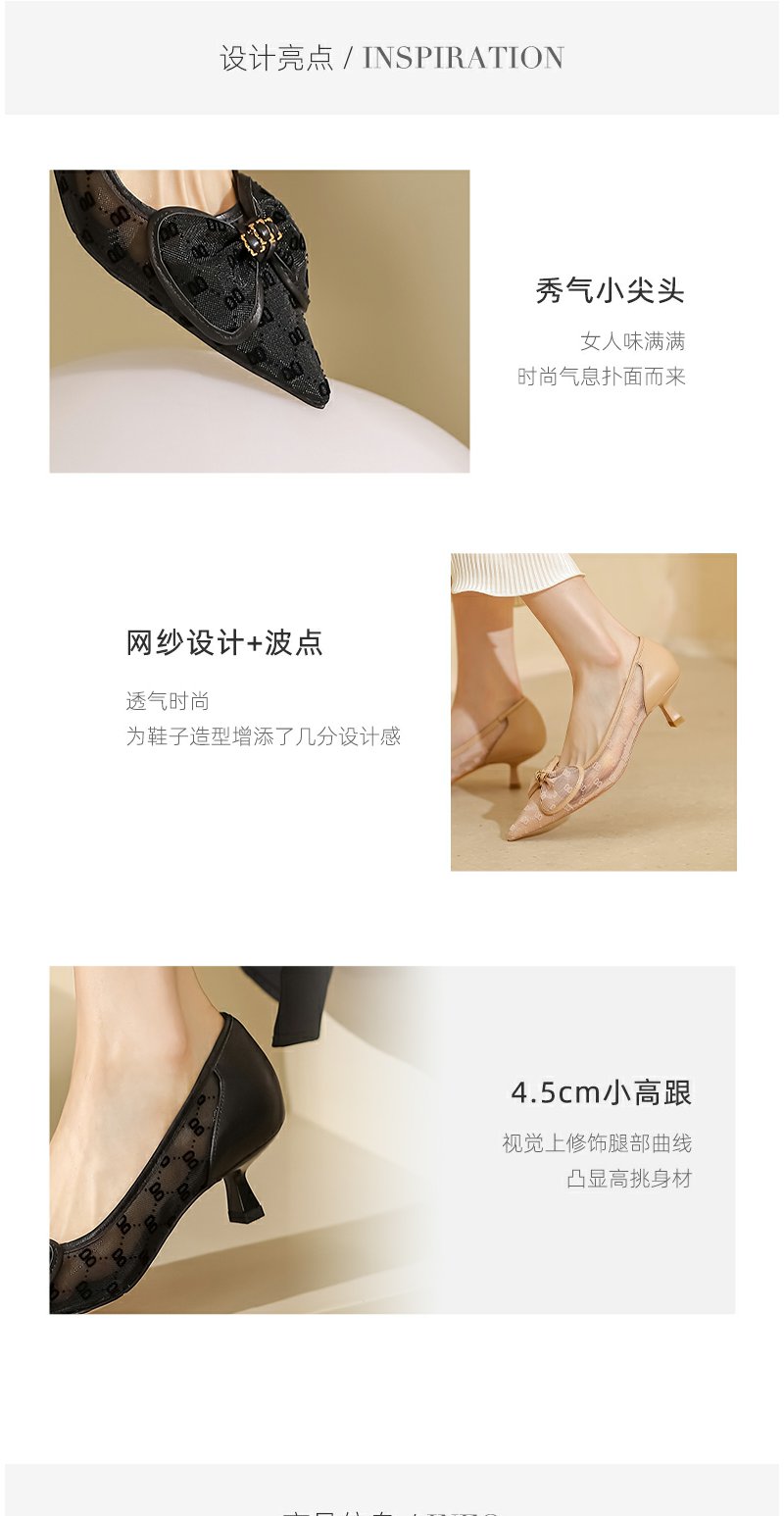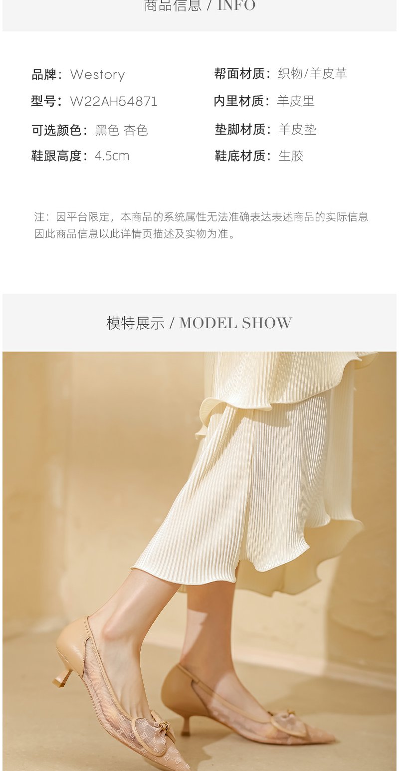 westory2022年夏新款法式气质蝴蝶结网纱波点中细跟尖头单鞋W22AH54871