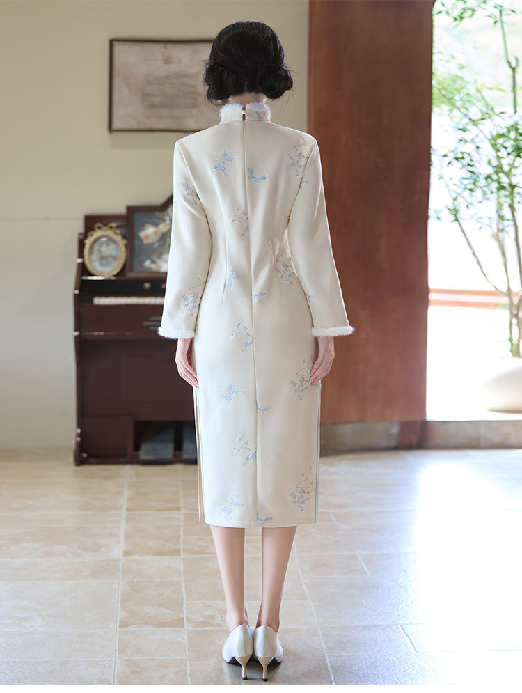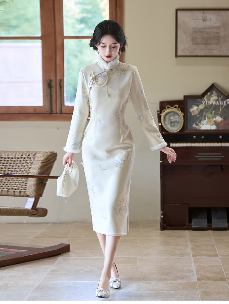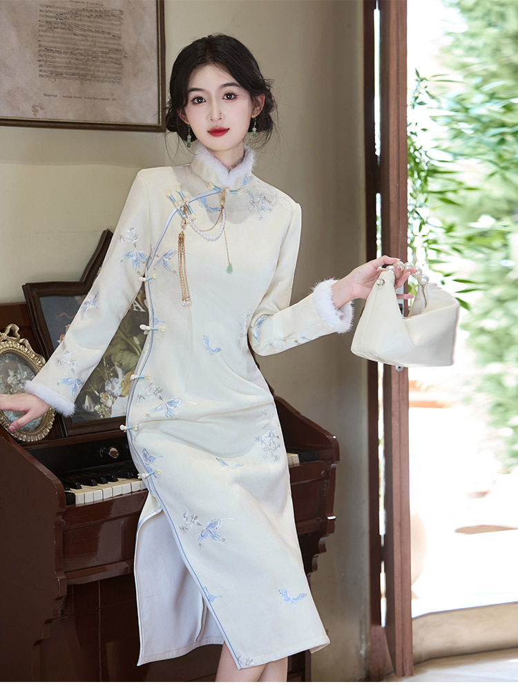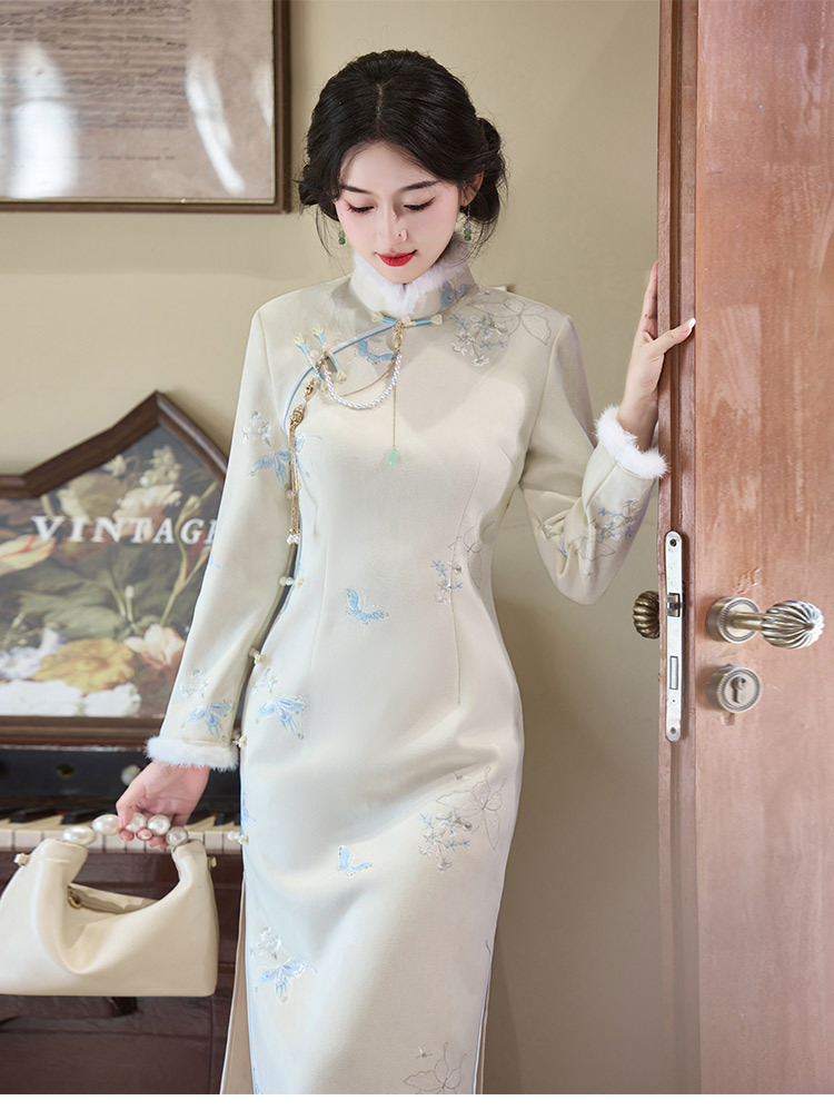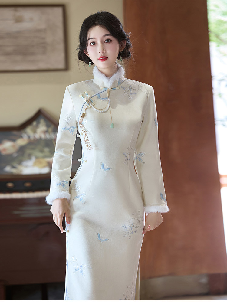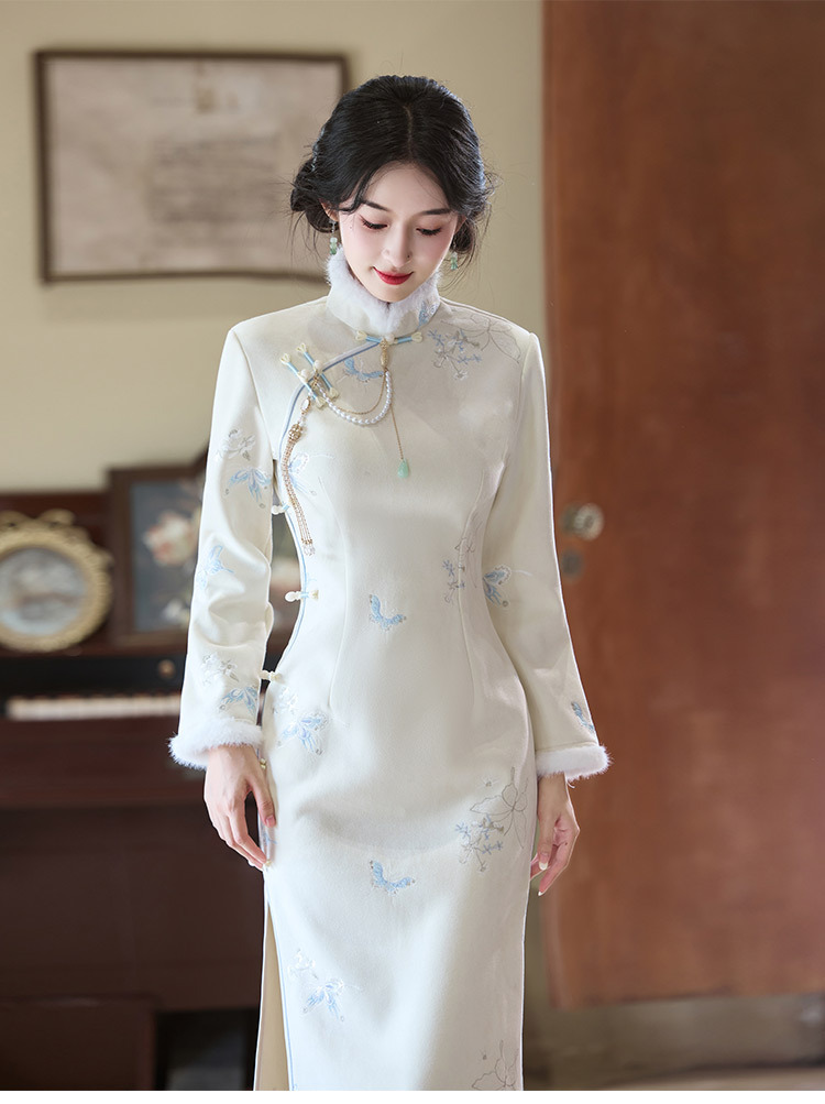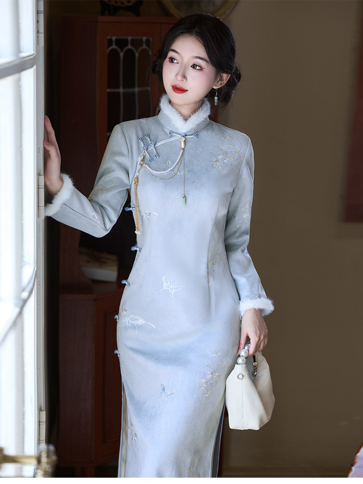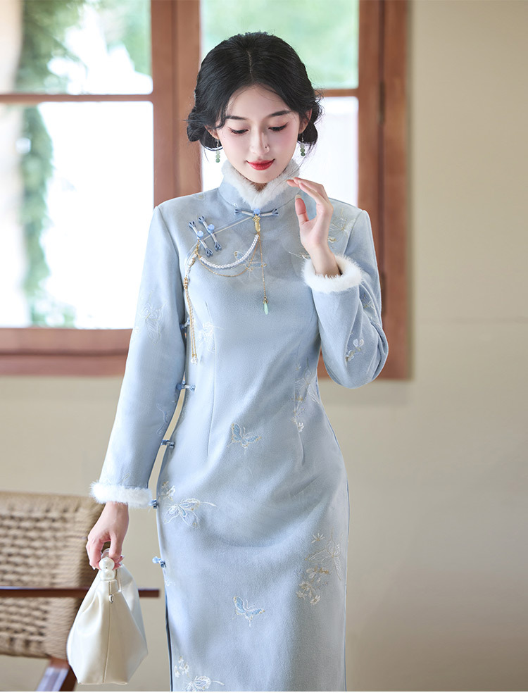 蓝色刺绣加绒加厚冬装国风改良旗袍年轻款 SC22380