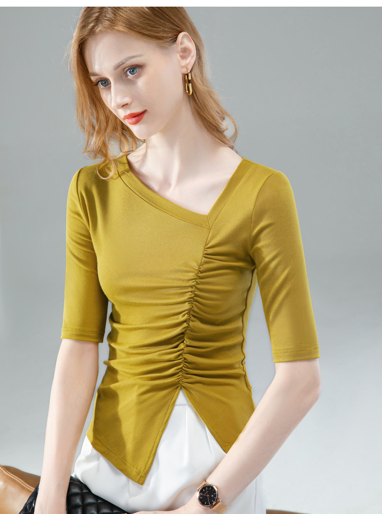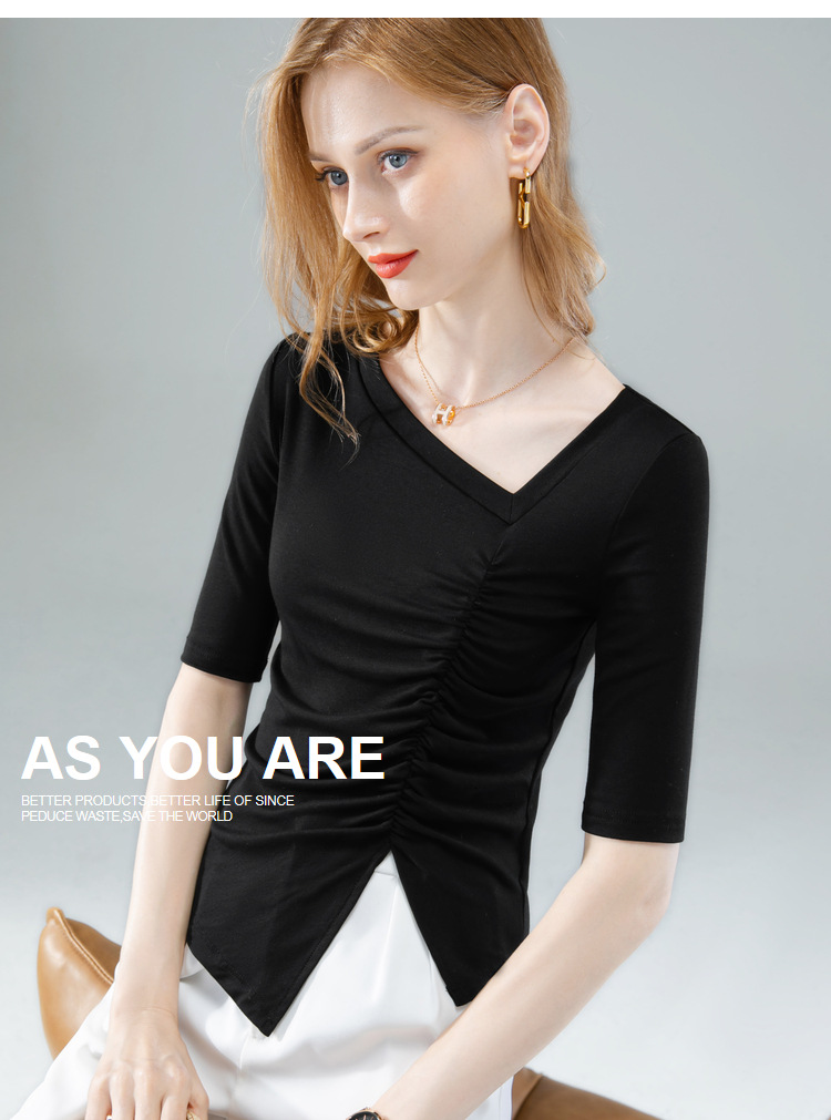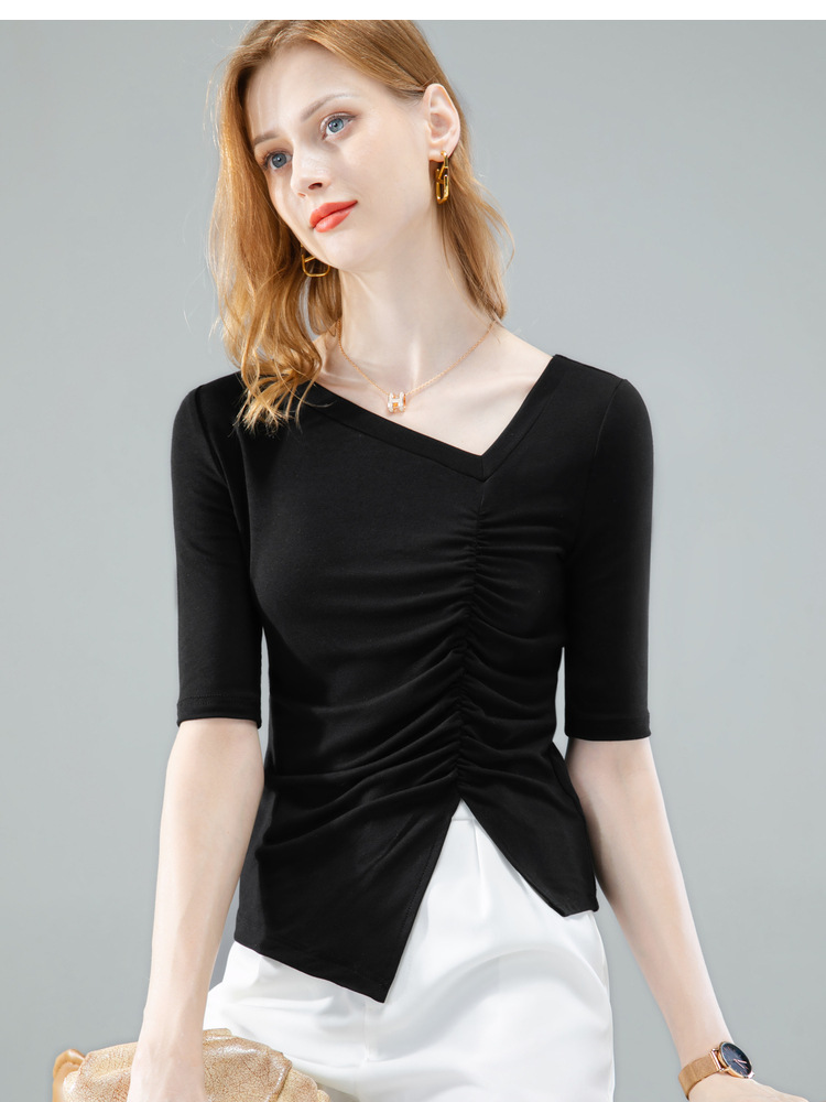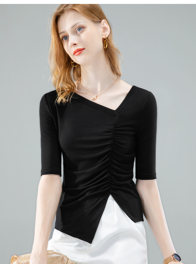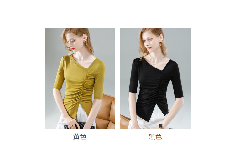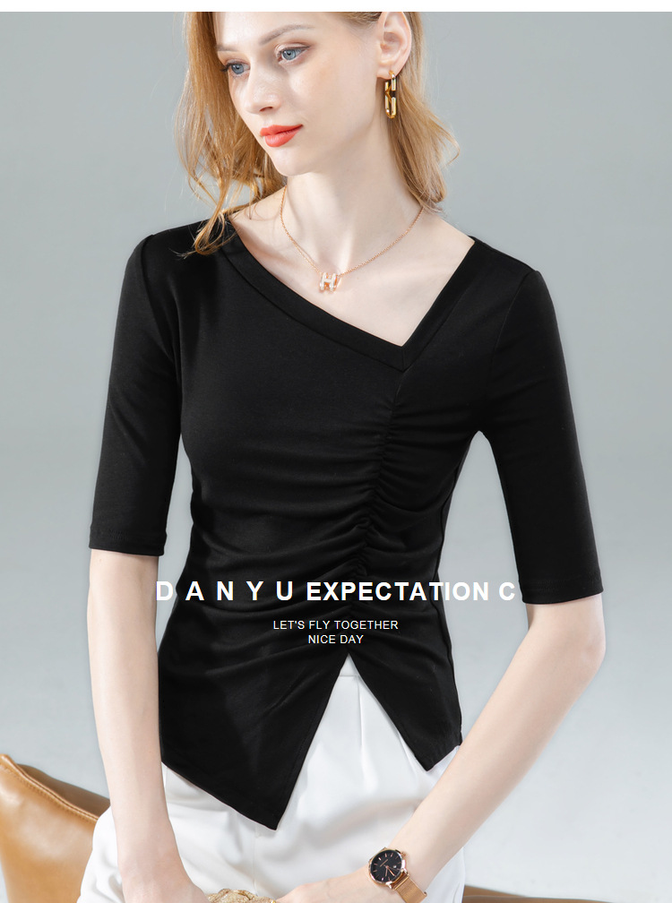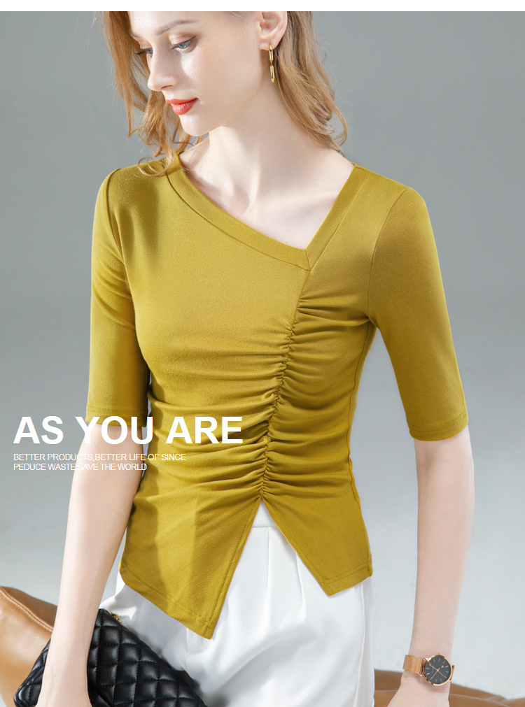 时尚斜肩v领半袖体恤,褶皱开叉设计感收腰上衣SG-T2X0031