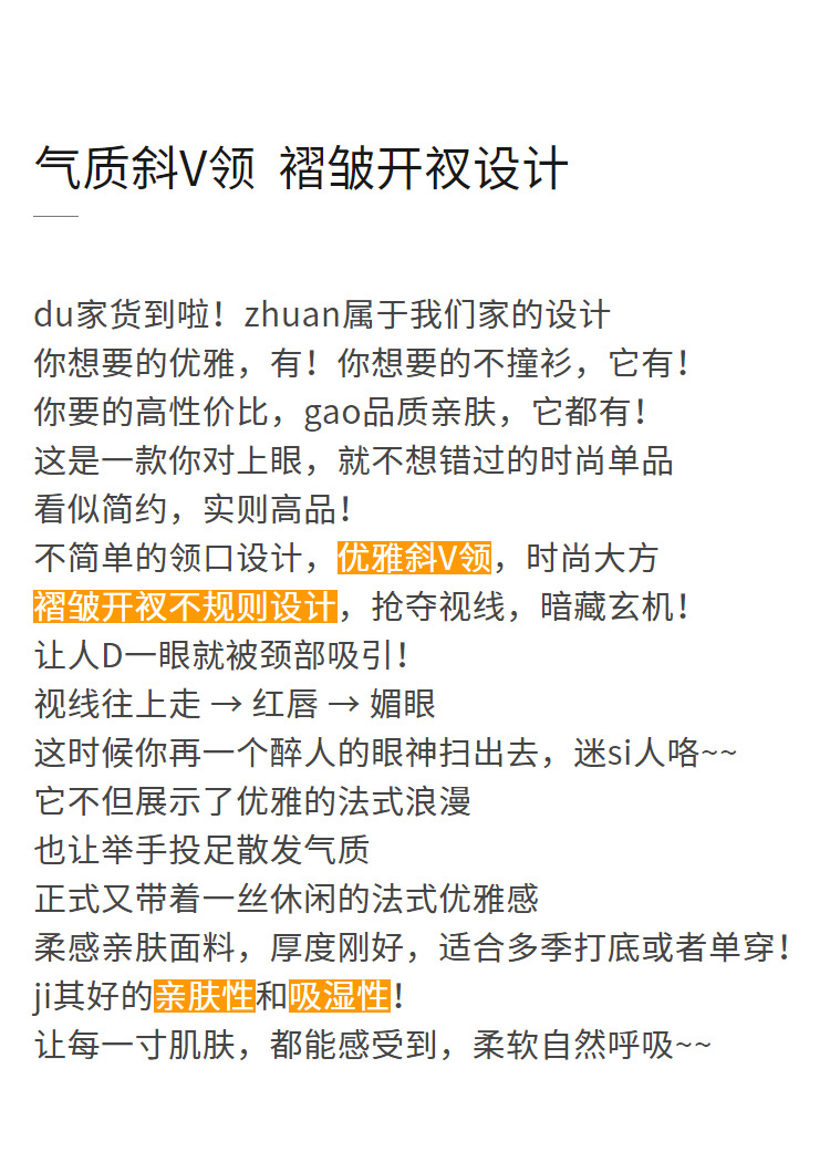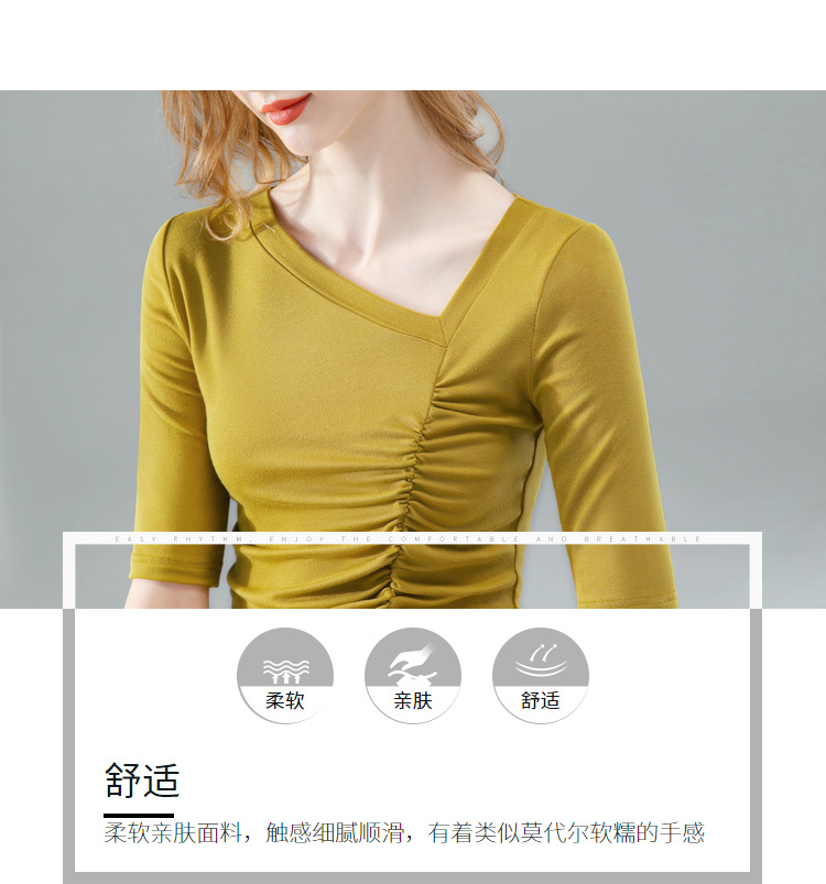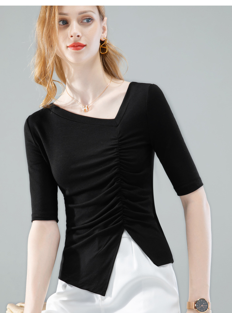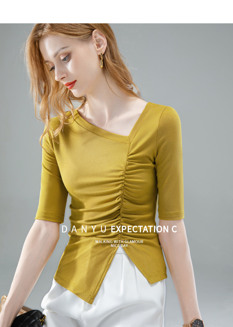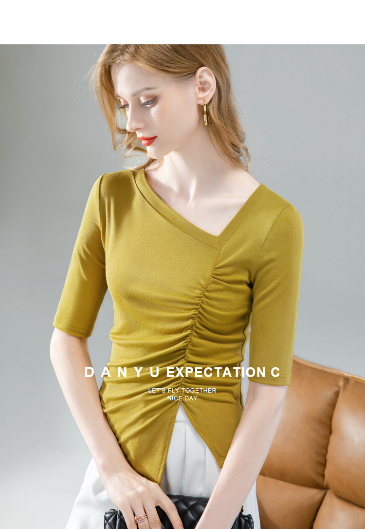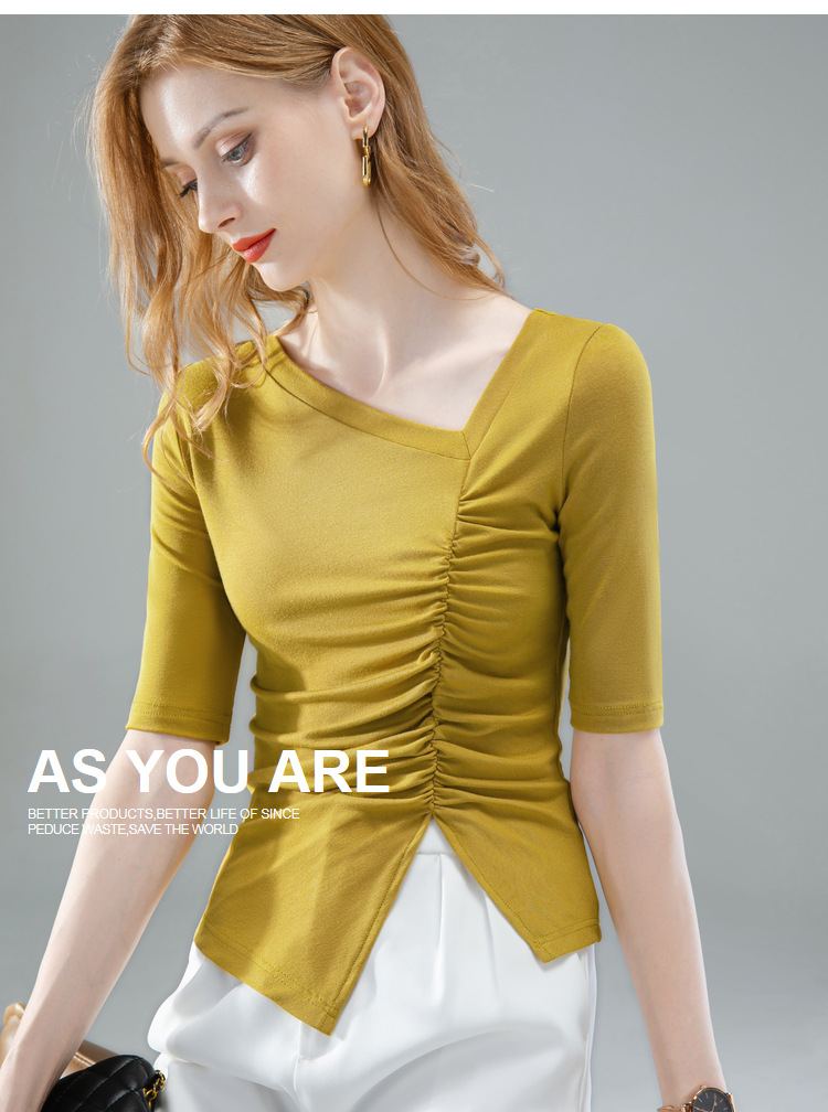 时尚斜肩v领半袖体恤,褶皱开叉设计感收腰上衣SG-T2X0031