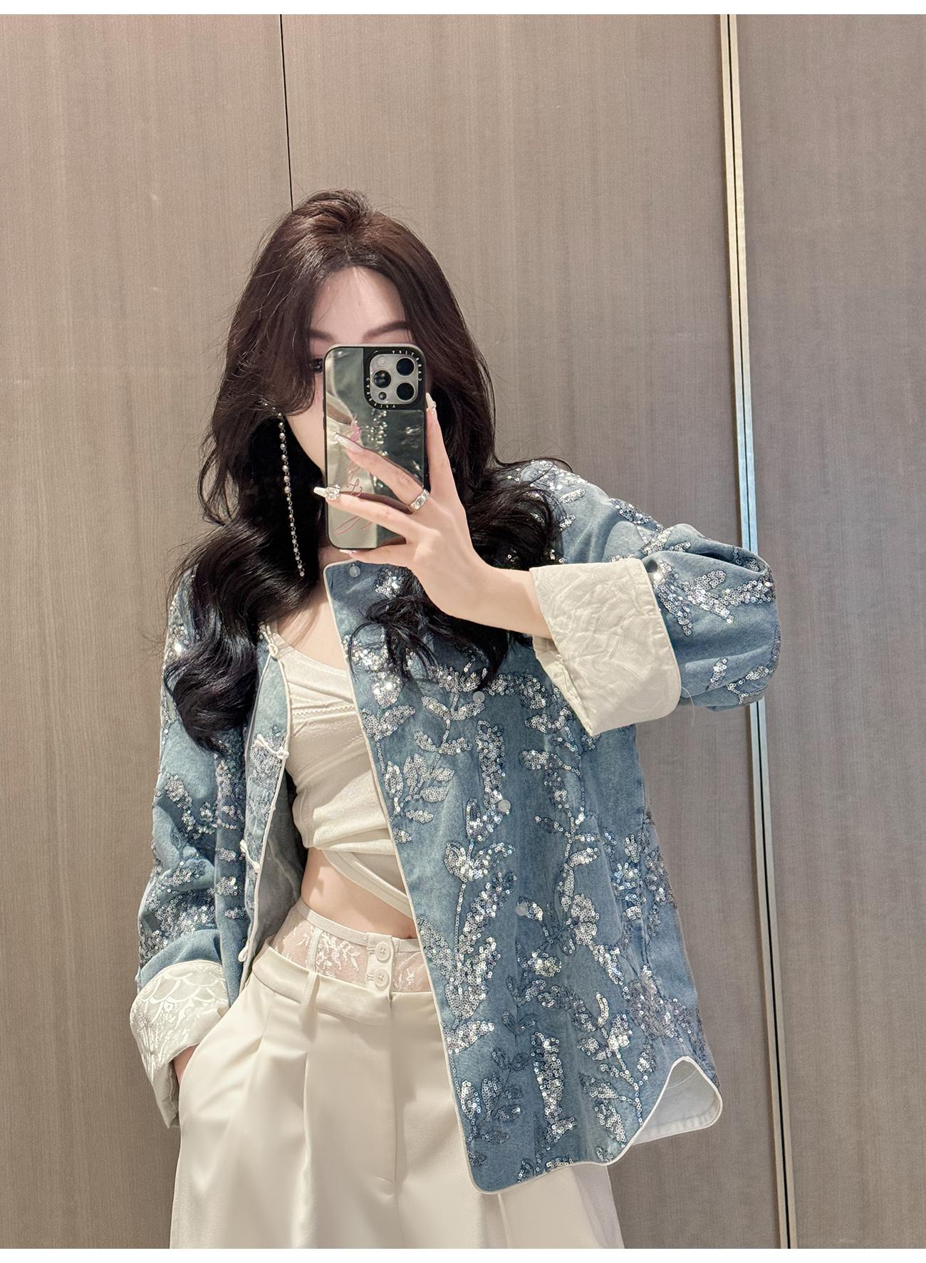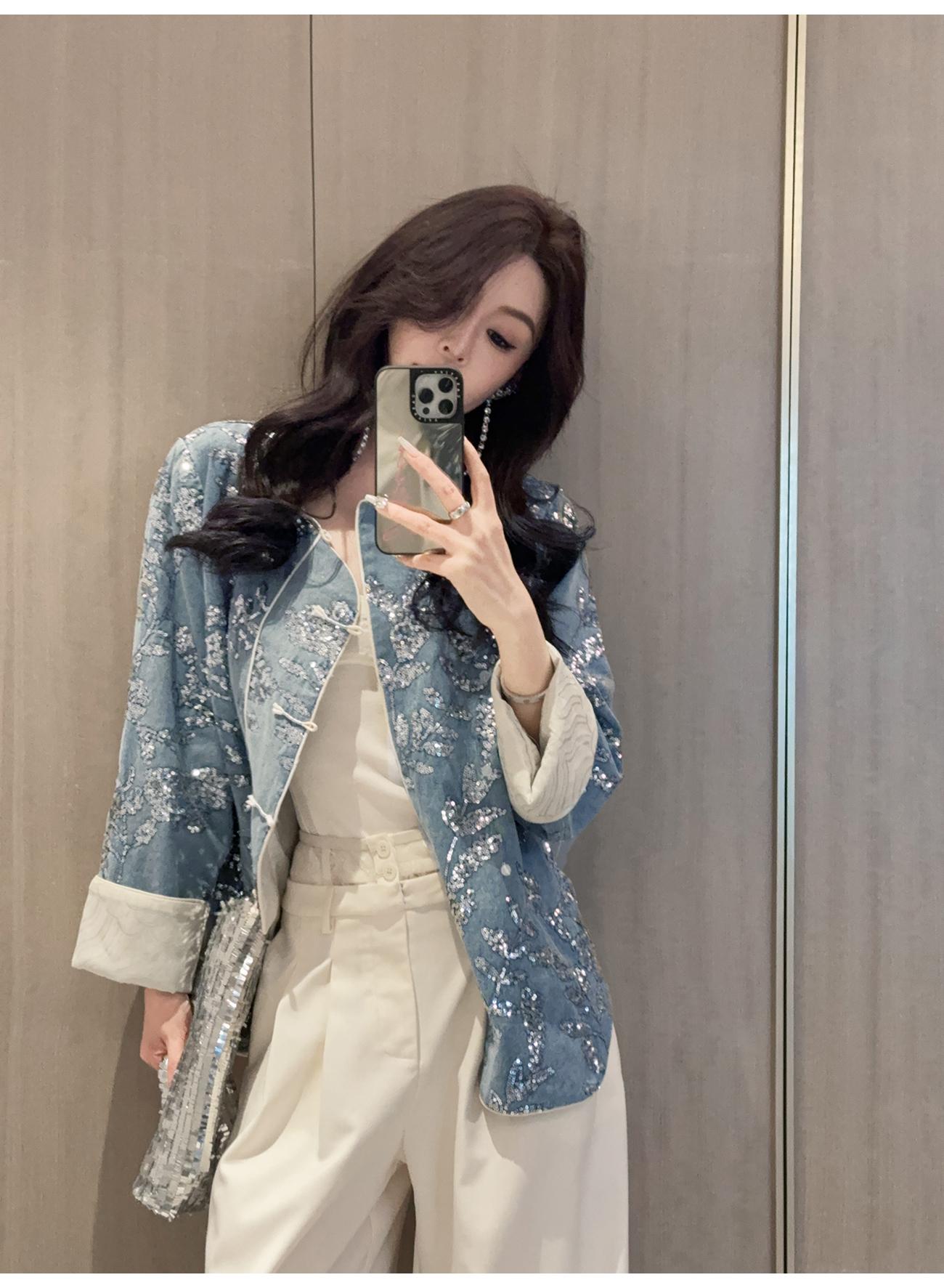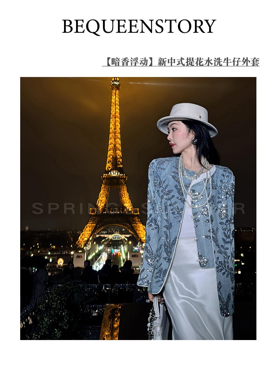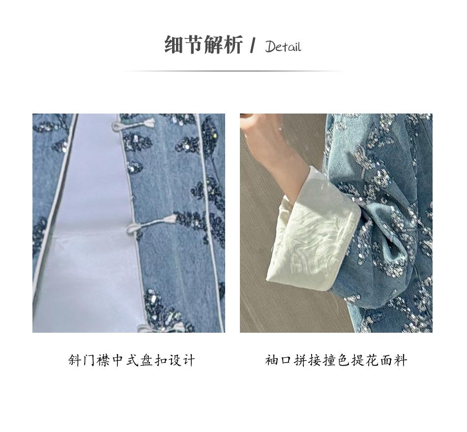 BeQueenStory【暗香浮动】新中式重工珠片绣斜门襟提花水洗牛仔外套