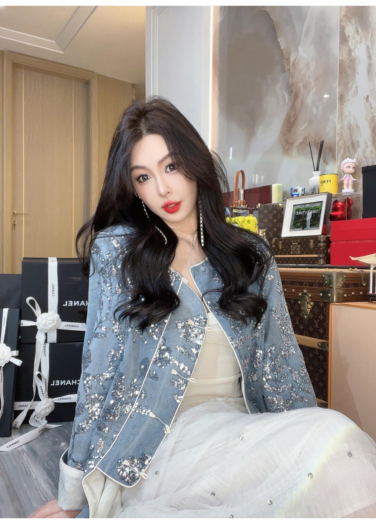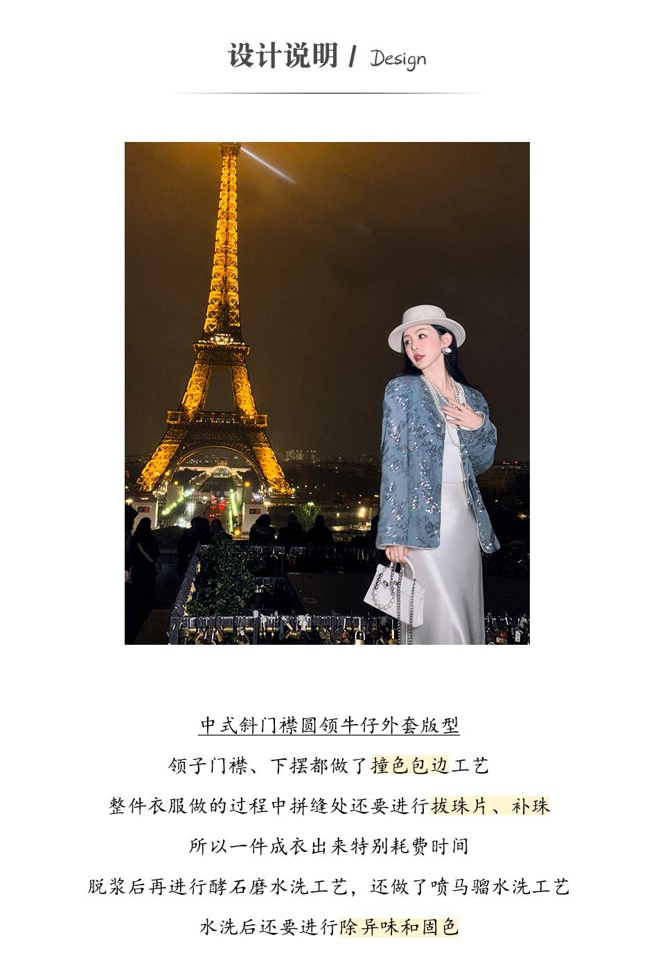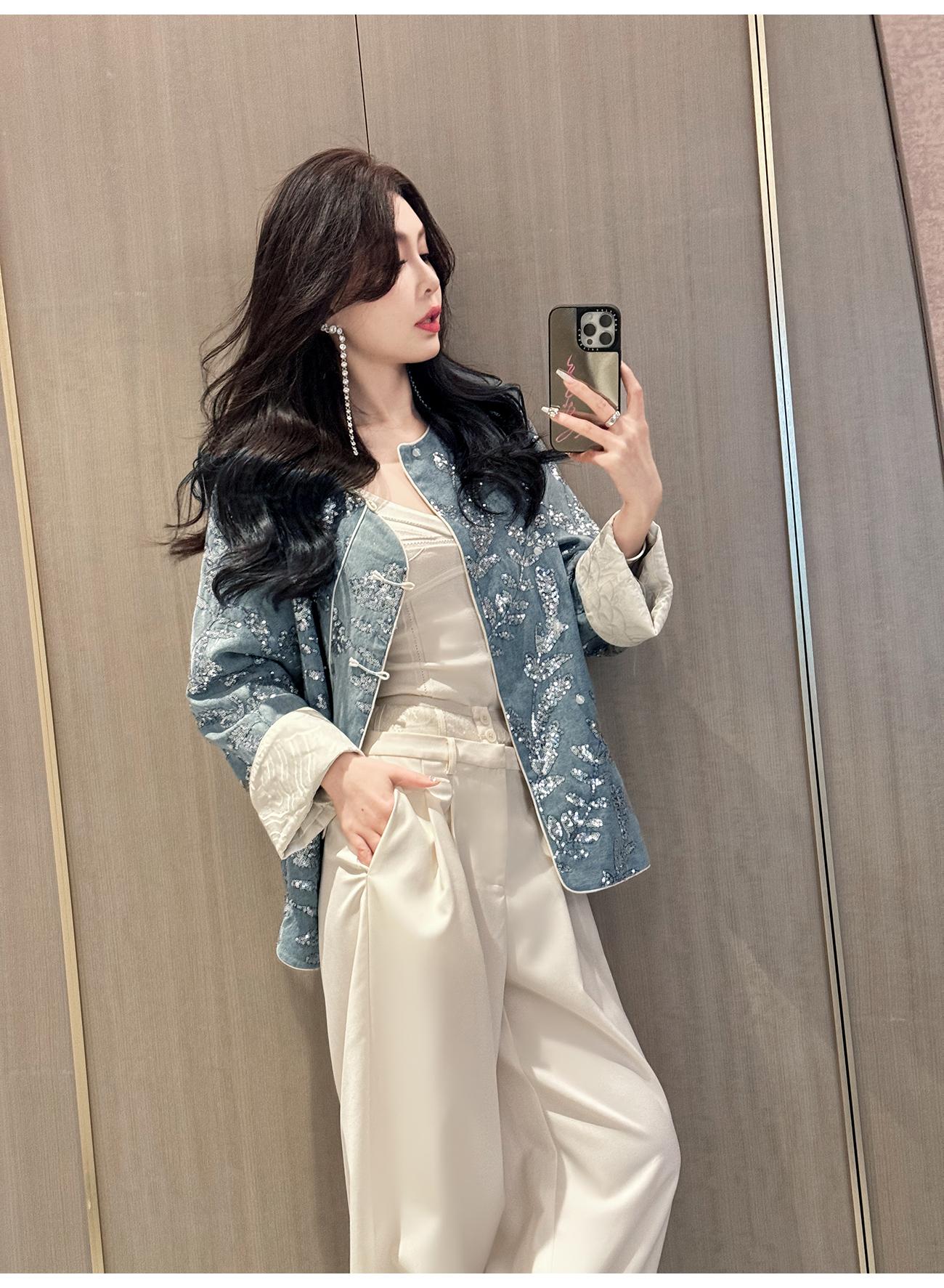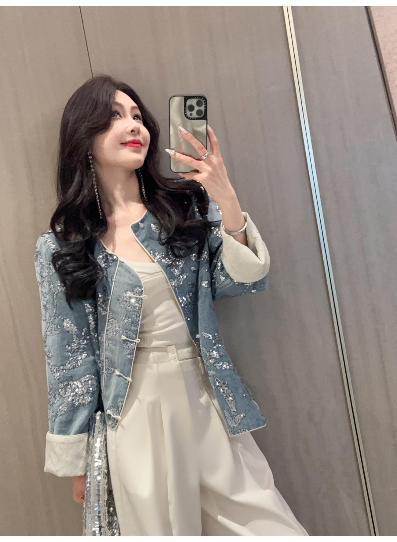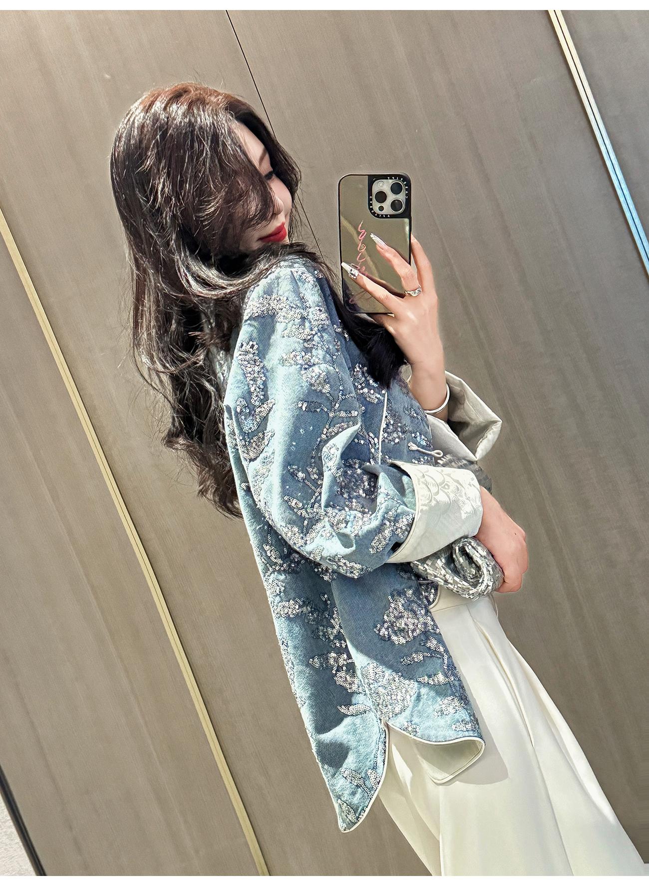 BeQueenStory【暗香浮动】新中式重工珠片绣斜门襟提花水洗牛仔外套