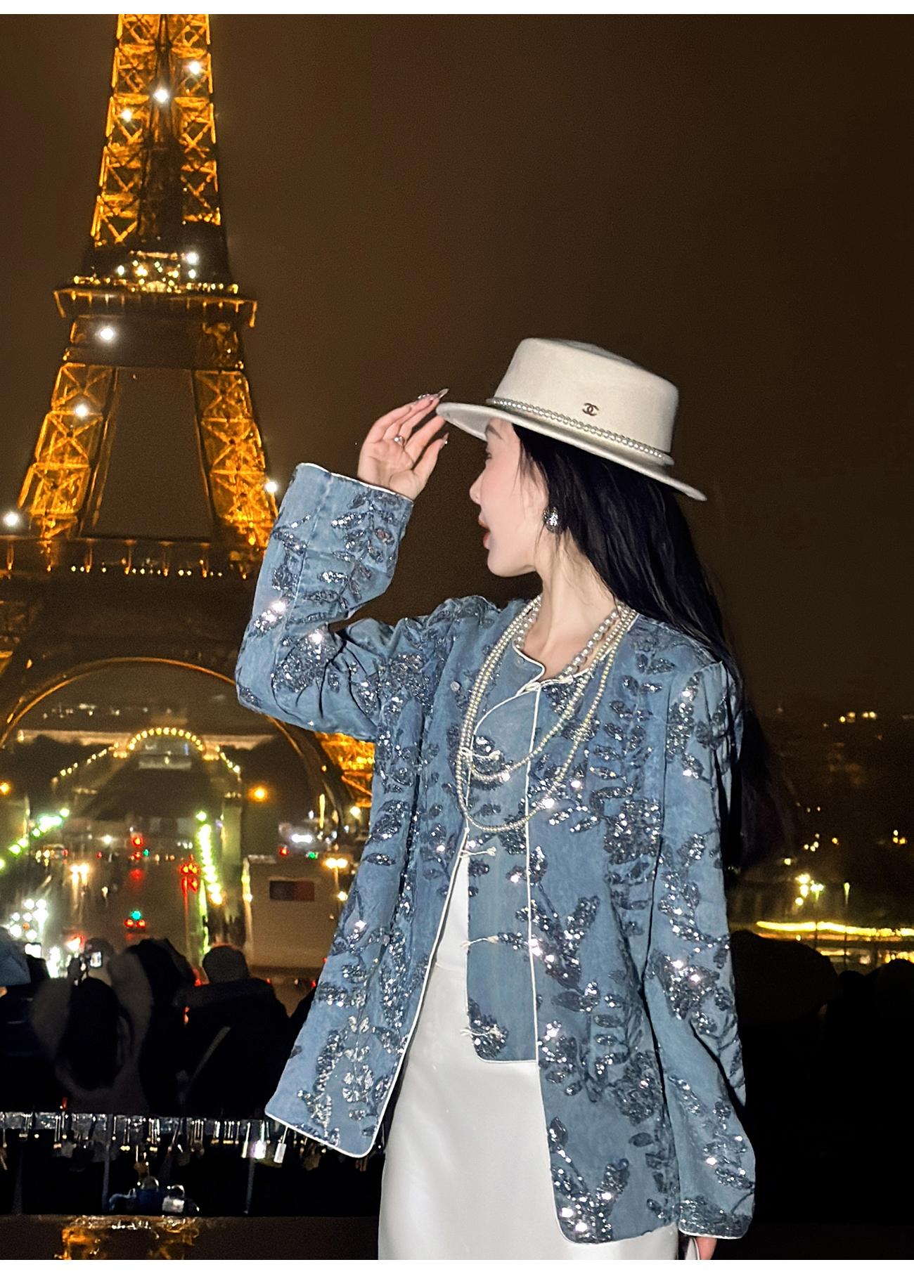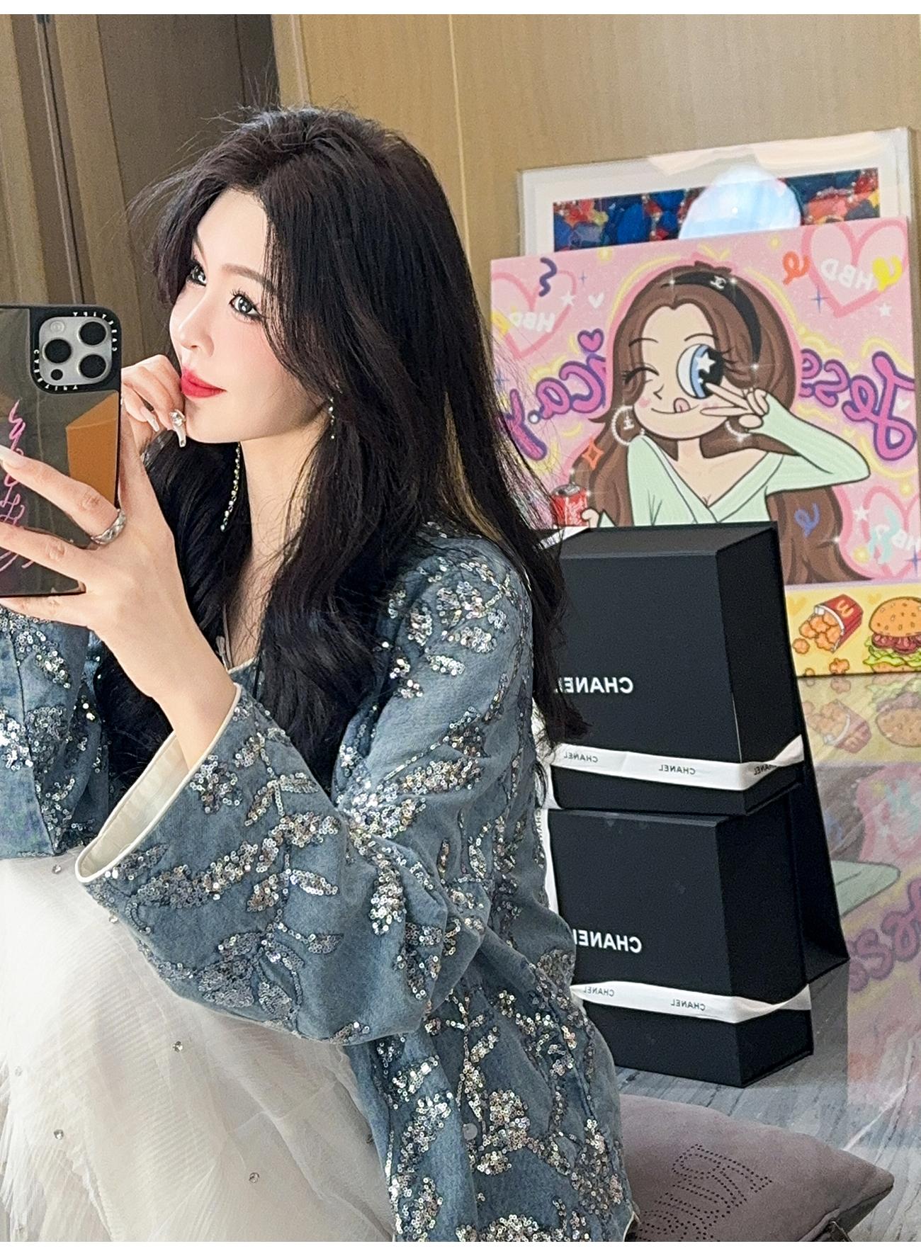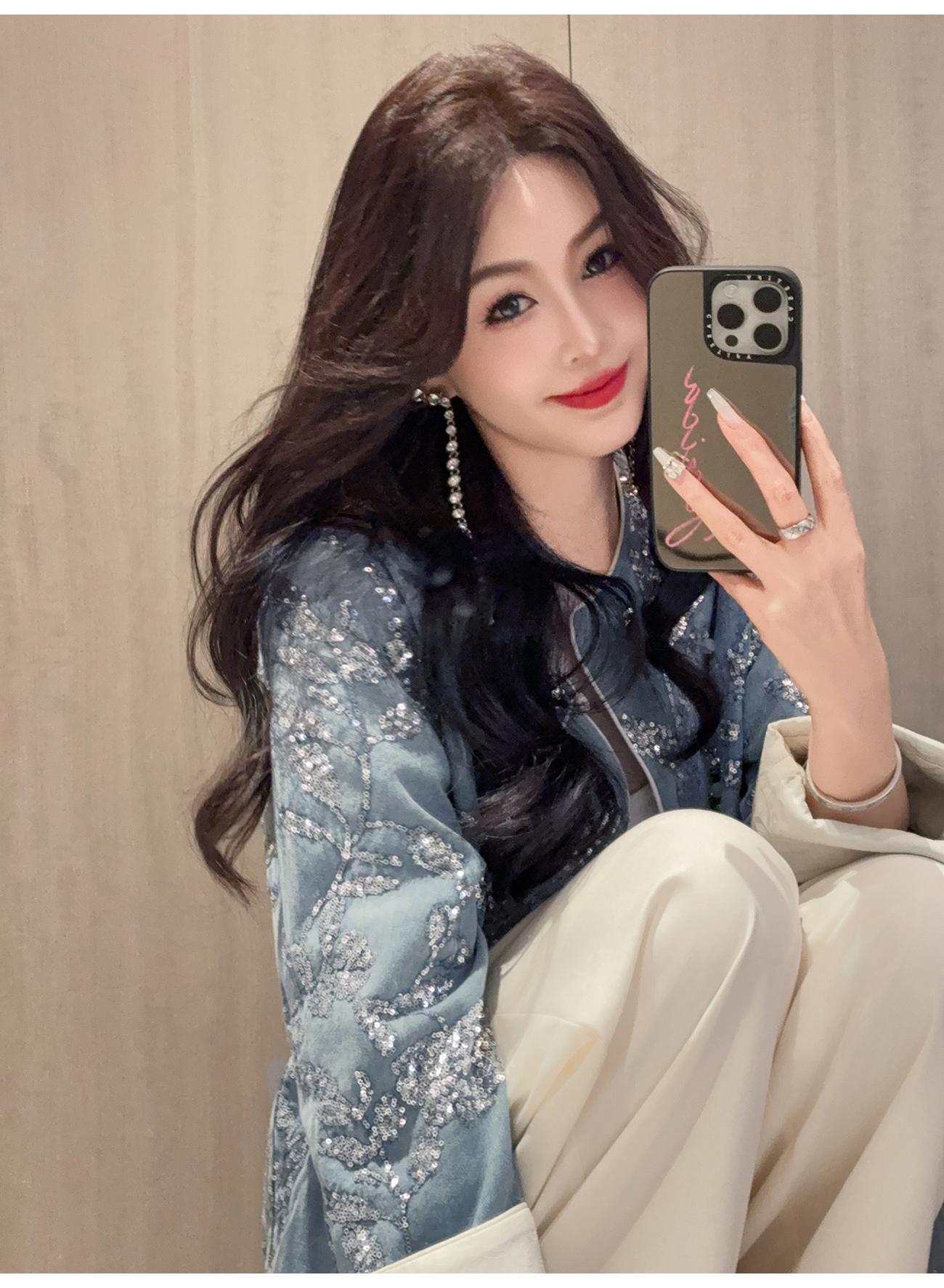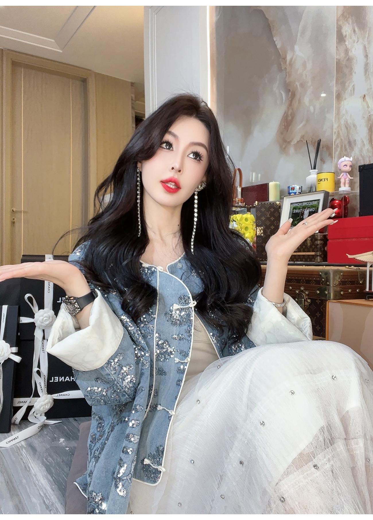 BeQueenStory【暗香浮动】新中式重工珠片绣斜门襟提花水洗牛仔外套