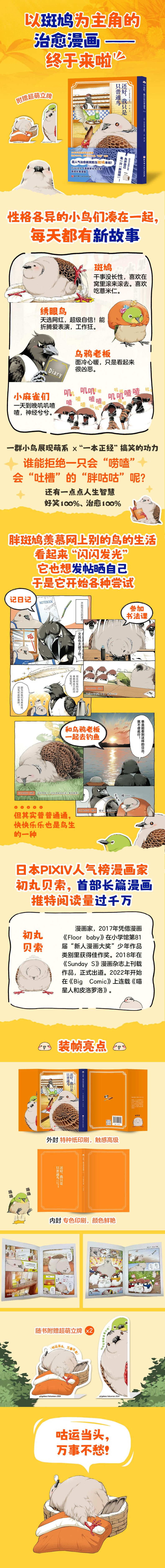 斑鸠看着网上别人的“高光时刻”羡慕得不行,希望自己也能在网络上成为一只“闪闪发光”的鸟。于是开始找素材写日记练习发帖。朋友们也陪它一通“折腾”,在这个过程中笑料百出。但结果是,斑鸠不但没有成为想象中的网红鸟,还差点要了自己的鸟命! 于是它终于发现,其实晒晒太阳,在窝里滚一天,这样普普通通快快乐乐,也是鸟生的一种。 治愈搞笑担当斑鸠+绣眼鸟,还有“看似凶恶,但超腼腆”的乌鸦老板、“神经质”的小麻雀们,一群小鸟展现萌系x“一本正经”搞笑的功力,还有一点点人生智慧 。 做鸟不要那么累,还好,我只是只普通鸟!