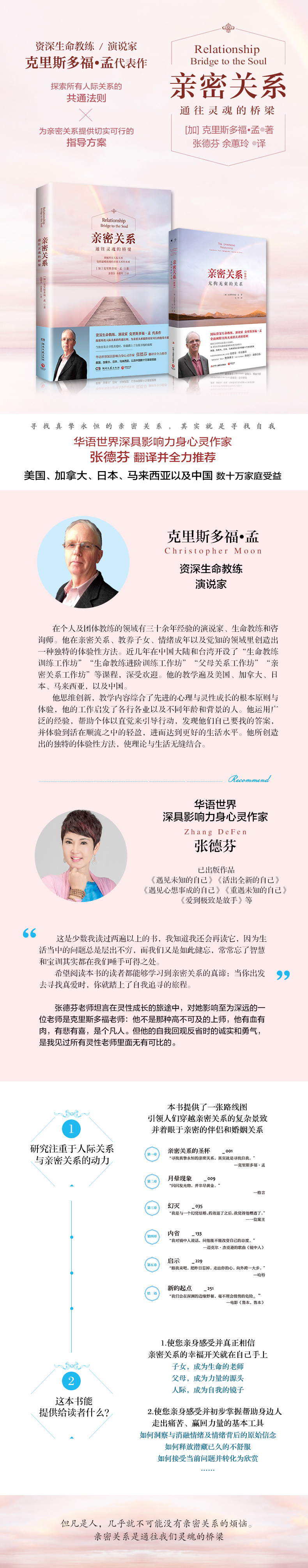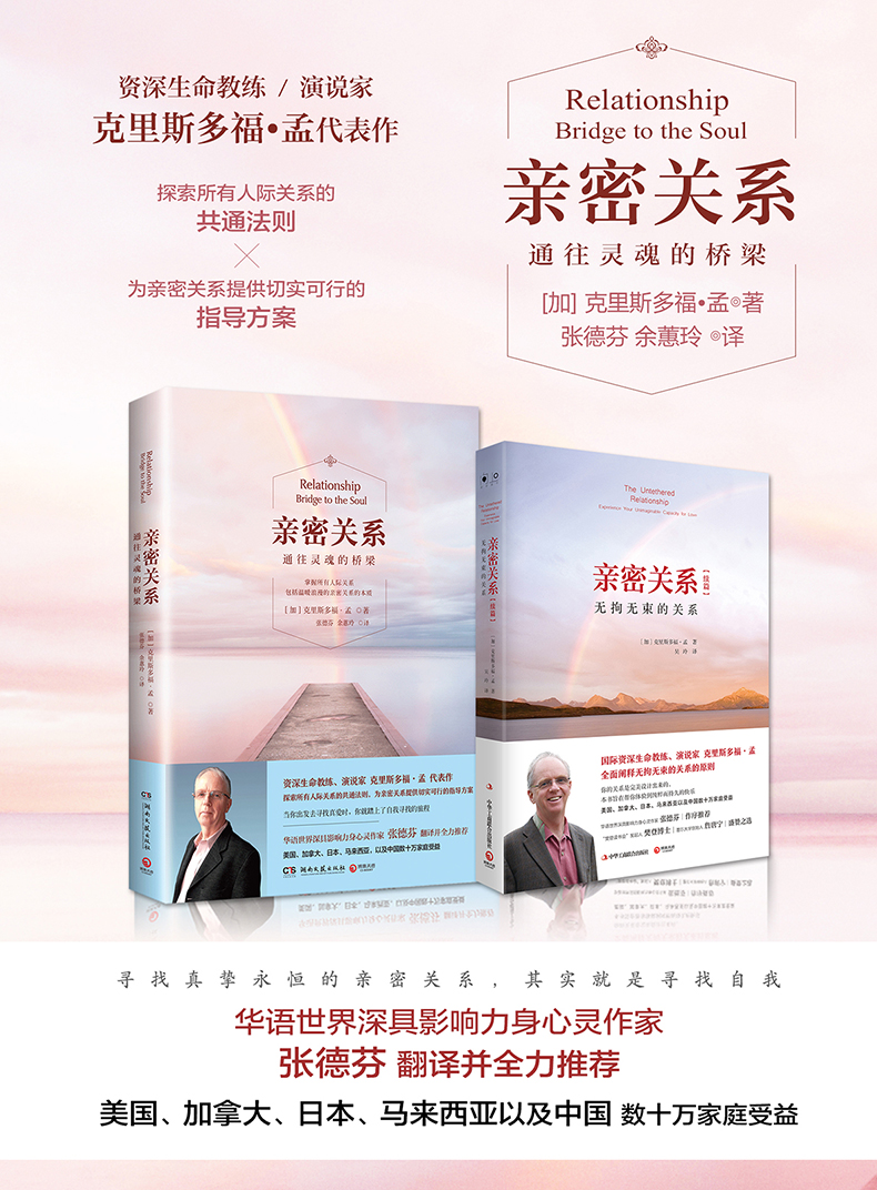 这是我读过两遍以上的书张德芬 作家,著有《遇见未知的自己》《遇见心想事成的自己》《活出全新的自己》真高兴克里斯多福老师的书《亲密关系》要在祖国大陆出版了。我个人在几年前读到这本书的时候,就觉得这是讲述亲密关系的经典之作,任何对亲密关系有兴趣的人都不能错过。 但凡是人,几乎就不可能没有亲密关系的烦恼,亲密关系并不仅限于男女的爱情关系,只要两个人亲密到一定程度,向对方敞开到一定程度,室友、同学、同事、朋友、家人等,都可以算是亲密关系的一种。当然,男女之间的亲密关系是能量、张力强的,因此冲突也,也让人心碎。 克老师的基本观点(这个观点也为众多的心理学家、婚姻专家甚至灵性大师所赞同)是:你的亲密关系伴侣,是来帮助你更加认识自己,进而疗愈你的创伤,终找回真正的自己,因此,亲密关系是通往我们灵魂的桥梁。 克老师把亲密关系的过程分为以下几个阶段:绚丽、幻灭、内省和启示。很多人都会觉得奇怪,为什么当初在绚丽期爱得死去活来的两个人,在幻灭期可以形同陌路或仇人。用简单的语言来说就是,我们通常会把自己从小到大得不到的、未满足的需求,全部投射在那个爱我们、让我们觉得特殊的人身上,觉得有了他(她),这些需求都会得到满足了。 其实这种投射,是把我们理想父母的原型投射在对方身上。当然,世界上不可能有人能满足你所有需求,填补你从小以来的匮乏。然而爱情是如此的盲目,我们的头脑也是会愚弄我们的,在恋爱初期我们欣赏的对方的优点,可能到了后期正是我们想离开他的原因!其中的关键,就在于我们以为对方拥有我们幸福快乐的钥匙,竟然胆敢不给我们。克老师用了很大的篇幅让我们知道,在幻灭期我们和伴侣会用什么样的偏差行为来进行权力斗争,让对方屈从,好让我们自己快乐。 而很多佳偶在幻灭期就阵亡了,他们未能进入内省阶段,看到自己在亲密关系中是如何扮演受害者的角色,而要对方为自己负责。他们未能把亲密关系看成是修行的道场,而在其中成长、学习。 这实在太可惜了。错过了这样成长的机会,下一次的关系可能会再次发生同样的情形,因为你没学会你的人生功课。克老师的书,让我们在幻灭阶段有所觉察,在内省阶段能有所指引,因而获得启示,真是亲密关系艰难旅途中的一盏明灯。 让我感动的是,克老师总是毫不吝惜地与我们分享他自己婚姻生活中遭遇的种种挫折。他的开诚布公,他的谦虚真诚,在字里行间就能打动读者,引起共鸣。 这是少数我读过两遍以上的书,我知道我还会再读它,因为生活当中的问题总是层出不穷,而我们又是如此健忘,常常忘了智慧和宝训其实都在我们唾手可得之处。 希望阅读本书的读者都能够学习到亲密关系的真谛:当你出发去寻找真爱时,你就踏上了自我追寻的旅程。祝愿我们的旅程都一路丰收到终点!