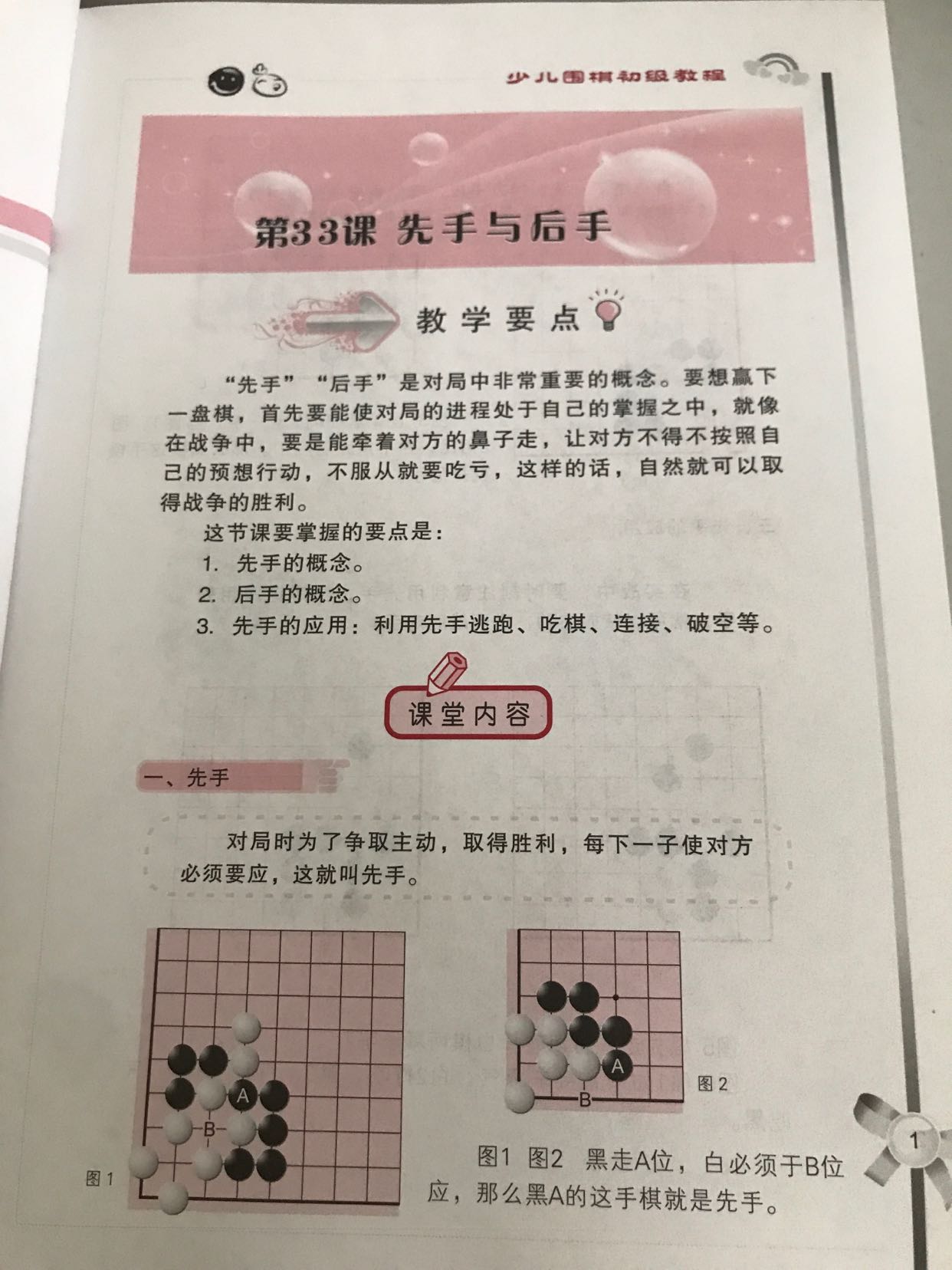 书名:少儿围棋初级教程-下册 价:35元 作者:马晓春 主编 出版社:天津科学技术出版社 出版日期:2009-08-01 ISBN:9787530851920 字数:237500 页码:249 版次:1 第33课 先手与后手