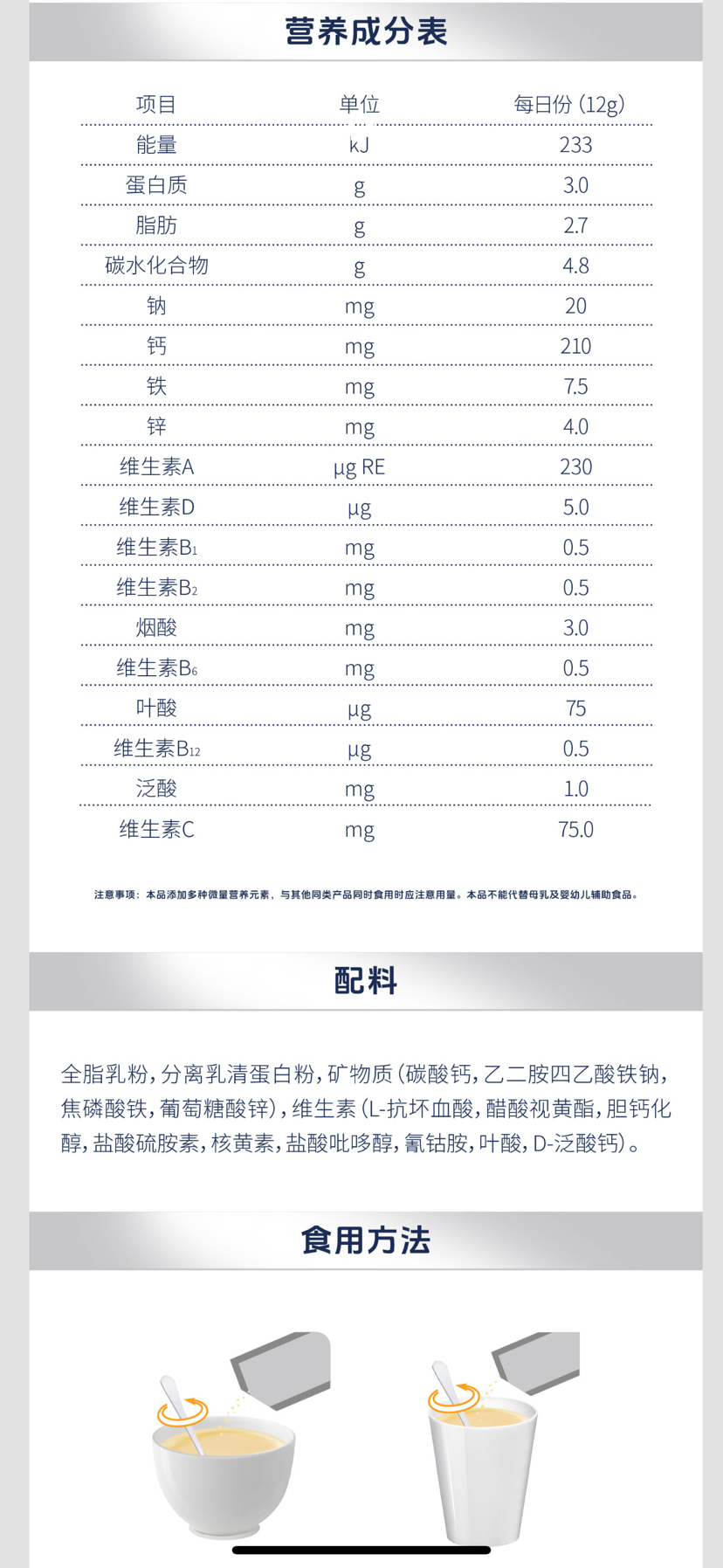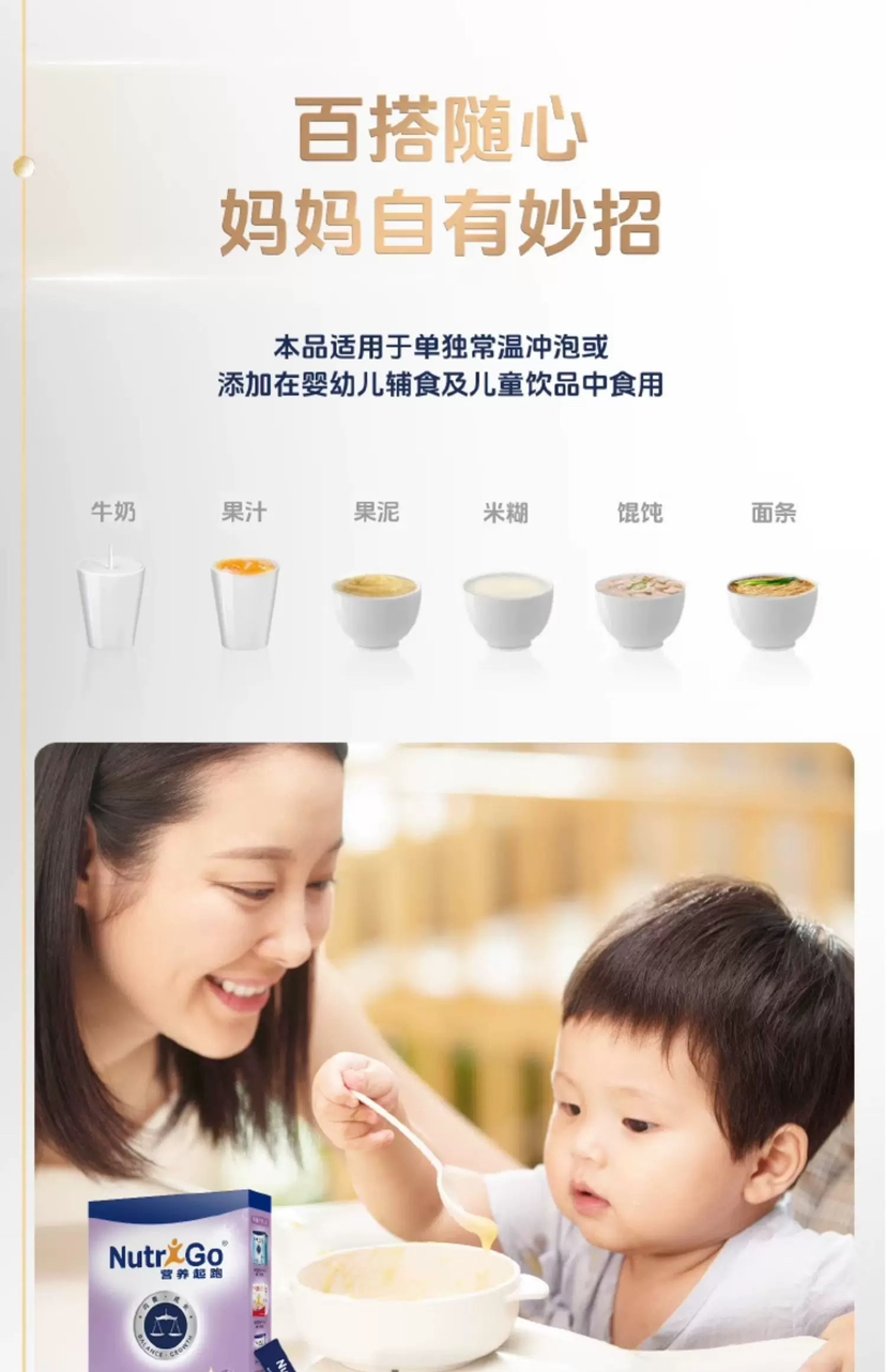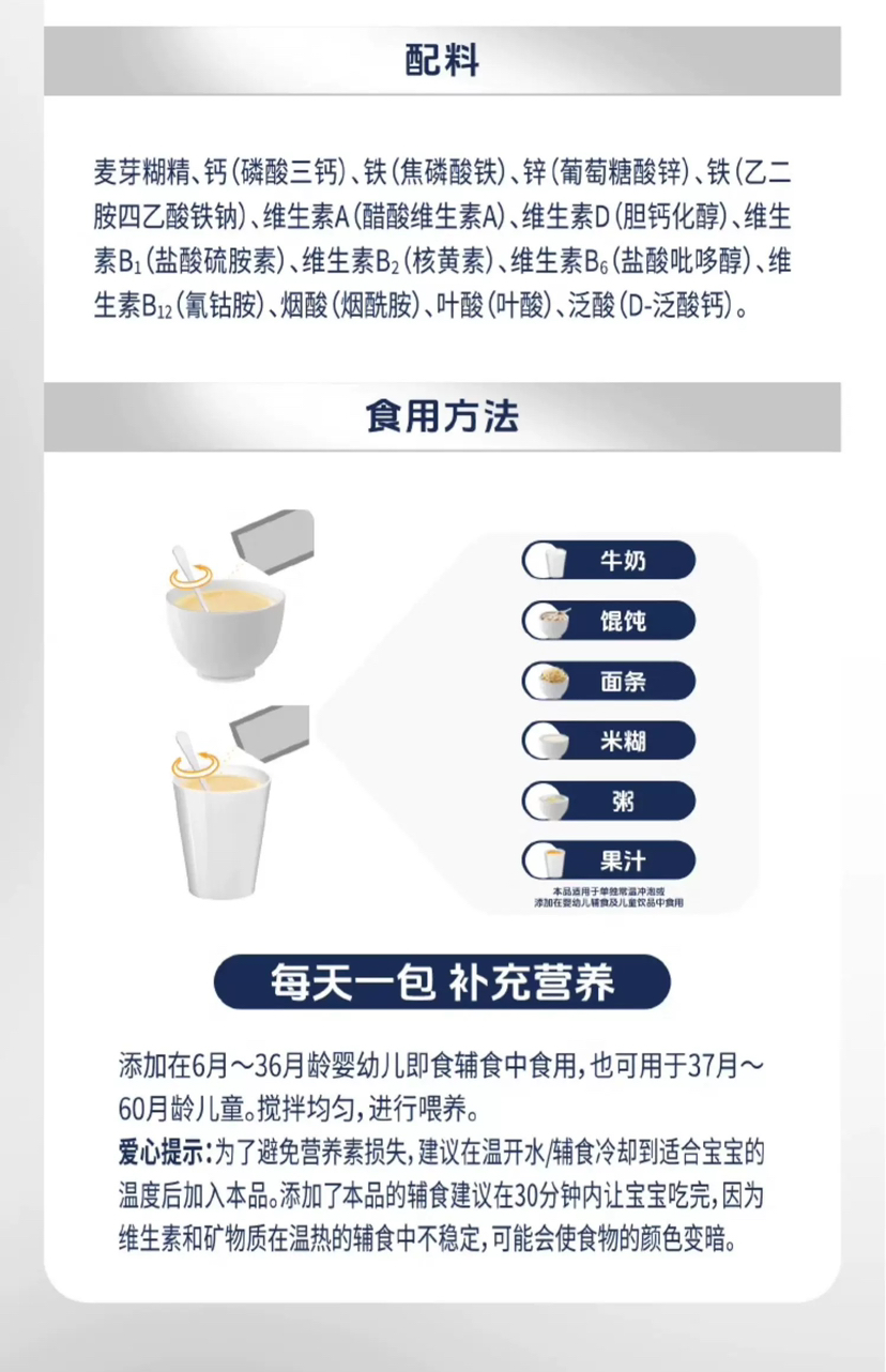 适合6个月以上【加入温水或者奶粉、面条等辅食中(温度低于50℃),搅拌均匀进行喂养】