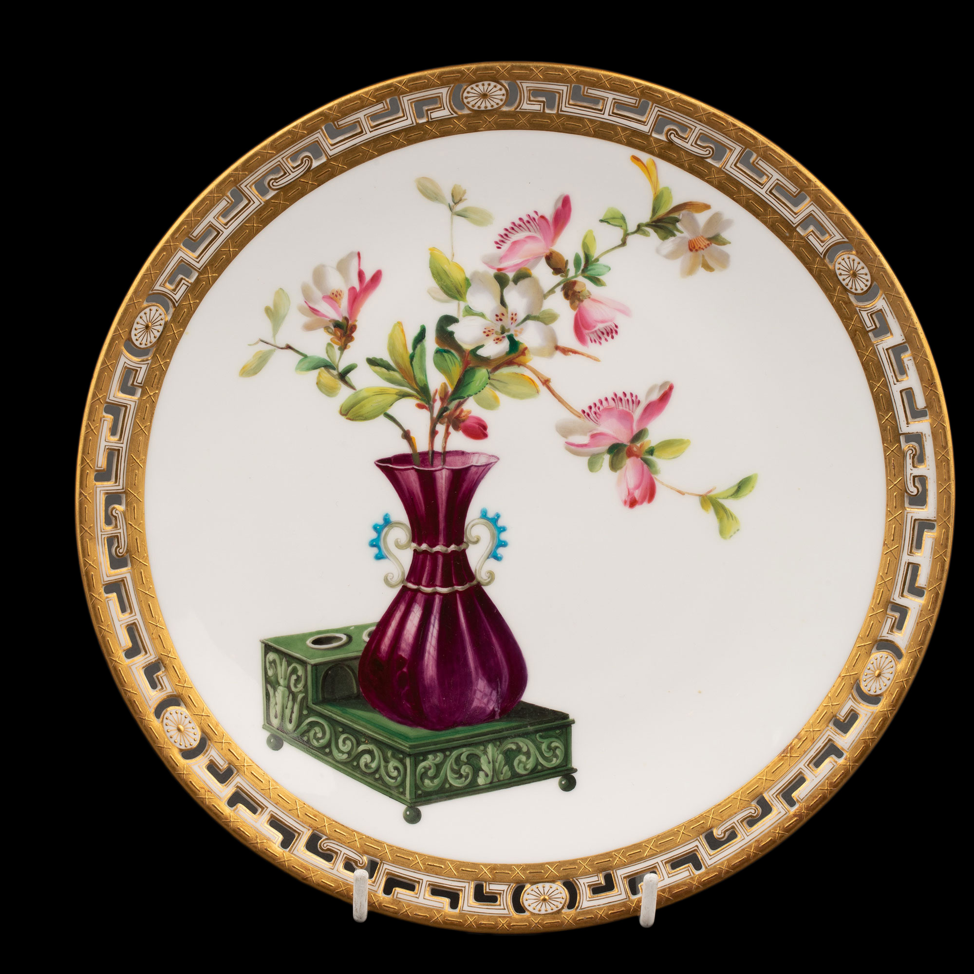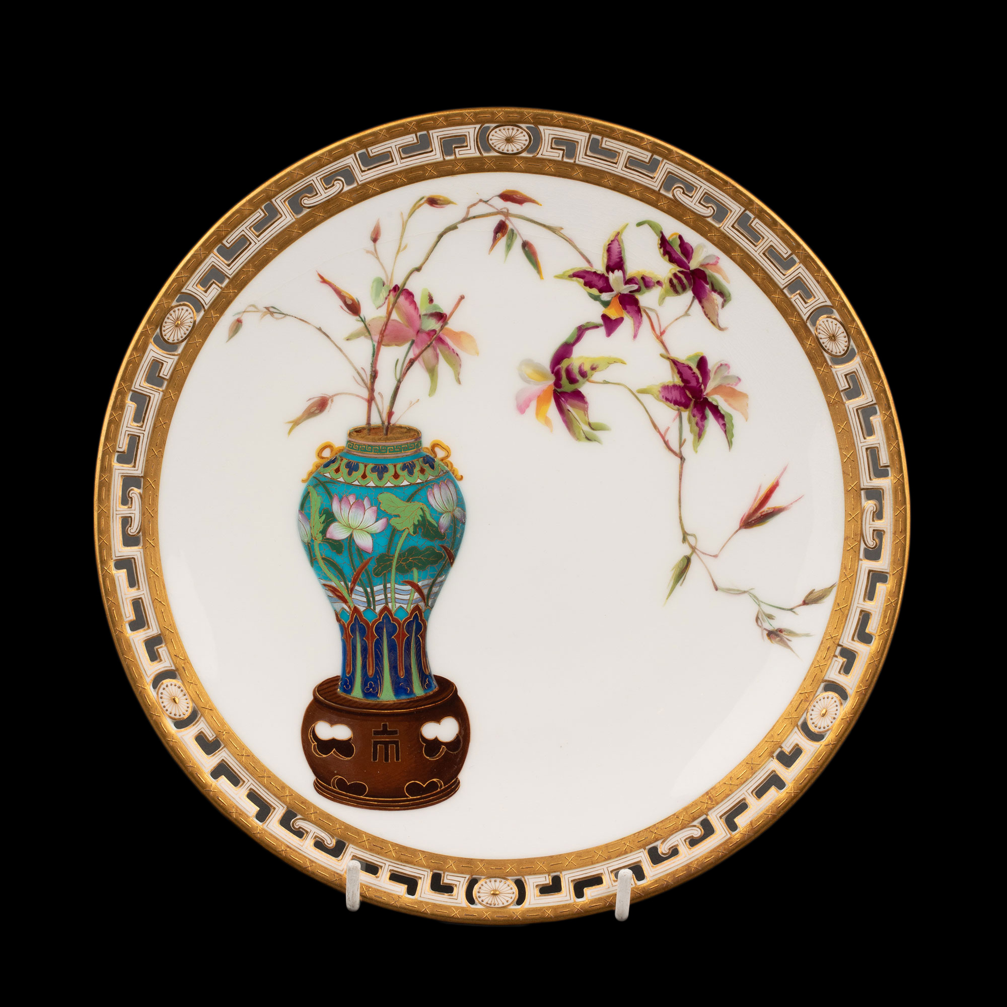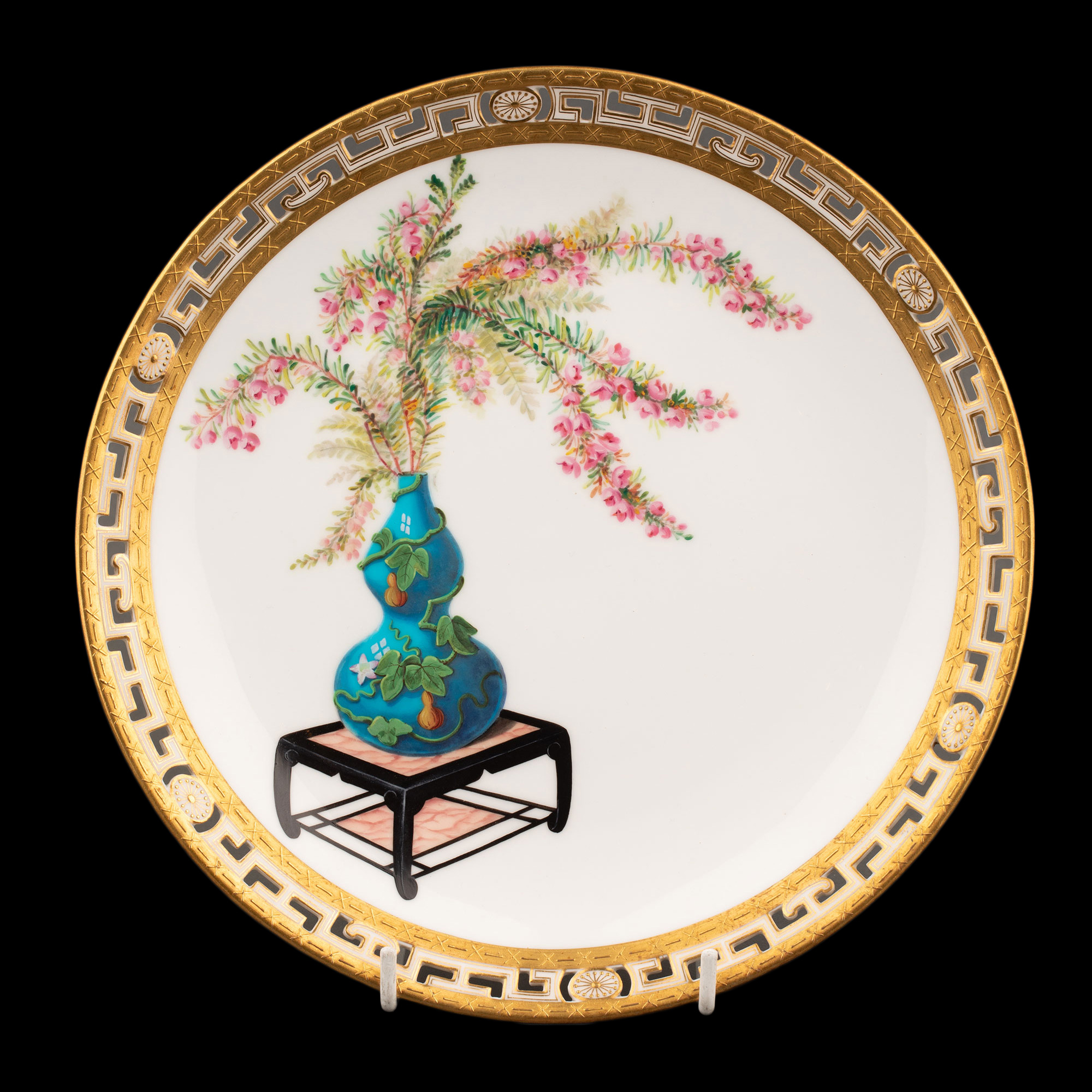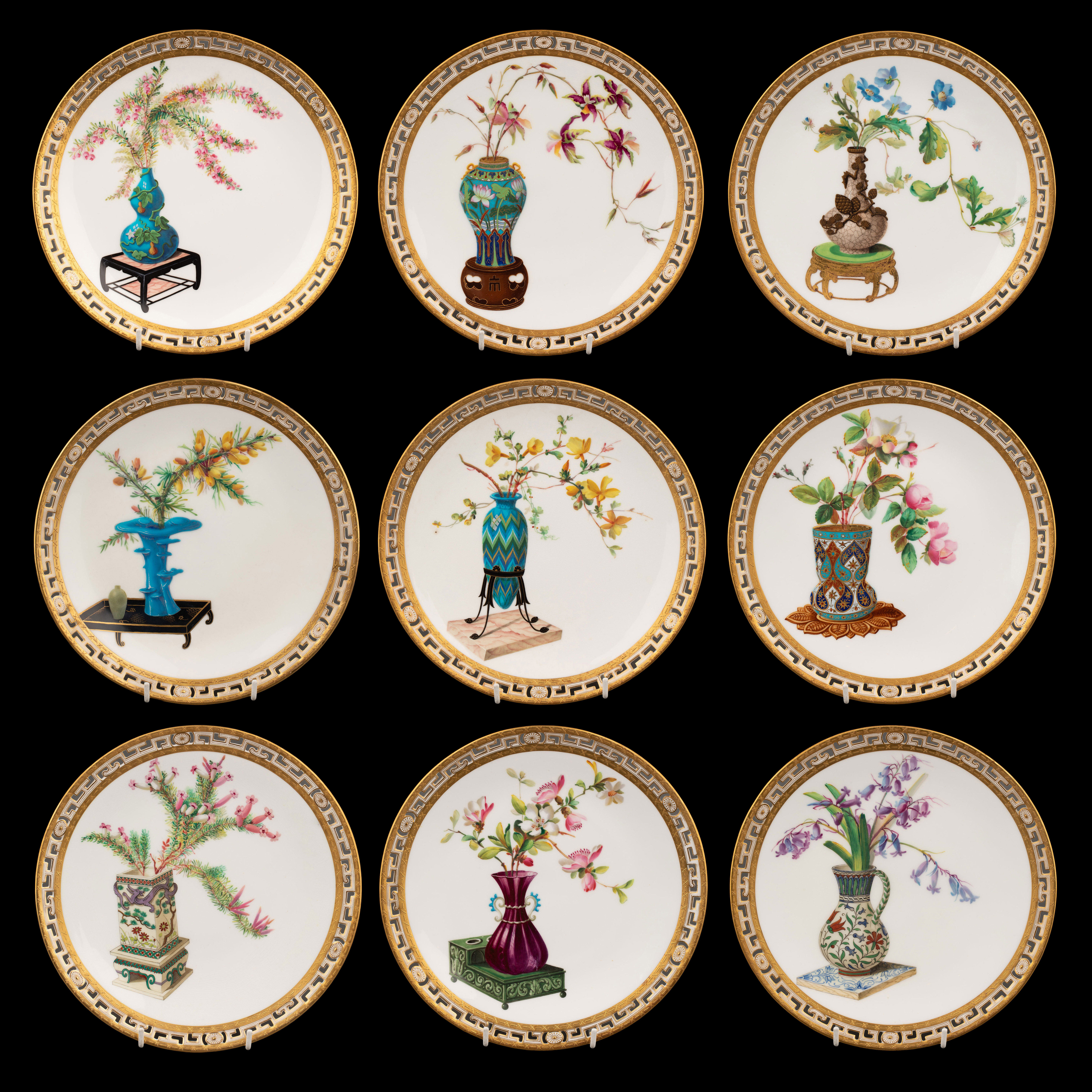 1880年代英国顶级陶瓷品牌明顿Mintons出品东方瓶花主题鎏金彩绘陶瓷赏盘九件套