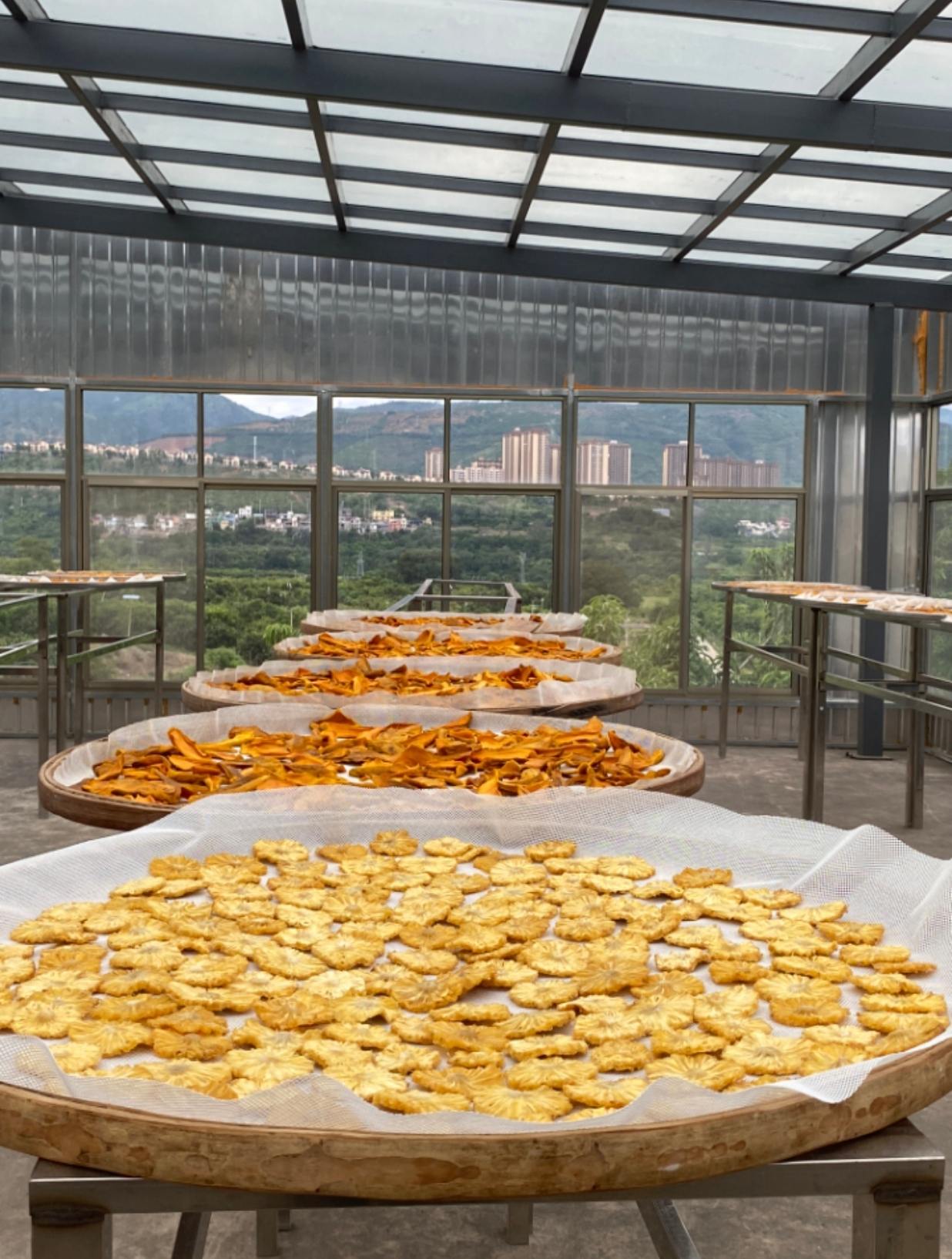 低温干燥或阳光房晾晒:若天气晴朗,凤梨干拿到阳光房晾晒——充分吸收云南太阳的能量,下雨天或者晚上,使用低温干燥机干燥。