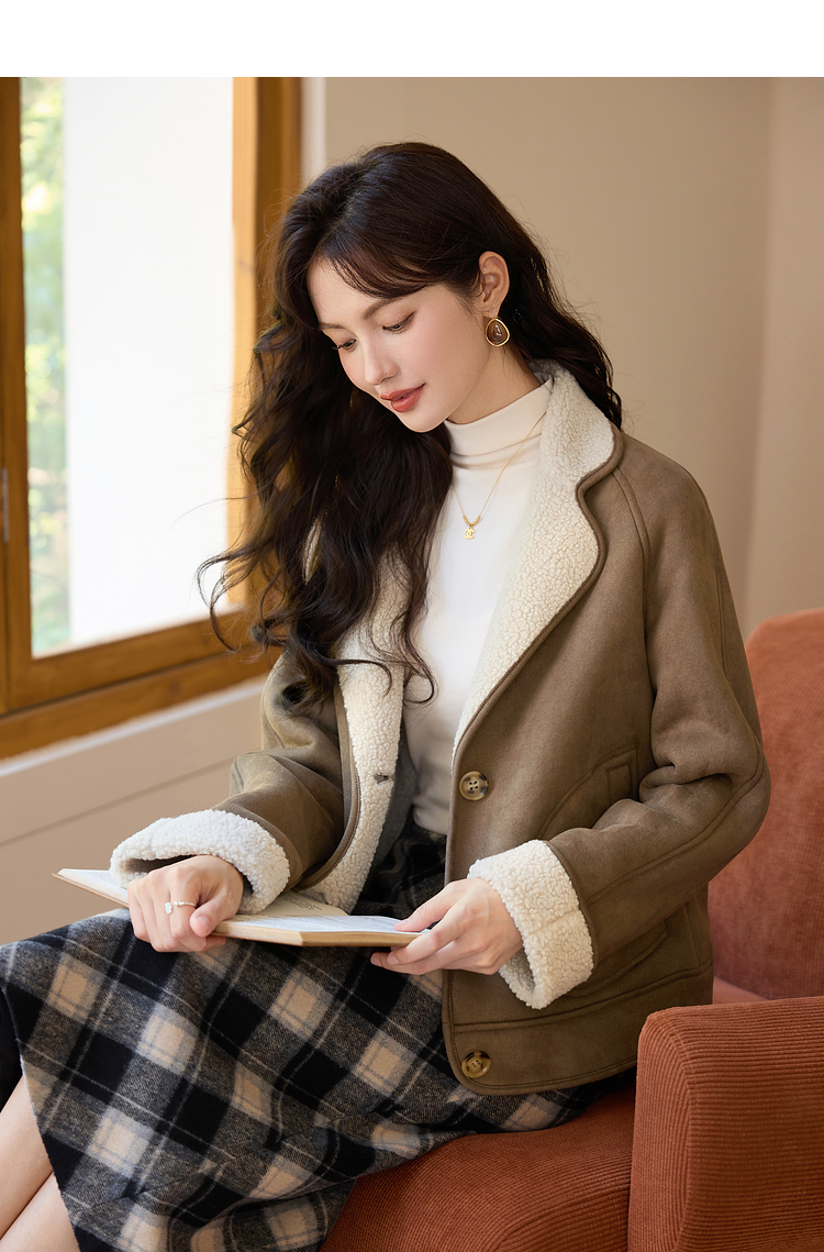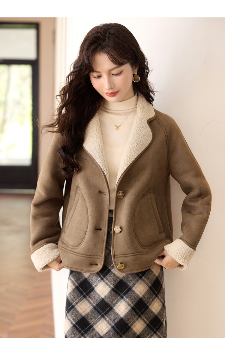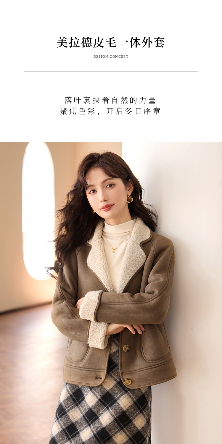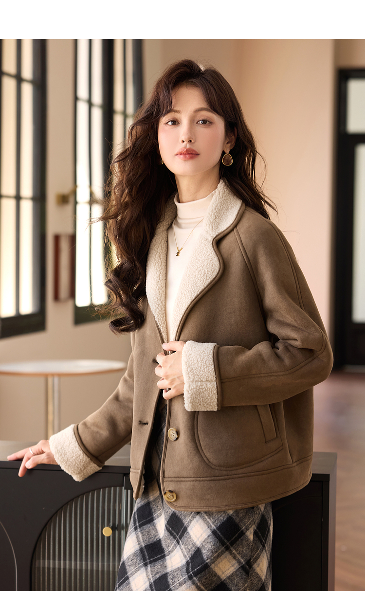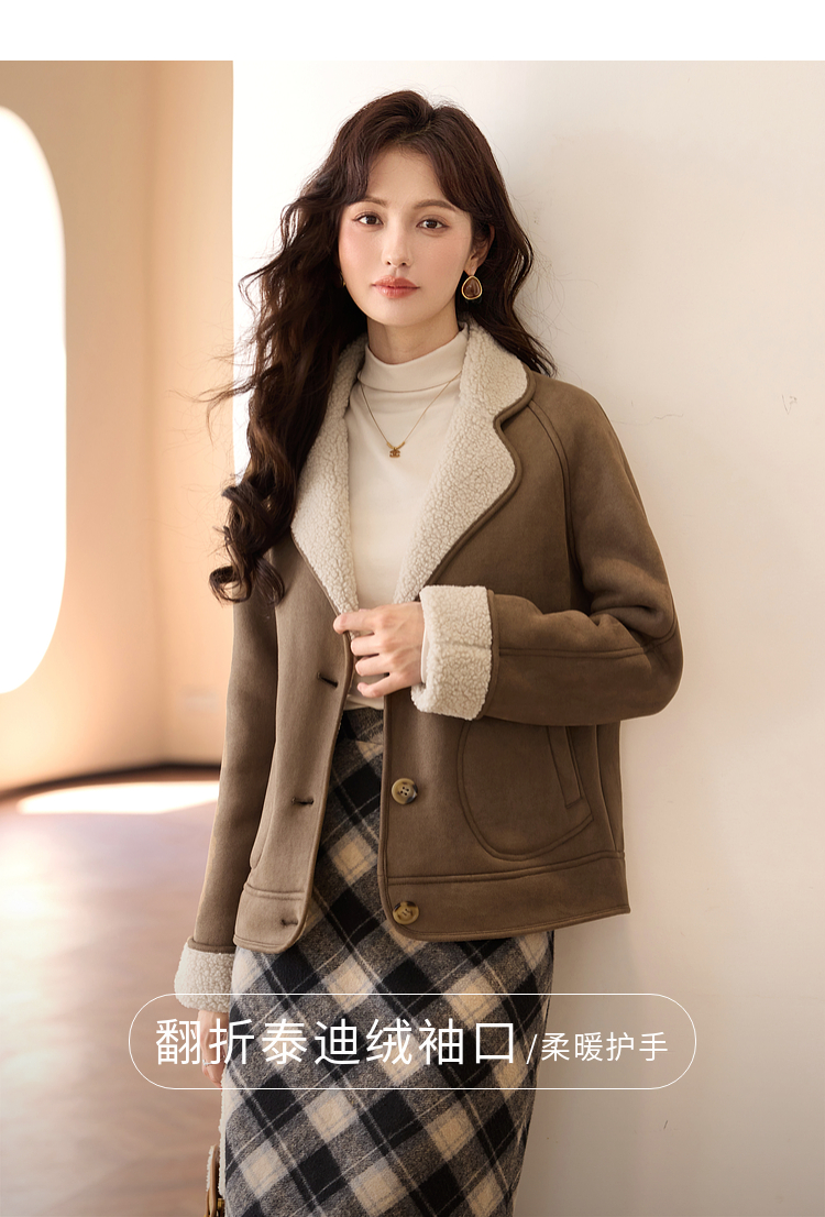 【年终特卖】熙世界美拉德麂皮绒短外套冬季新款小个子加厚保暖皮毛一体大衣