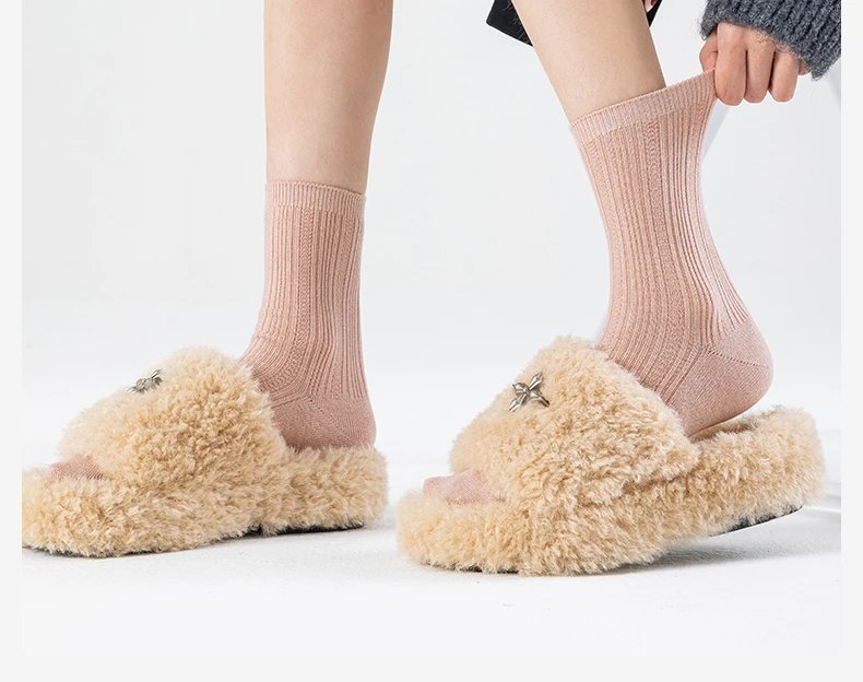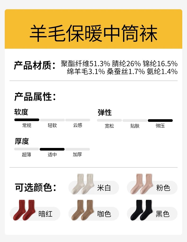 女袜: 袜底部位:51.3%聚酯纤维 26%腈纶 16.5%锦纶 3.1%绵羊毛 1.7%桑蚕丝 1.4%氨纶