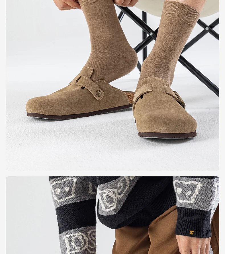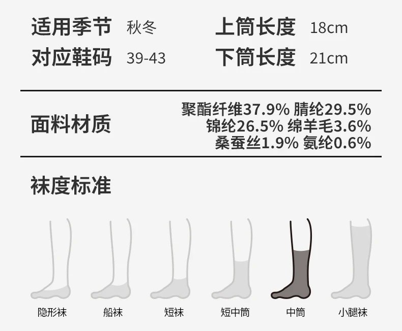 男袜: 脚面部位:37.9%聚酯纤维 29.5%腈纶 26.5%锦纶 3.6%绵羊毛 1.9%桑蚕丝 0.6%氨纶