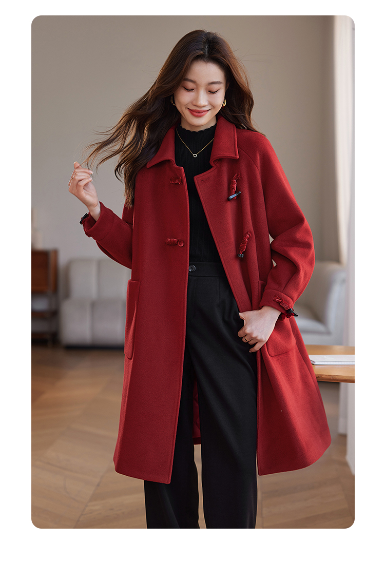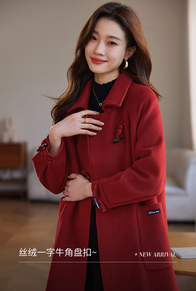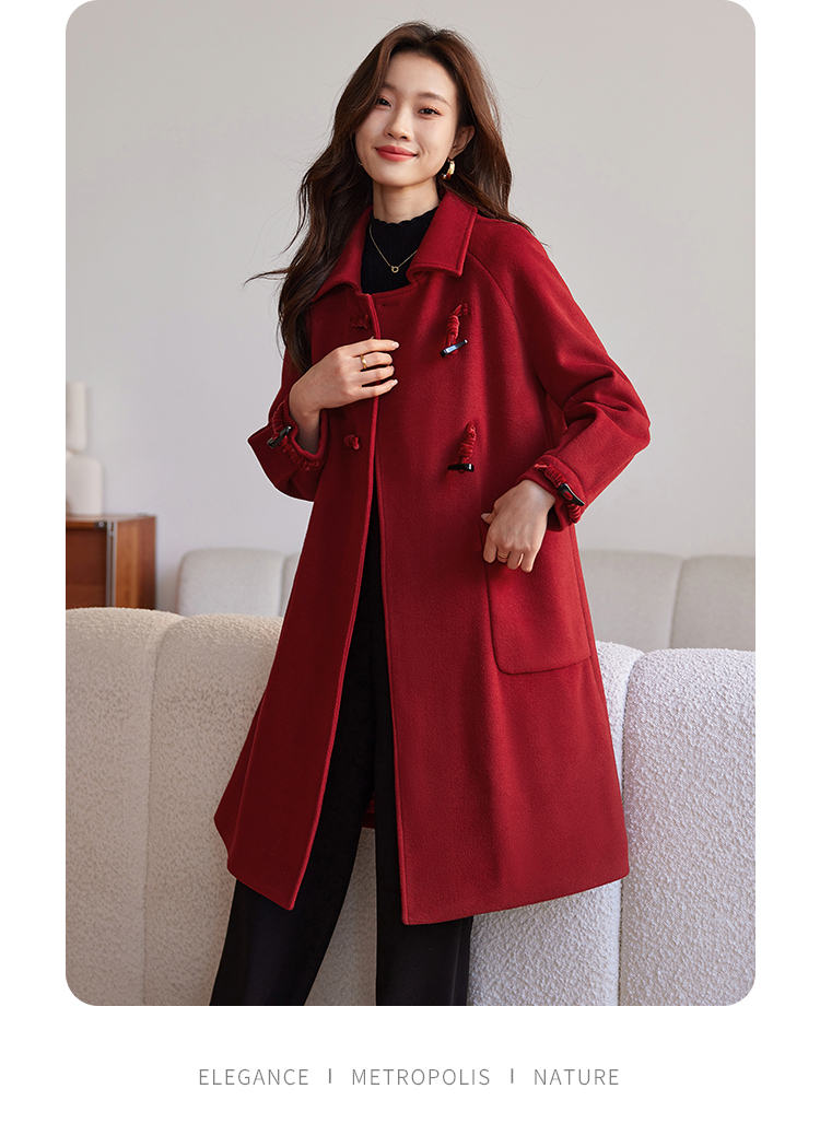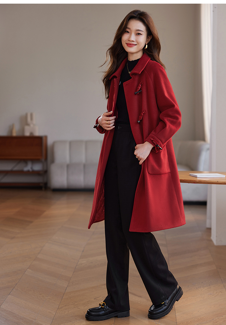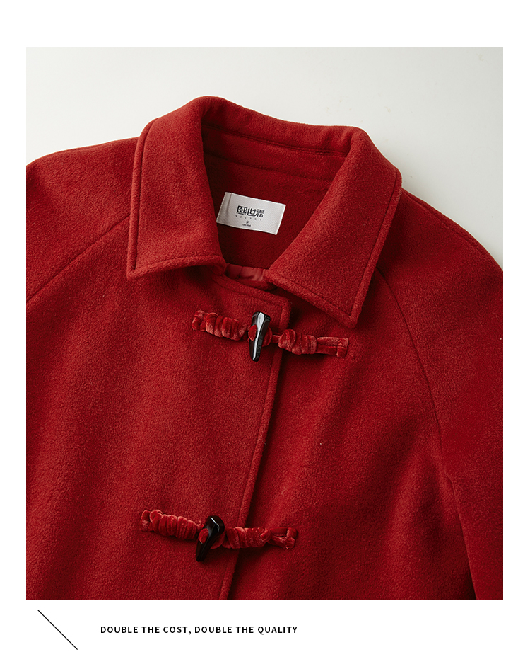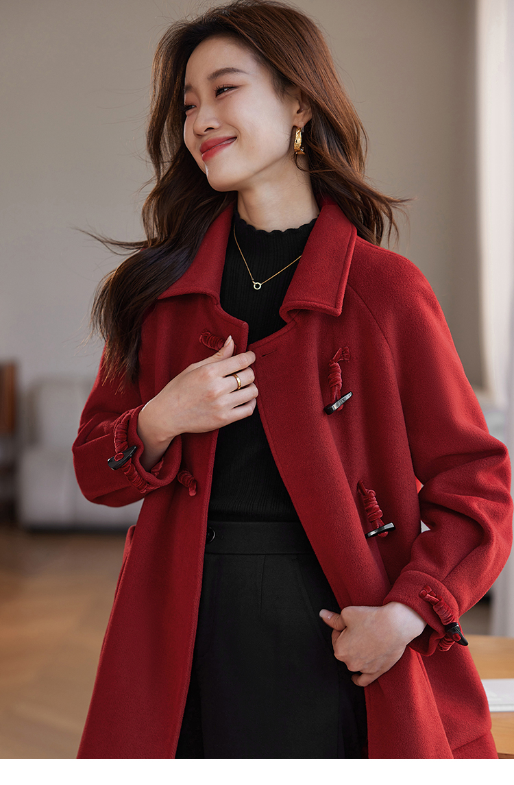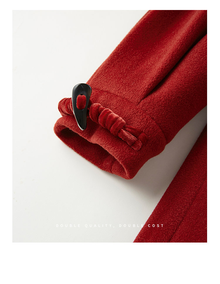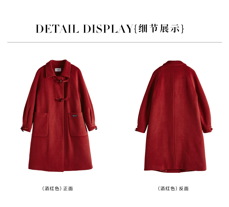 【年终特卖】熙世界红色牛角扣毛呢大衣设计感秋冬款加厚夹棉呢子外套中长款