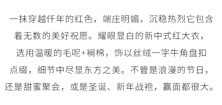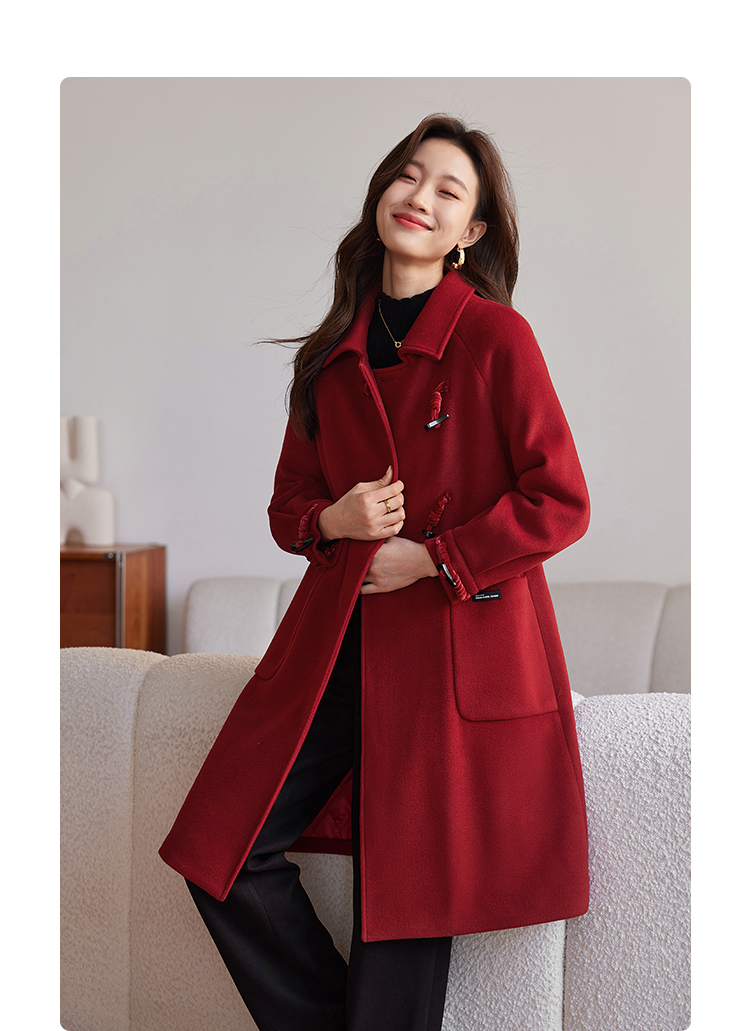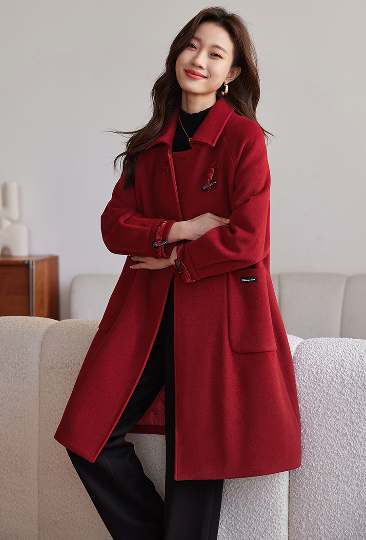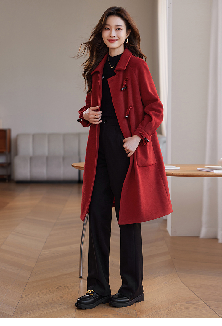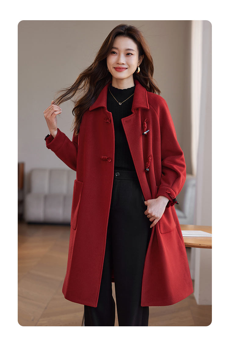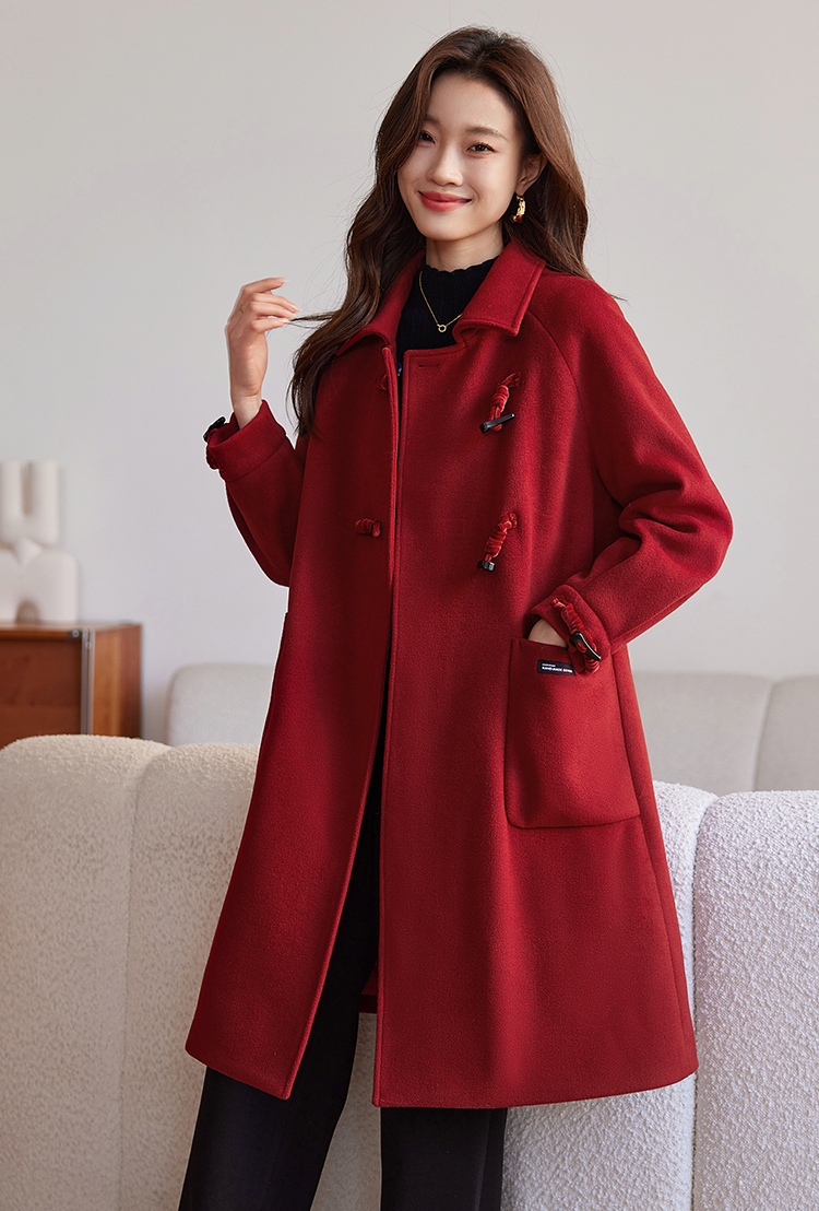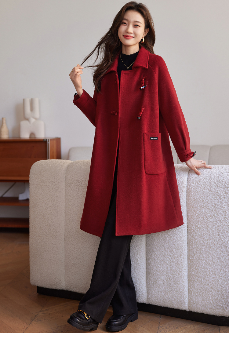 【年终特卖】熙世界红色牛角扣毛呢大衣设计感秋冬款加厚夹棉呢子外套中长款