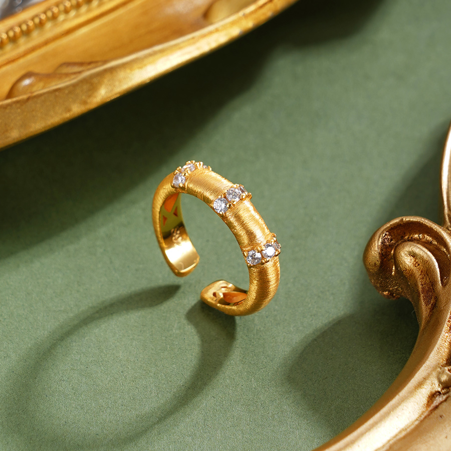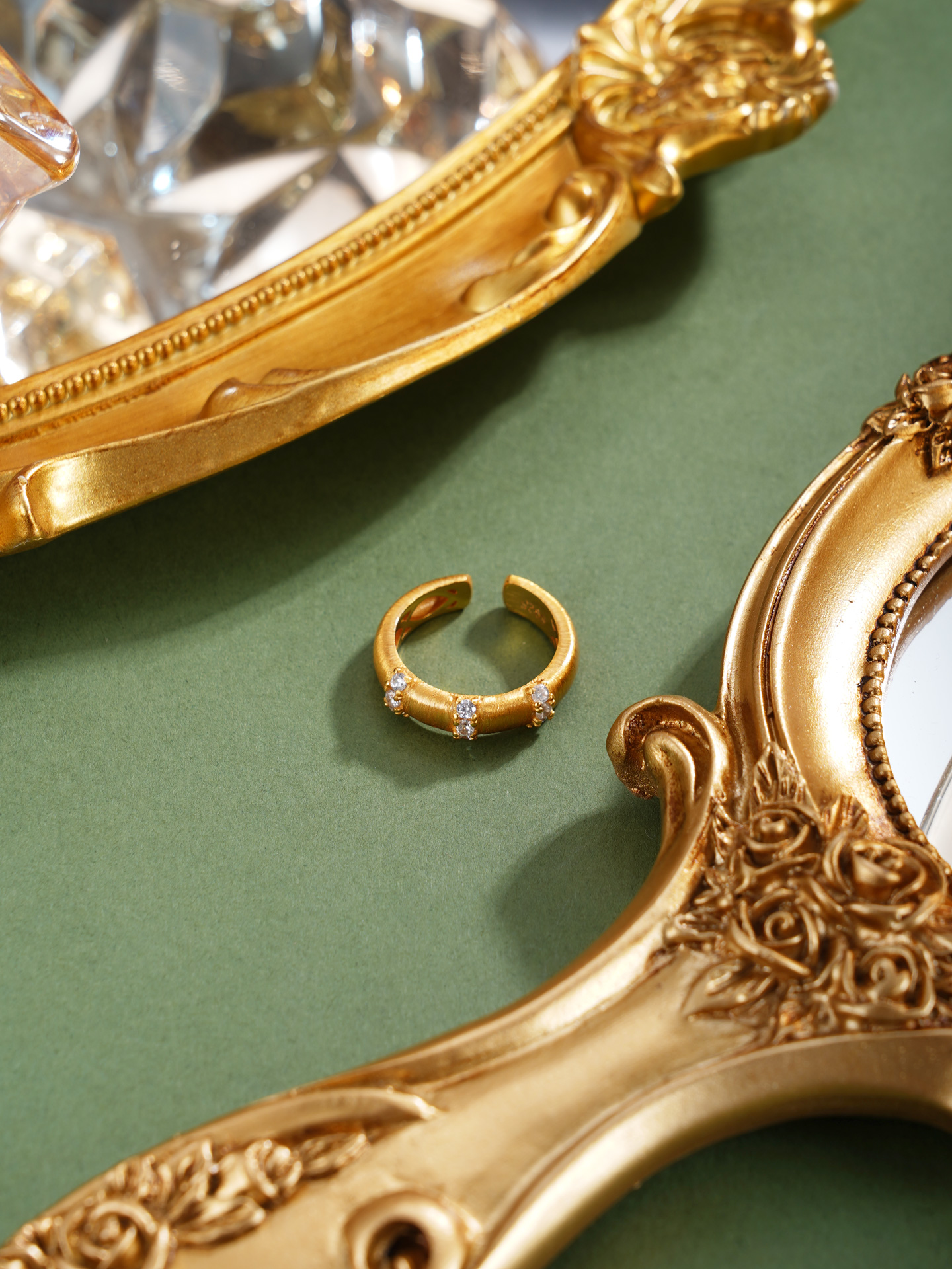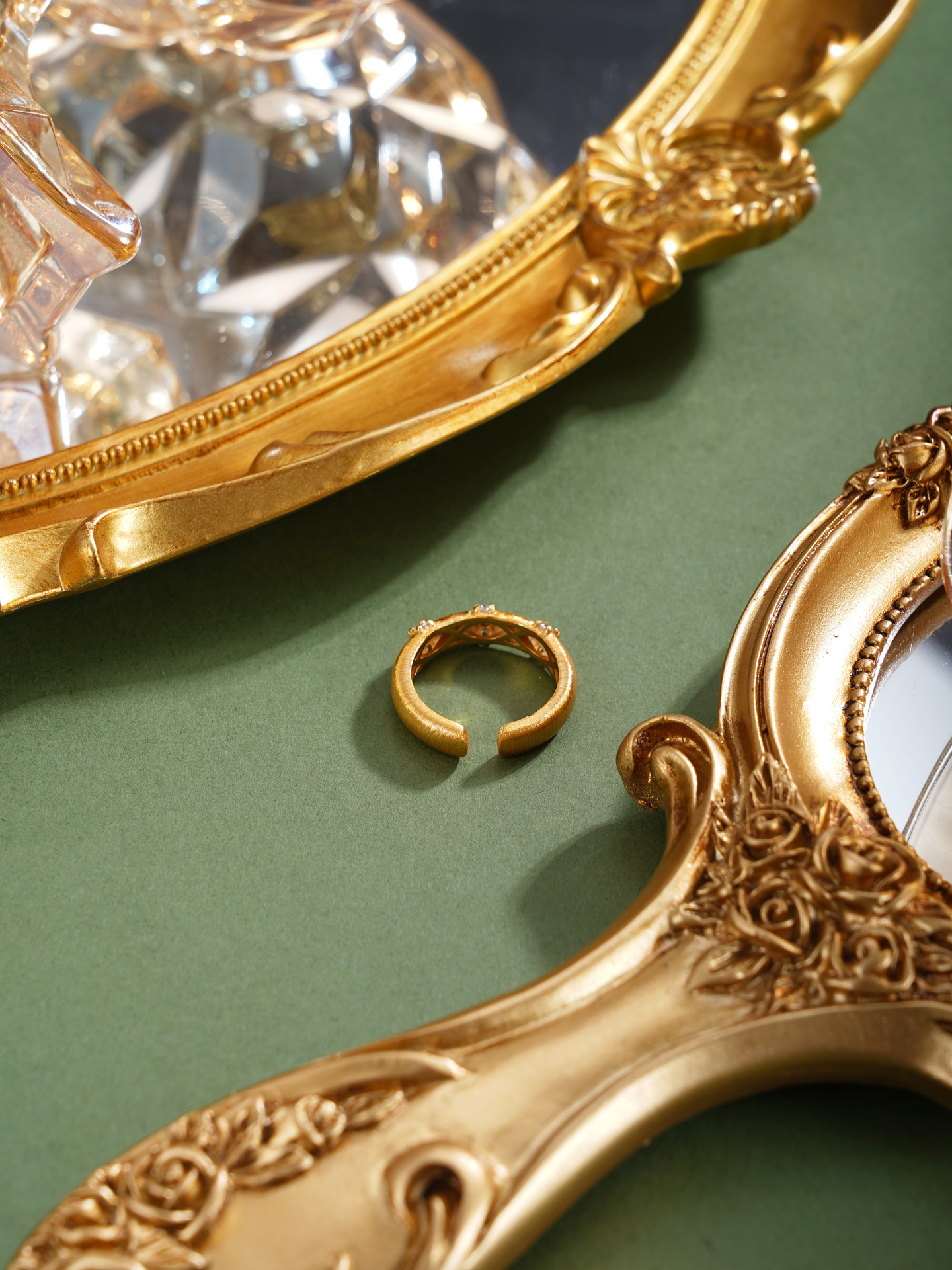 【寓意】:纯银镀金镀金戒指,镶嵌细闪锆石,福运之间流转,寓意年华永驻,璀璨生姿。