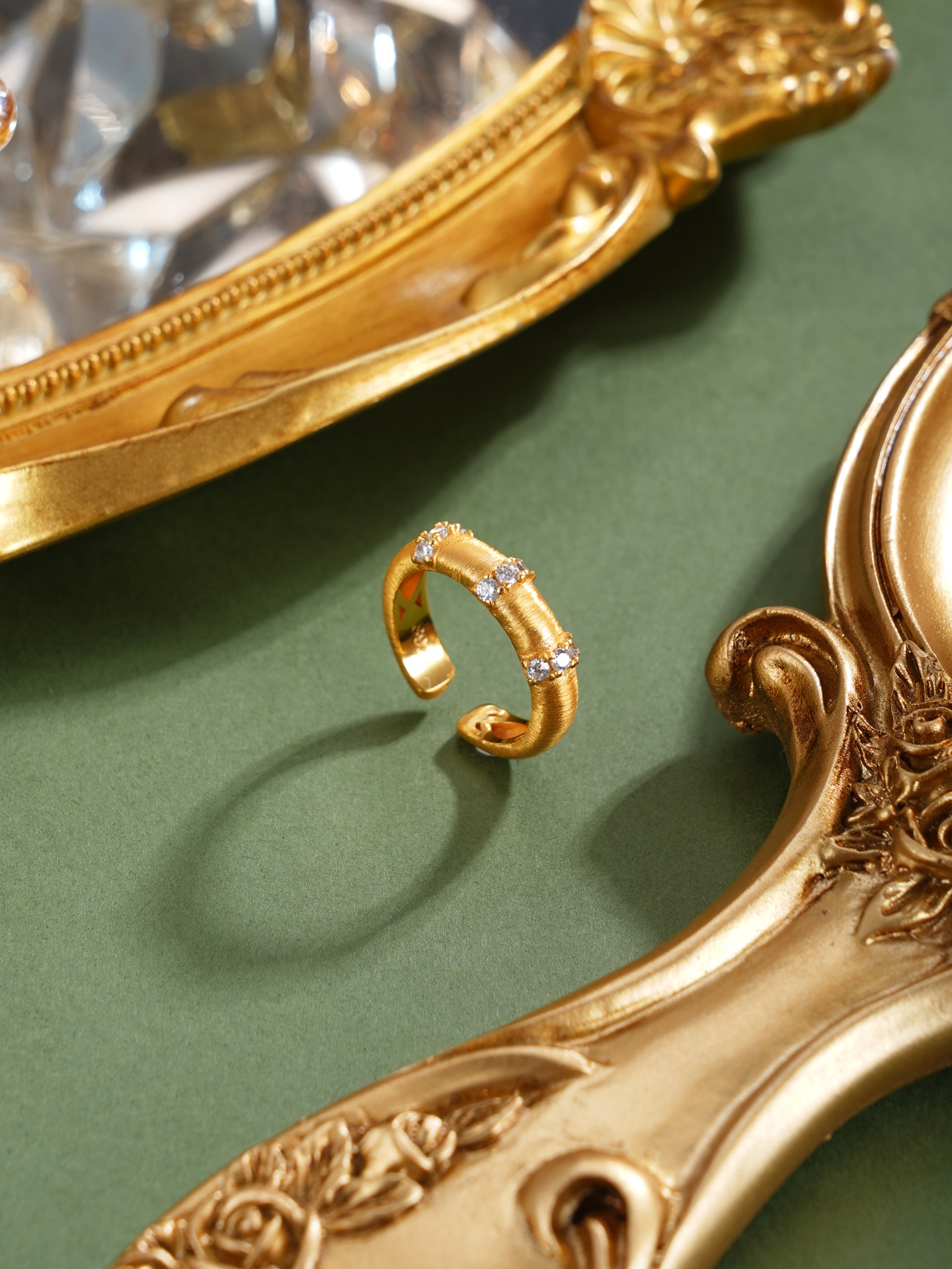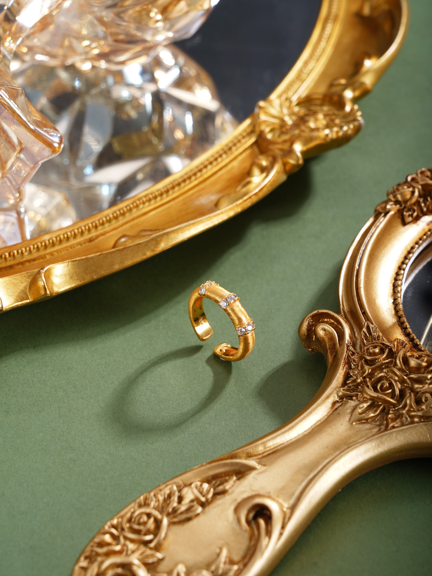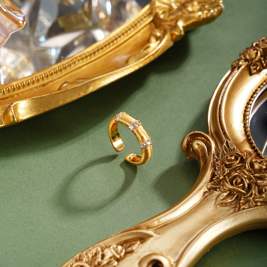 【寓意】:纯银镀金镀金戒指,镶嵌细闪锆石,福运之间流转,寓意年华永驻,璀璨生姿。