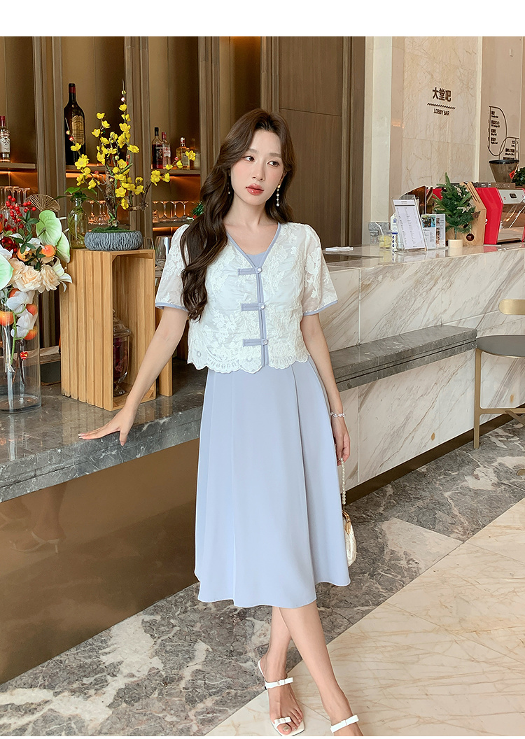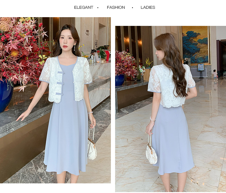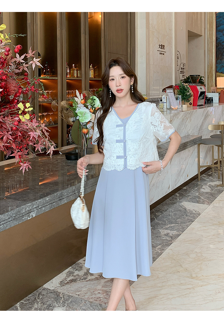 奢姿大码女装2026夏季减龄绣花V领两件套胖妹妹花边甜美时尚套装9962972006