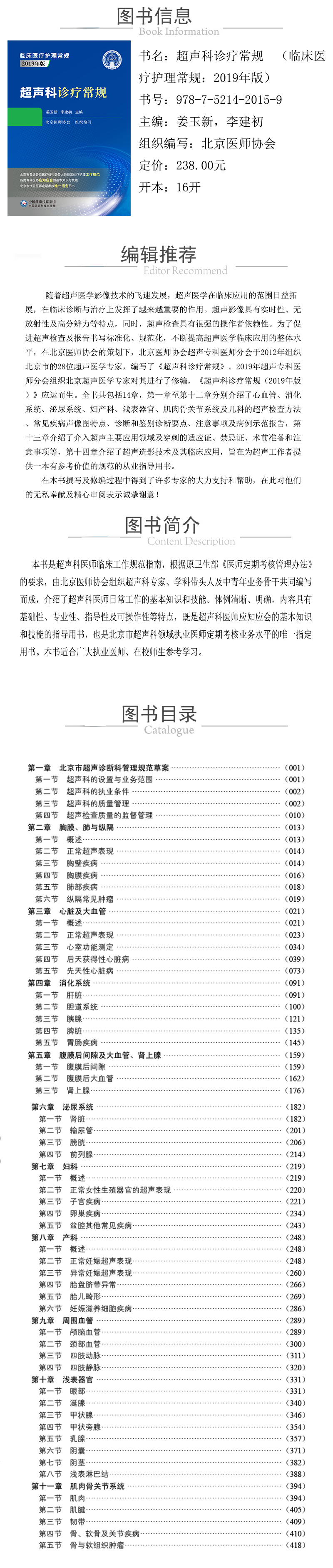 《超声科诊疗常规》是超声科医师临床工作规范指南,根据原卫生部《医师定期考核管理办法》的要求,由北京医师协会组织超声科专家、学科带头人及中青年业务骨干共同编写而成,介绍了超声科医师日常工作的基本知识和技能。体例清晰、明确,内容具有基础性、专业性、指导性及可操作性等特点,既是超声科医师应知应会的基本知识和技能的指导用书,也是北京市超声科领域执业医师定期考核业务水平的专享指定用书。