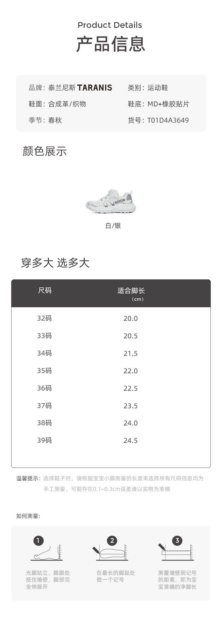 泰兰尼斯春款中大童经典百搭校园小白鞋运动鞋T01D4A3649