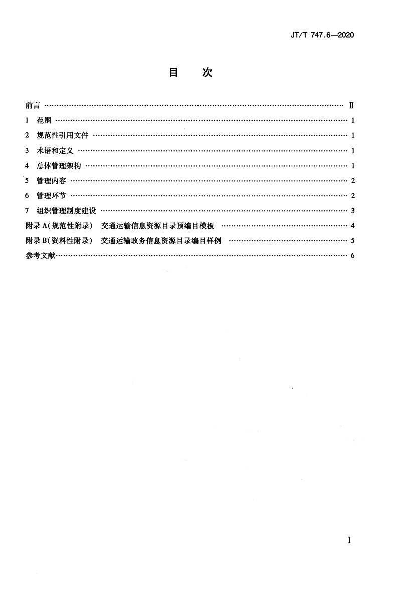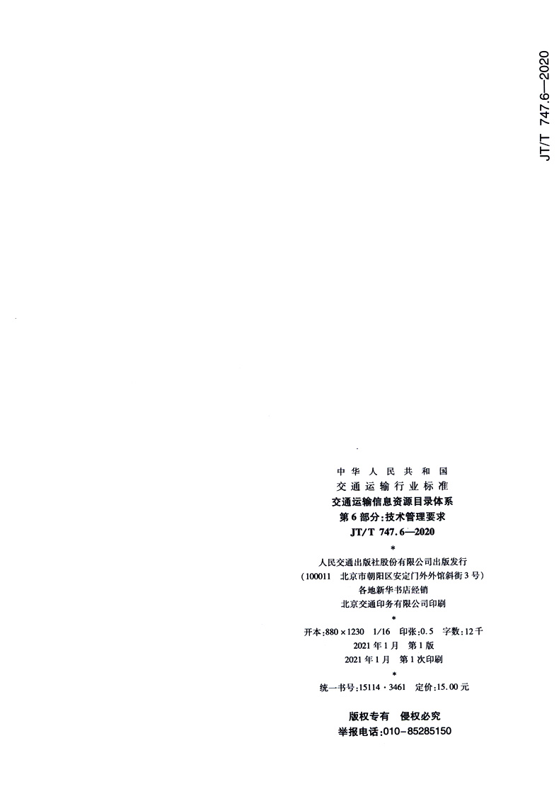 书名:交通运输信息资源目录体系 第6部分:技术管理要求(JT/T 747.6—2020)