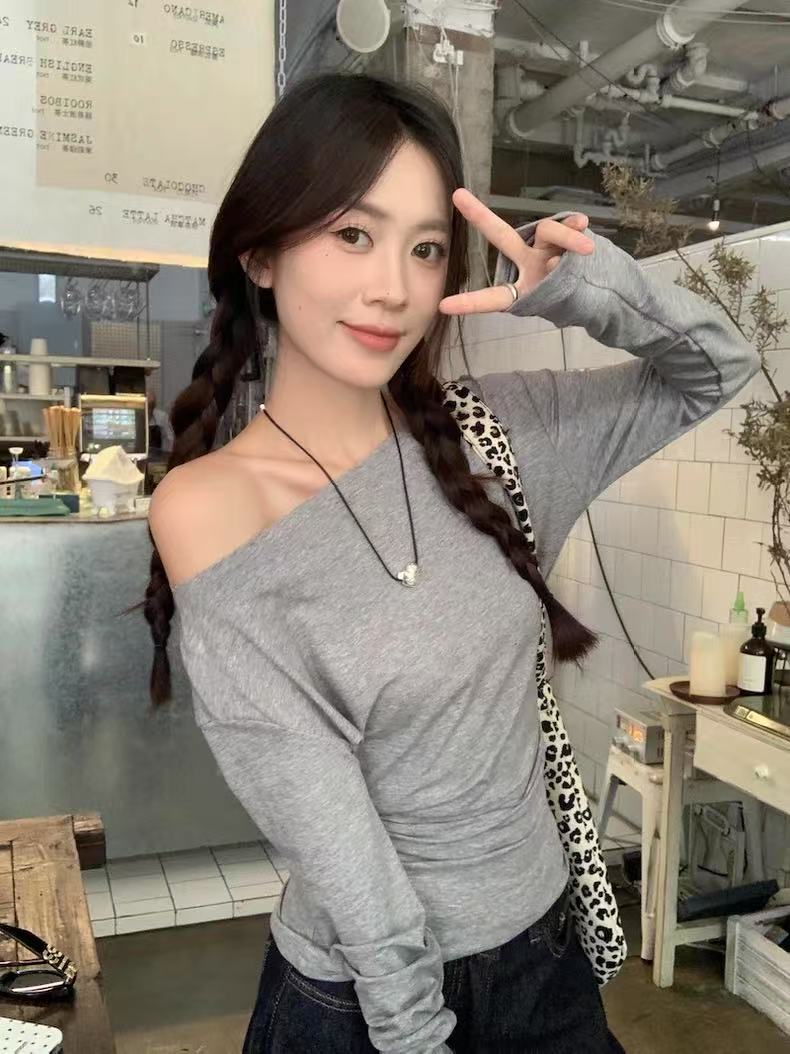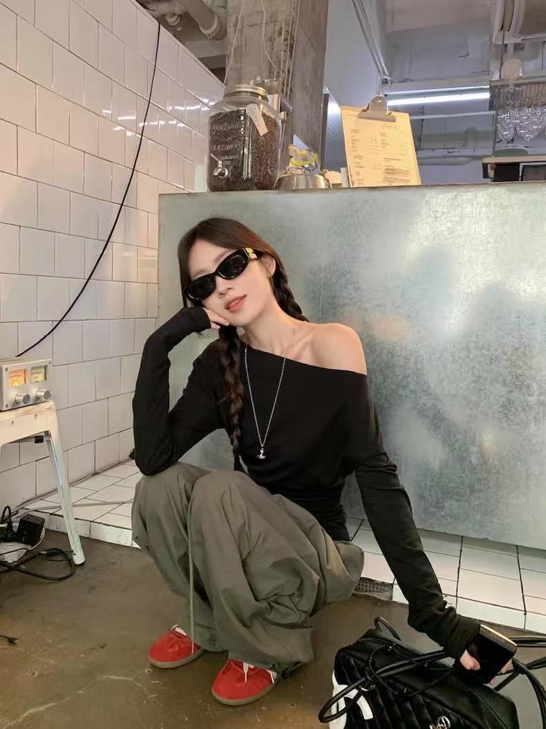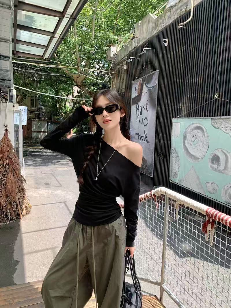 【GZ】无忧购韩系ins百搭休闲斜肩蝙蝠袖百搭上衣(配链条)8187(截单后3-5天发货)