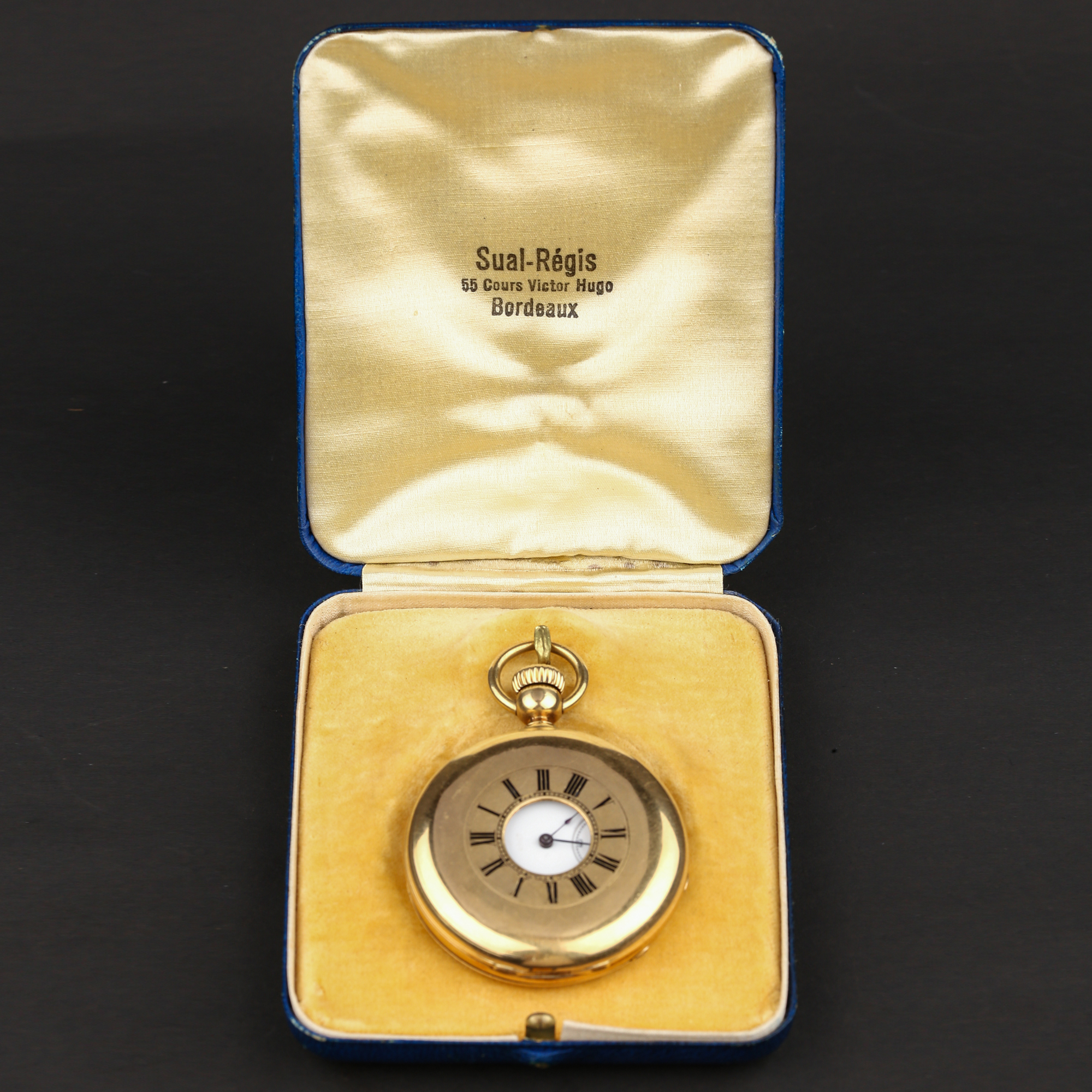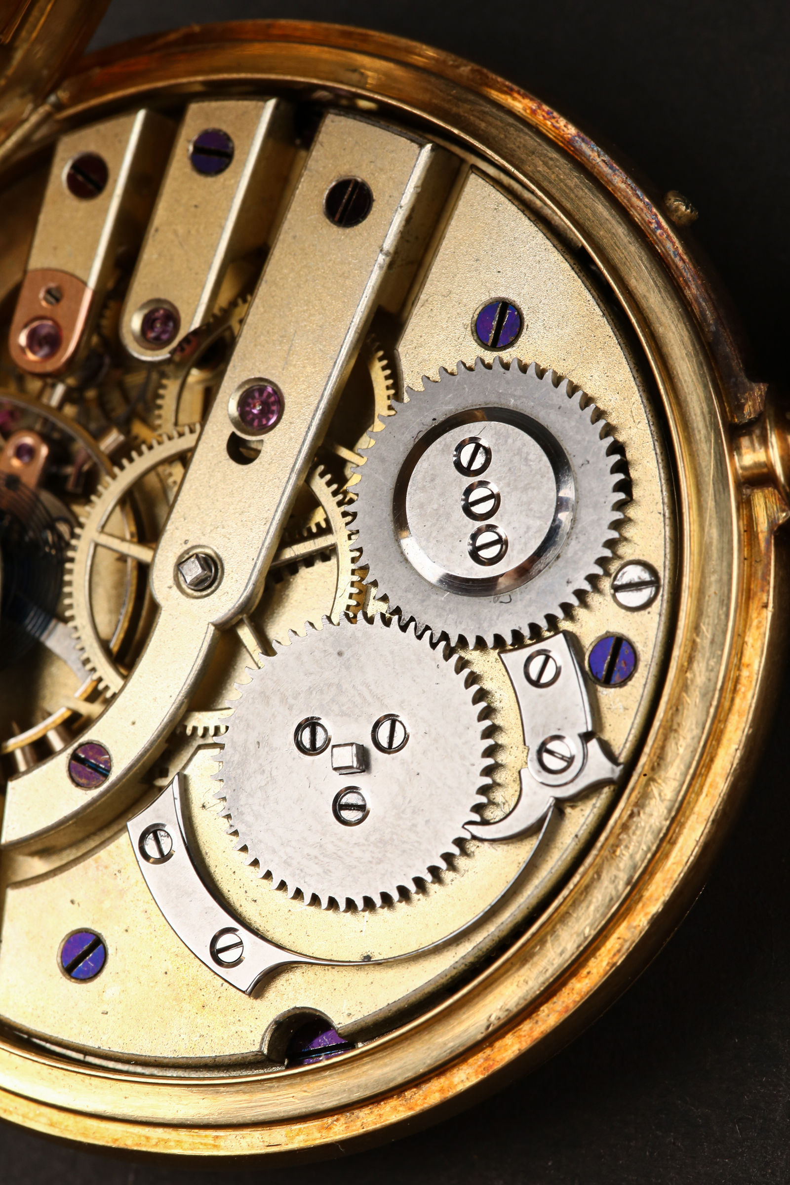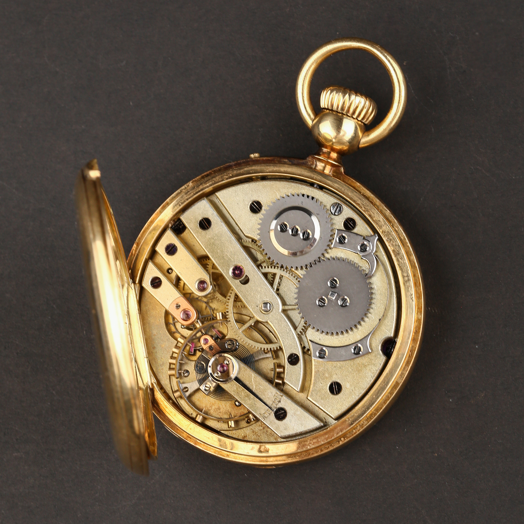 独角鹿西洋古董钟表瑞士宝矶半猎壳三开18K金雕花怀表珐琅彩钟面