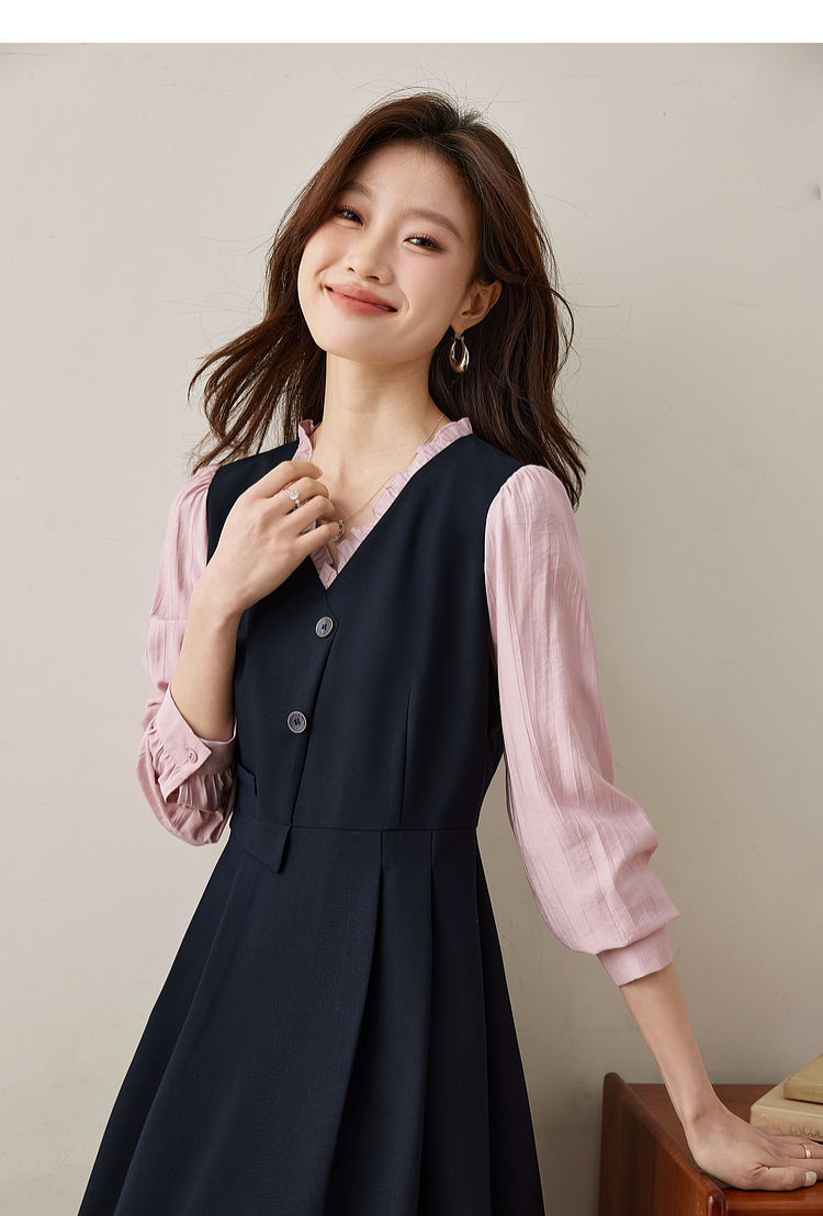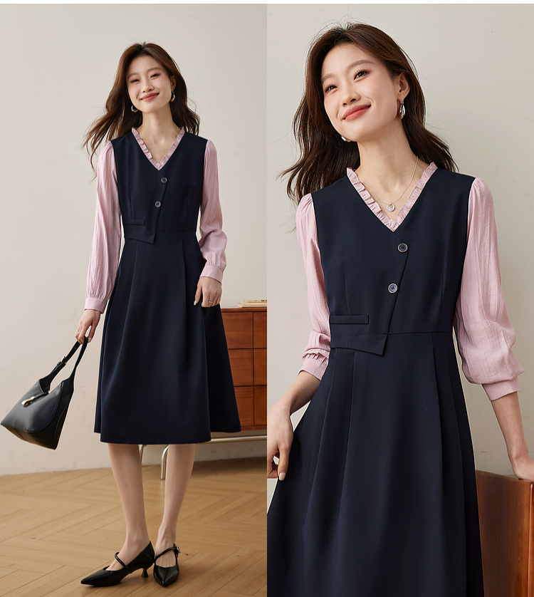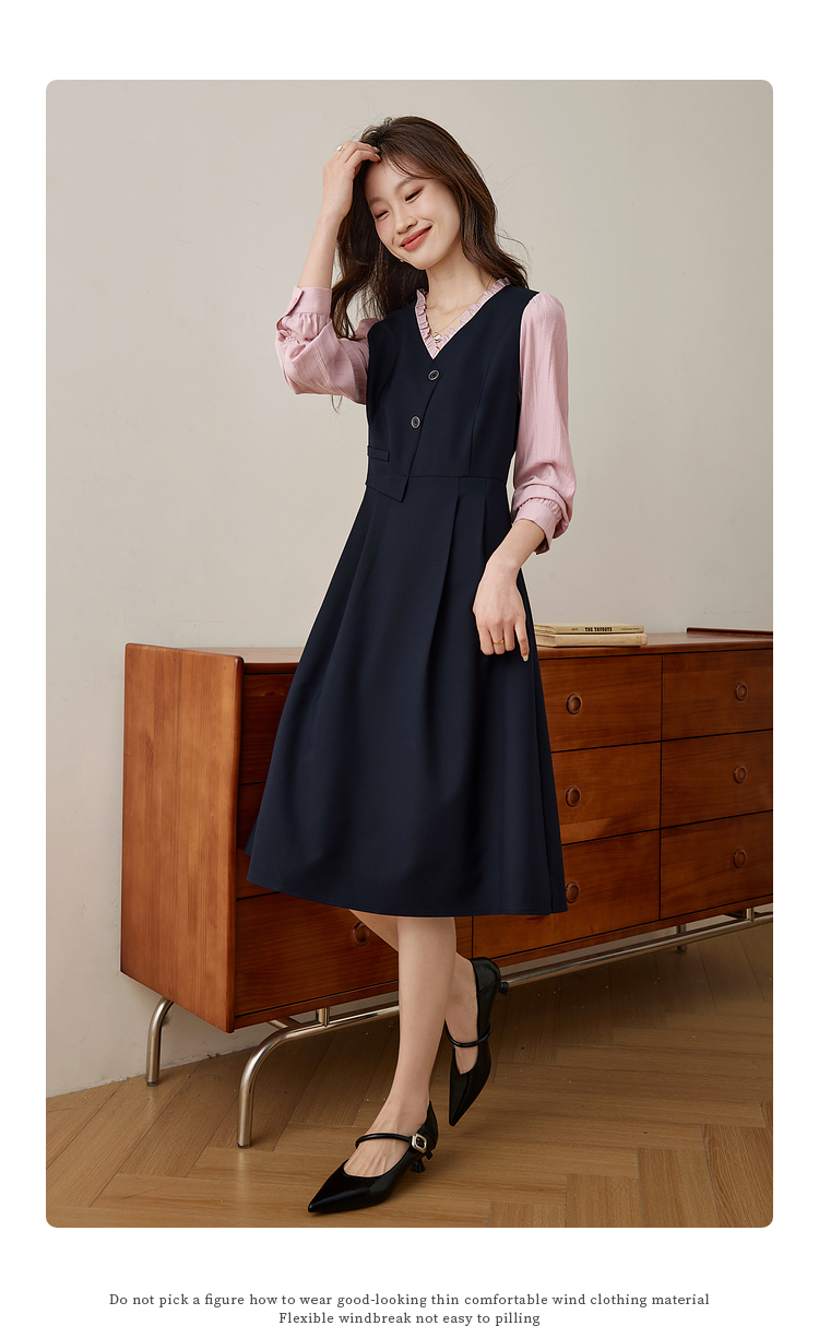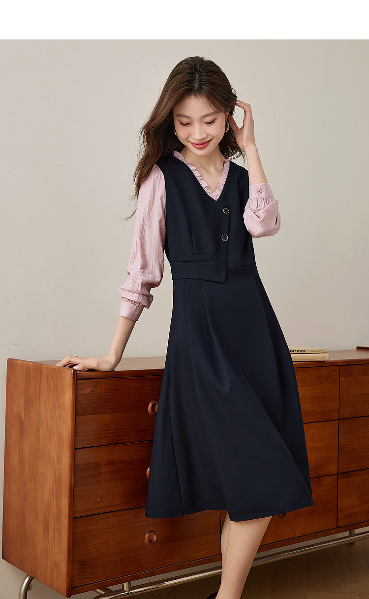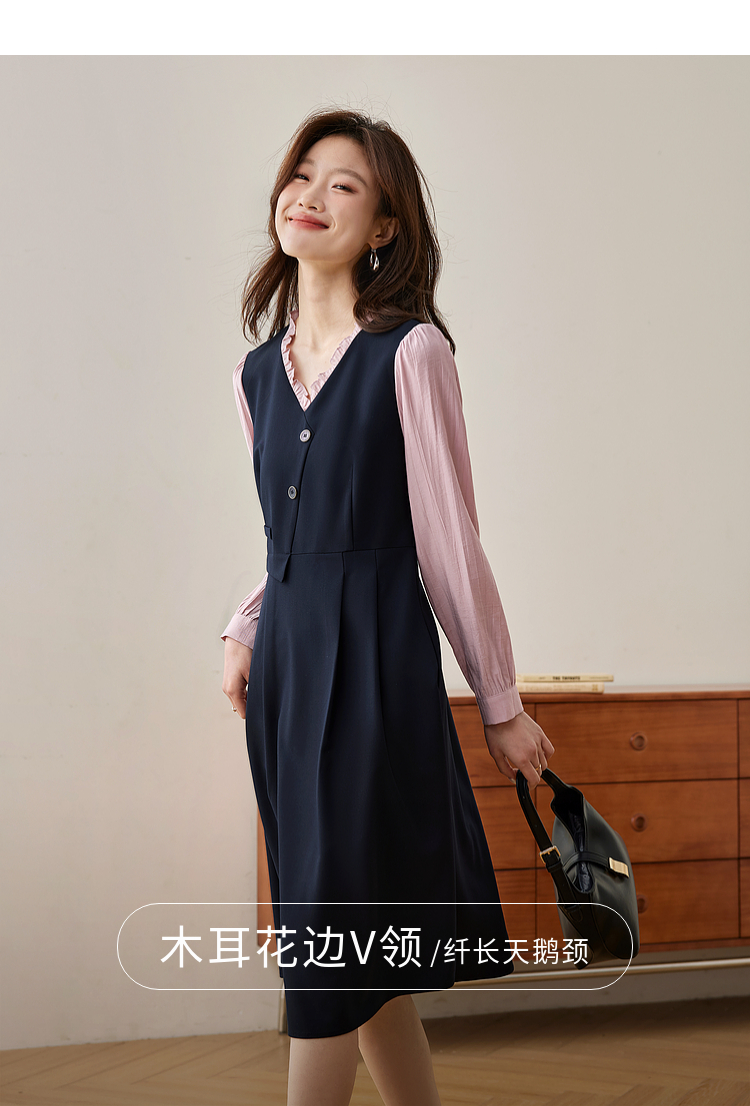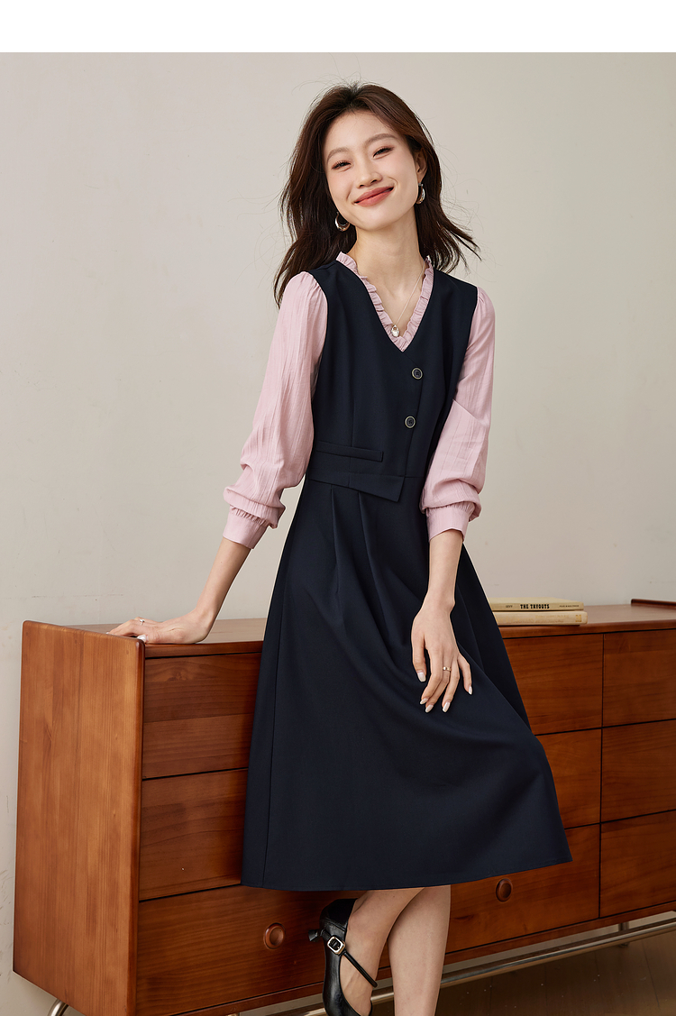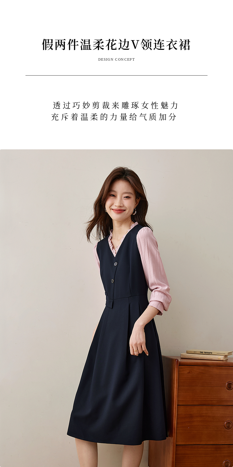 【五折购】熙世界假两件木耳边V领连衣裙长袖法式复古中长裙女2025春季新品