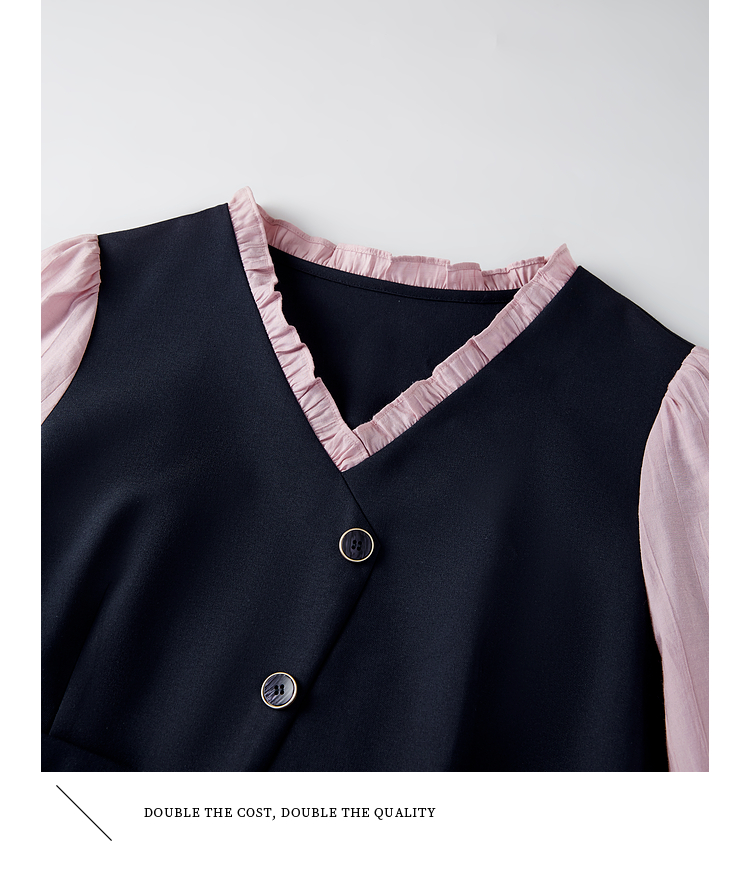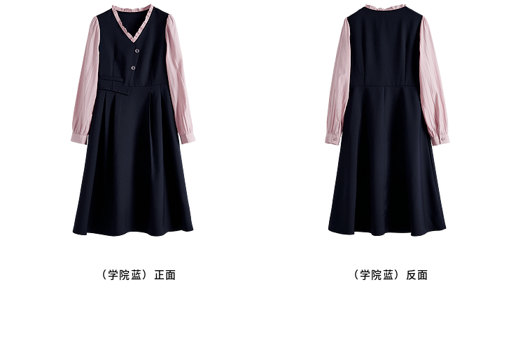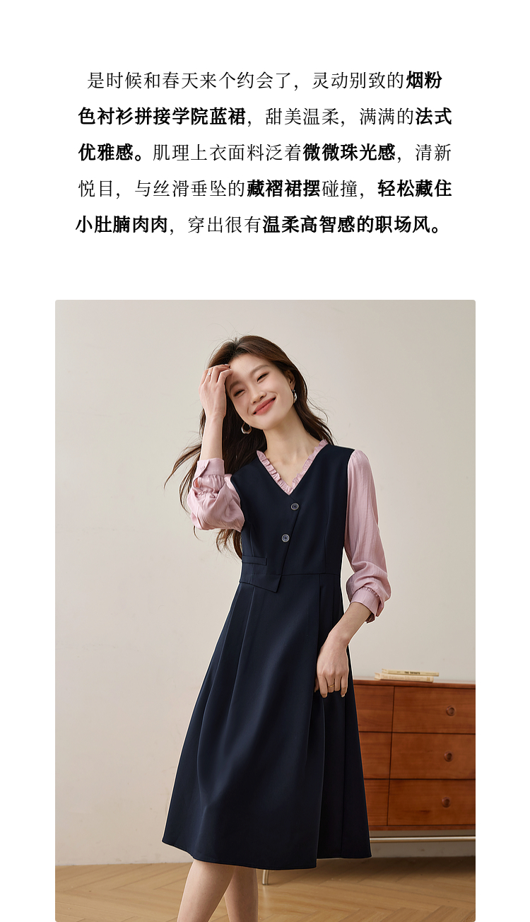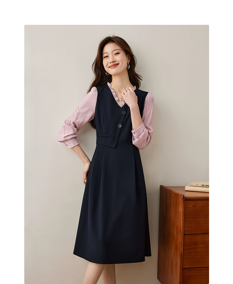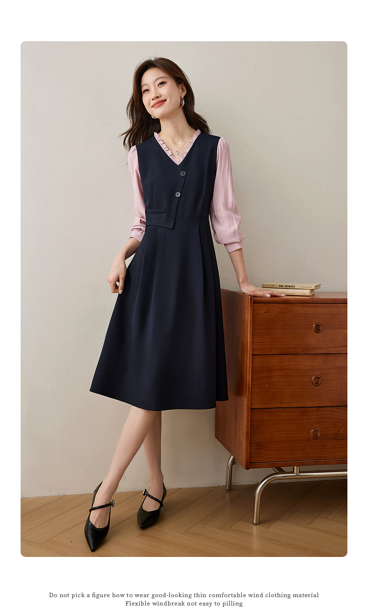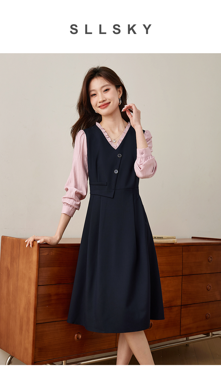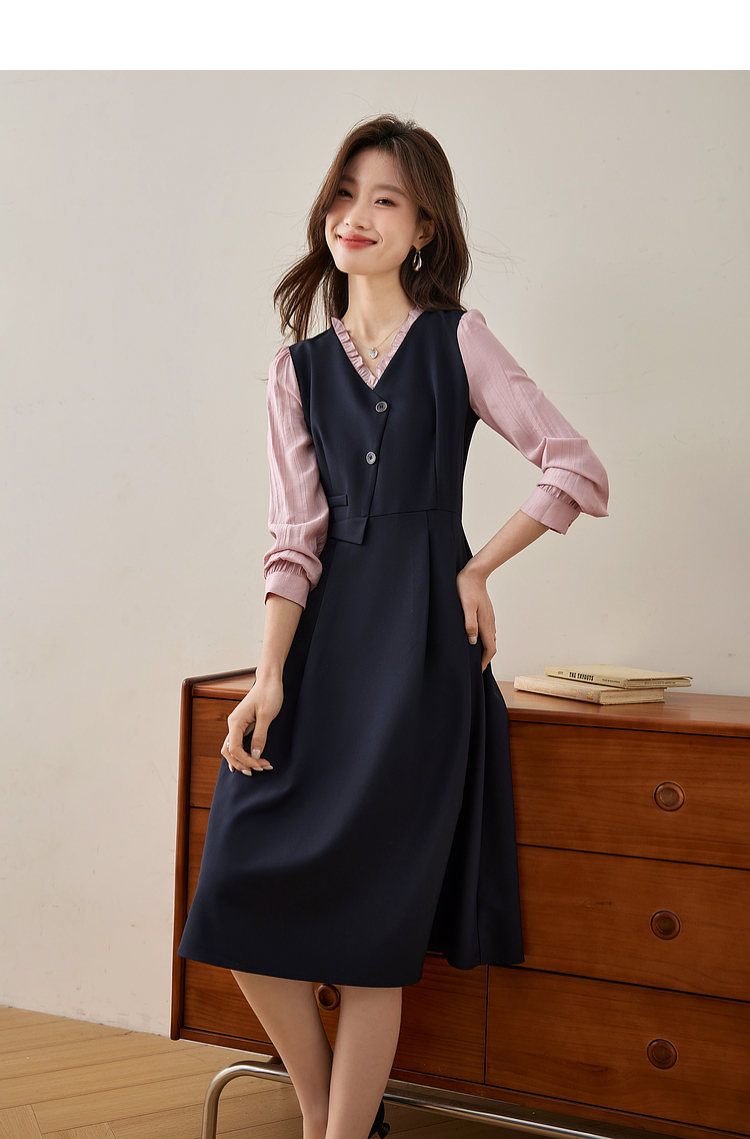 【五折购】熙世界假两件木耳边V领连衣裙长袖法式复古中长裙女2025春季新品