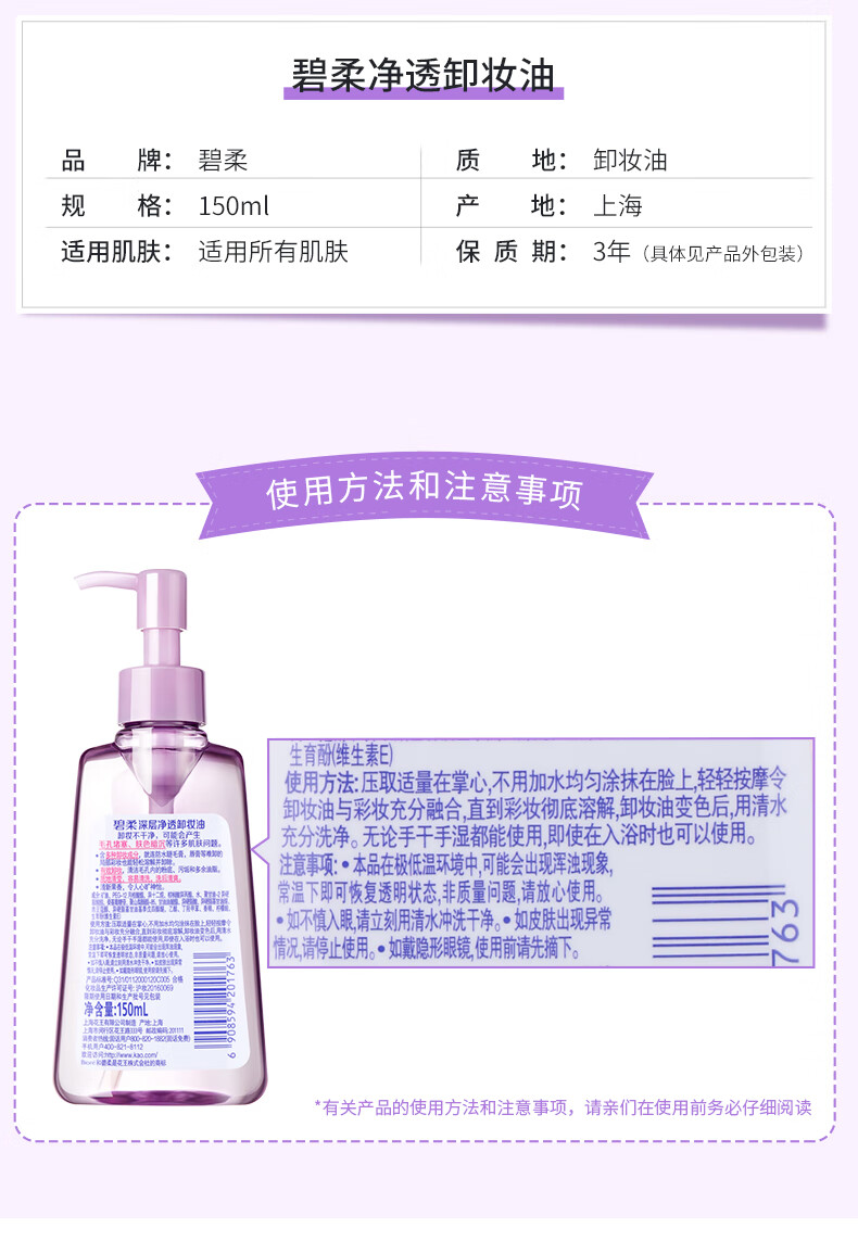 碧柔深层净透卸妆油 150ml 温和不刺激卸妆乳敏感肌可用不油腻