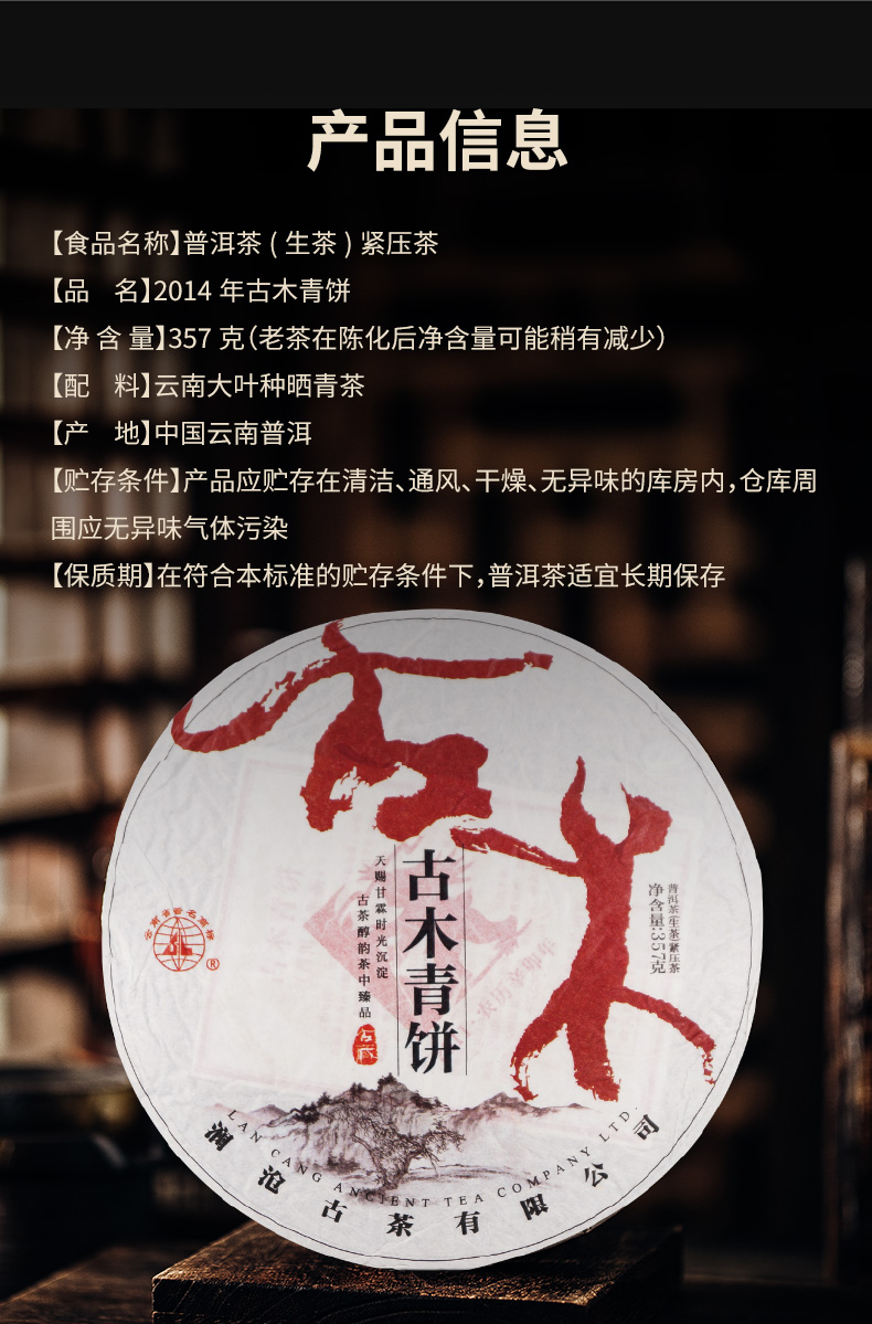 澜沧古茶2014年古木青饼普洱生茶大饼357g