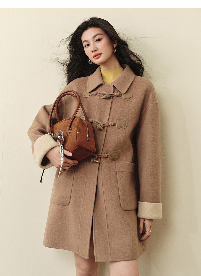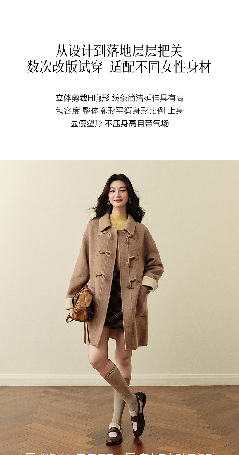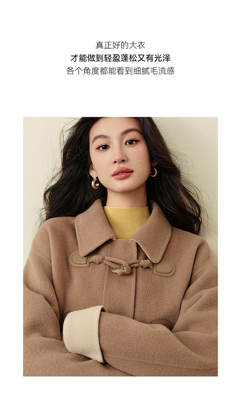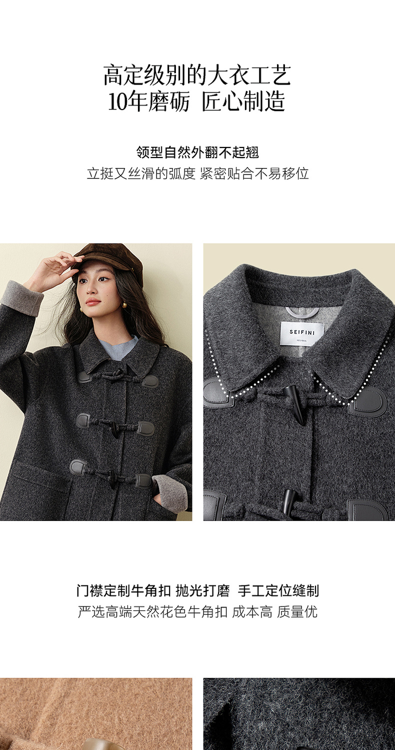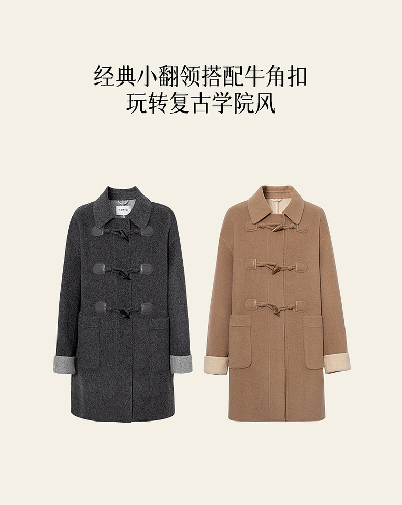 【严选】诗凡黎绵羊毛牛角扣小翻领毛呢外套2025秋新款学院风双面呢大衣女7G9170321