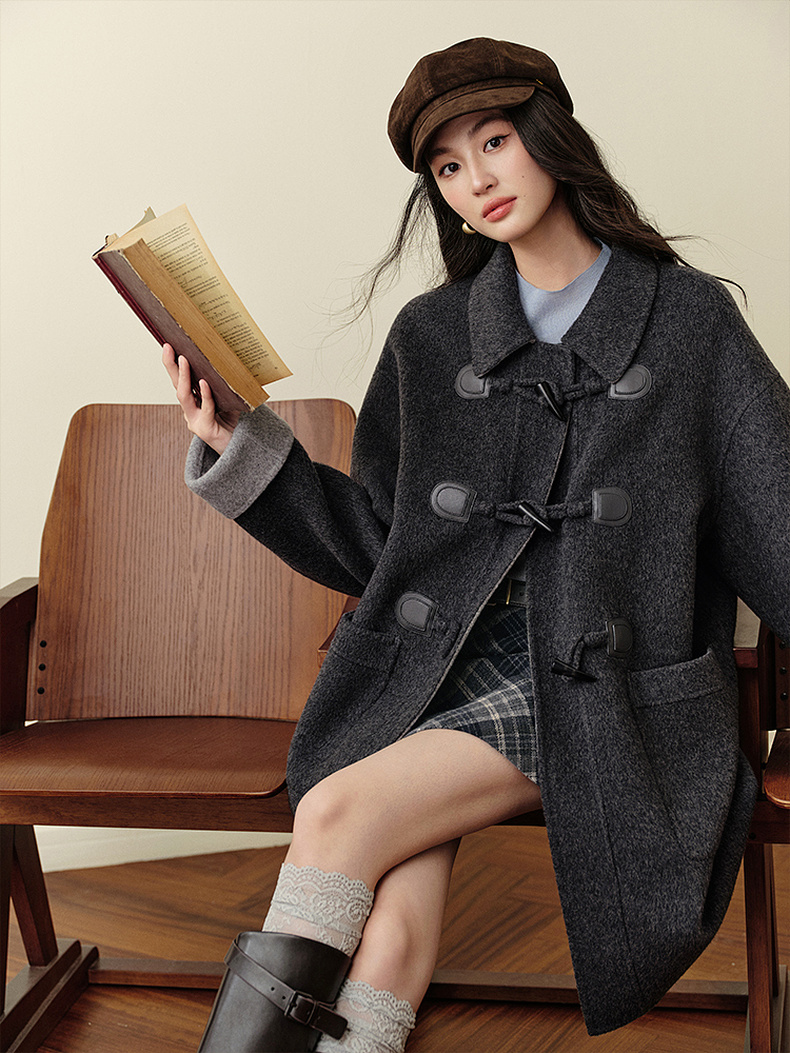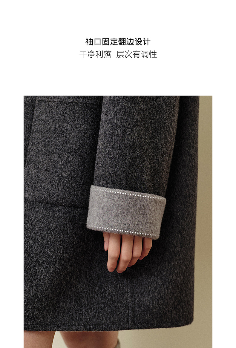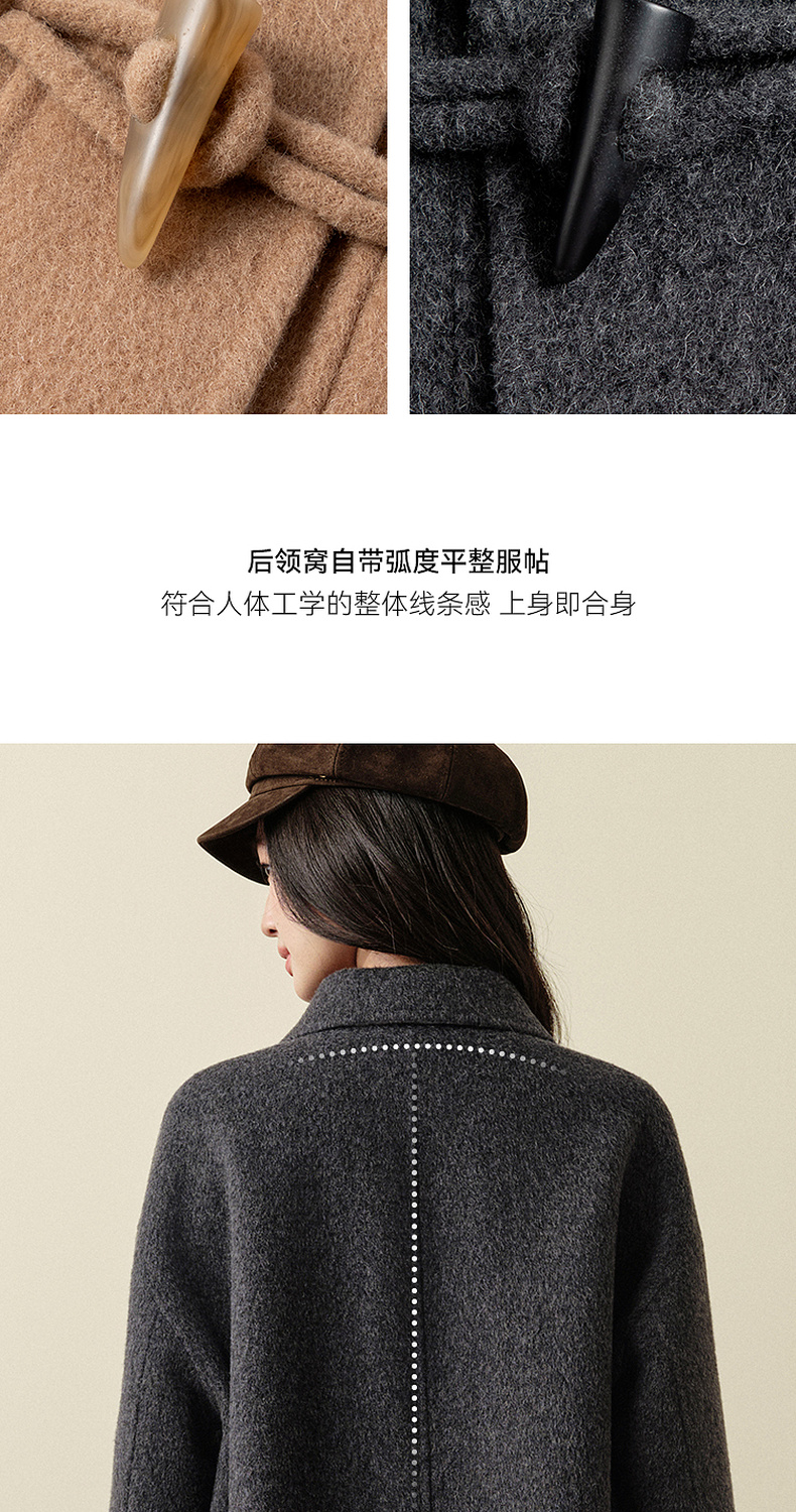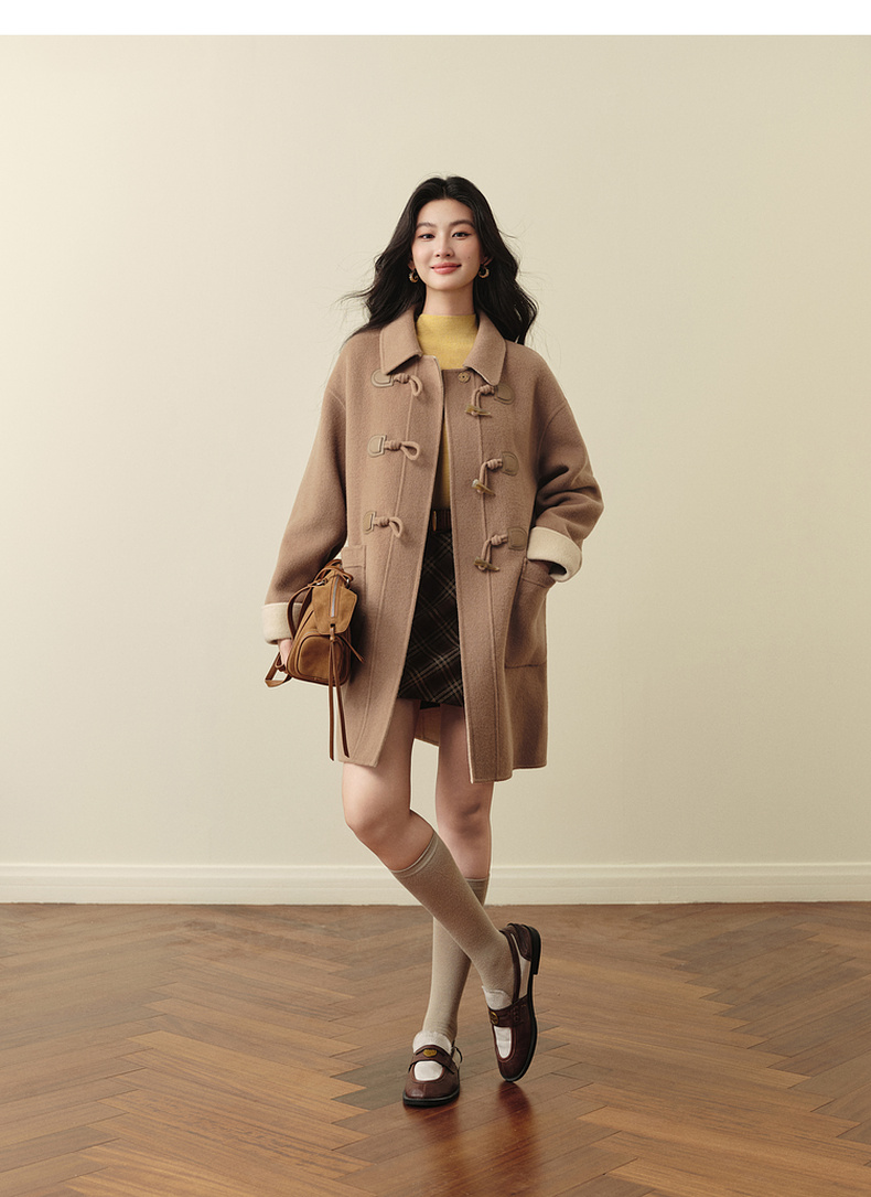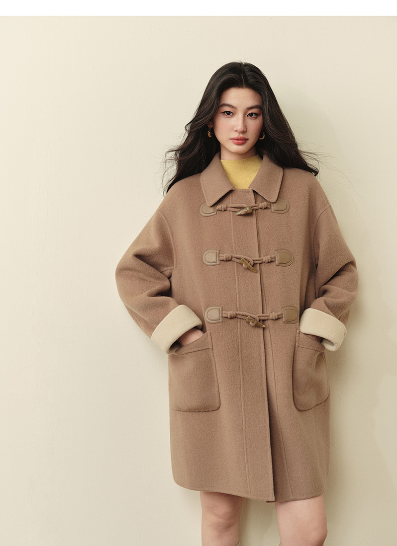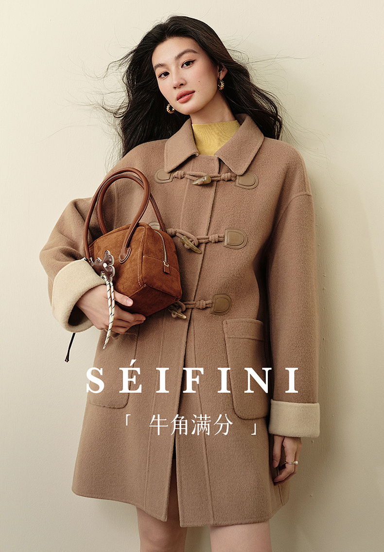 【严选】诗凡黎绵羊毛牛角扣小翻领毛呢外套2025秋新款学院风双面呢大衣女7G9170321