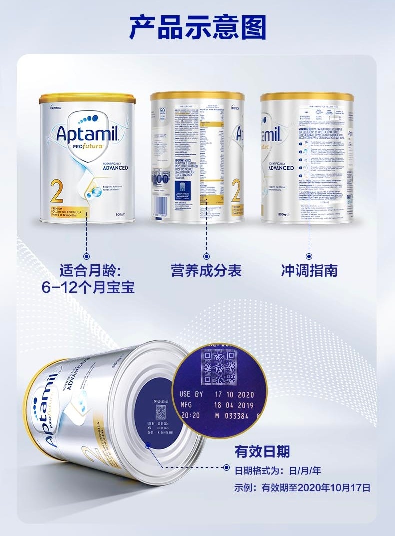【品牌直供新包装】澳洲Aptamil爱他美白金版较大婴儿配方奶粉 2段 6-12月 800g【新包装】