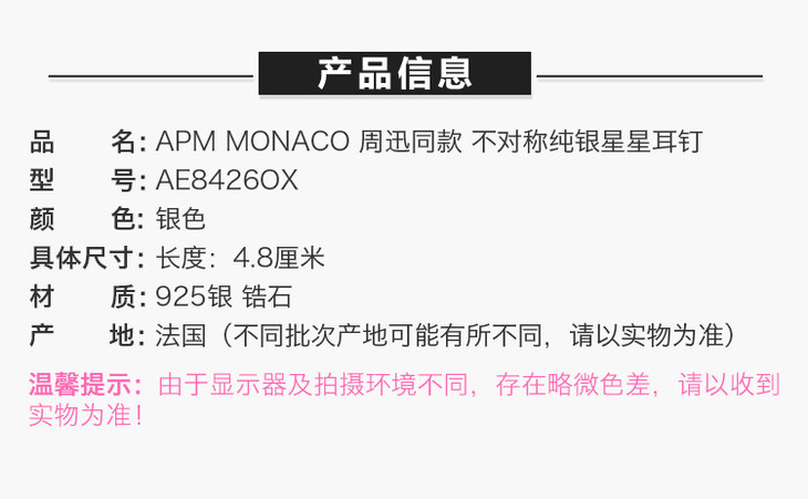 【一般贸易】【授权商品】APM MONACO 不对称纯银星星耳钉 AE8426OX