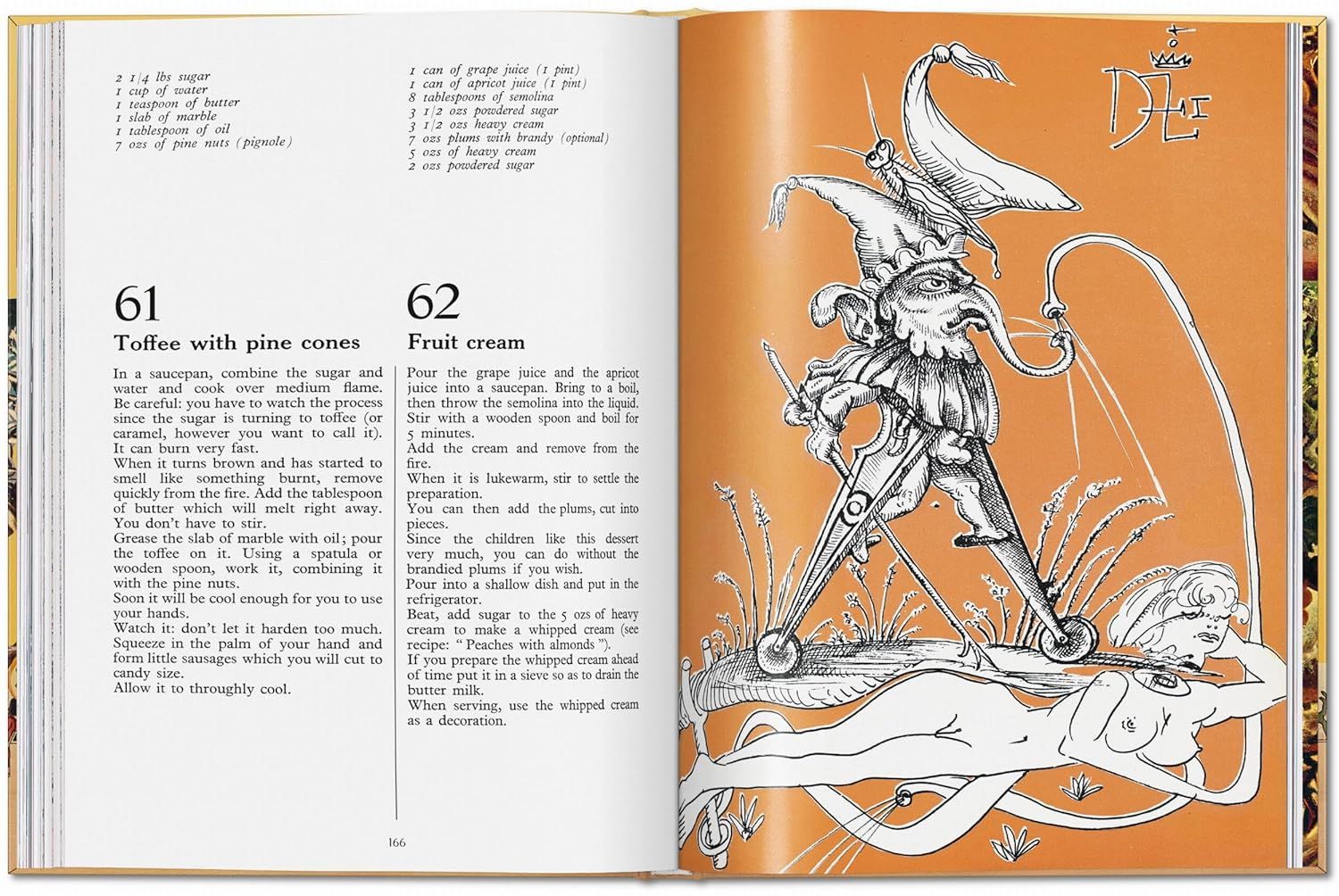 这本节选再版的食谱共分 12 章,收录了 78 道食谱,由达利特别绘制插图,并按膳食课程编排。插图和食谱中还附有达利对晚餐谈话等主题的思考: "下巴是我们掌握哲学知识的工具"。